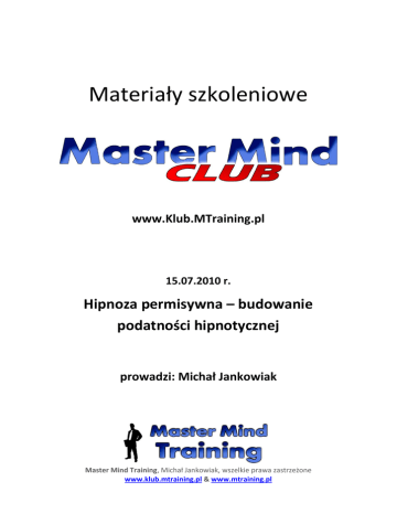 Materiały szkoleniowe www.Klub.MTraining.pl 15.07.2010 r. Hipnoza permisywna – budowanie podatności hipnotycznej prowadzi: Michał Jankowiak Master Mind Training, Michał Jankowiak, wszelkie prawa zastrzeżone www.klub.mtraining.pl & www.mtraining.pl 1. Podatnośd hipnotyczna to zdolnośd osoby hipnotyzowanej do spełniania sugestii hipnotyzera. Zależy ona m.in. od: - Preferowanego autorytetu klienta (wewnętrzny / zewnętrzny). - Dopasowania do mapy klienta (wartości, język, autorytet i metaprogramy). - Siły naszego autorytetu (zaufania i wiary klienta w naszą wiedzę i umiejętności). - Obycia klienta z transem hipnotycznym. - Poziomu bezpieczeostwa, które czuje klient podczas hipnozy. 2. Hipnoza ericksonowska – lingwistyka. a) Sugestie permisywne – ukryte polecenia: - możesz teraz rozluźnid się i poczud absolutnie błogo, - wiem, że potrafisz spojrzed na tą sprawę inaczej, - nie wiem, czy wiesz, ale to dopiero pierwszy stopieo transu, - jeśli chcesz, możesz pogłębiad swój relaks z każdym oddechem, b) Implikacje wyniku: - to, że teraz siedzisz sprawi, że rozluźnisz się dwukrotnie głębiej, niż podczas najcudowniejszego snu, - to, że postanowiłeś doświadczyd transu sprawi, że poznasz zupełnie nowe, fantastyczne emocje, - słuchasz mojego głosu i wchodzisz w trans, a to sprawi, że z łatwością rozwiążesz każdy problem, który mógłby stanąd Ci na drodze, c) Implikacje znaczenia: - to, że jesteś człowiekiem oznacza, że dasz sobie radę z każdym wyzwaniem, - to, że Twój oddech zwalnia znaczy, że wchodzisz w coraz głębszy trans, - widzisz przed sobą kolorowy obraz pięknego miejsca, a to znaczy, że możesz się uśmiechnąd i poczud absolutnie doskonale, d) Presupozycje świadomości (wiedzied, zdawad sobie sprawę, uświadamiad sobie, zauważad, widzied, czud): - czy uświadamiasz sobie, jak rozluźnione jest Twoje ciało? - nie wiem czy zdajesz sobie sprawę, jak przyjemny jest głęboki trans, - byd może już wiesz, że masz wszystkie zasoby, żeby rozwiązad swój problem, Master Mind Training, Michał Jankowiak, wszelkie prawa zastrzeżone www.klub.mtraining.pl & www.mtraining.pl e) Pozorny wybór: - możesz teraz rozluźnid się, albo poczud maksymalnie przyjemnie, - chcesz wejśd w trans teraz, czy dopiero po rozluźniających oddechach? - chcesz poznad hipnozę na siedząco, czy leżąc? f) Presupozycje czasu (kiedy, przed, podczas, w trakcie, gdy, zanim): - zanim rozluźnisz się w pełni, pomyśl o czymś bardzo przyjemnym, - gdy zobaczysz, że jesteś w pięknym ogrodzie, poczujesz dwukrotnie głębszy trans, - w trakcie, gdy się rozluźniasz, Twoja podświadomośd rozwiązuje problem tak, że gdy się obudzisz …, g) Presupozycje przymiotnikowe i przysłówkowe (szybko, bardzo, wiele, ciepło, przyjemnie, głęboko): - w jak głęboki trans wejdziesz dzisiaj? - jak szybko jesteś się w stanie zrelaksowad? - to niesamowite, jak wiele pomysłów możesz stworzyd w transie, h) Presupozycje liczebnikowe (pierwszy, ostatni, kolejny, następny): - jakie są Twoje pierwsze odczucia, gdy wchodzisz w trans? - możesz pomyśled o tym, jak głęboki trans osiągniesz następnym razem, - najpierw rozluźnij mięśnie swojej twarzy, Gdy poczujesz zmęczenie w oczach, pozwól swoim powiekom opaśd. Możesz teraz rozluźniad się i relaksowad, przyjemnie wchodząc w trans. Uspokajając swój oddech, uspokoisz swoje myśli. W swoim własnym tempie opadaj na skrzydłach transu. Oddychasz teraz coraz głębiej, a to znaczy, że głębiej wchodzisz w stan hipnozy. O czym pomyślisz najpierw, gdy już wejdziesz w trans? Na jakich emocjach najbardziej lubisz się koncentrowad? Jakie emocje odczuwad? Z każdym oddechem możesz relaksowad się spokojniej i przyjemniej. Koncentrujesz się teraz na swoim wewnętrznym świecie, a to znaczy, że rozwijasz swoją wyobraźnię. Odczuwając rosnące ciepło w Twoim ciele, możesz pomyśled także o ciepłych emocjach. Widząc to, co widzisz, możesz odczuwad... Zastanów się jak zareagujesz następnym razem, gdy... Zastanów się, czy uświadamiasz sobie, jak wiele zmieni się w Twoim życiu, gdy... Pomyśl jak szybko możesz dokonad zmian w swoim życiu. Zastanów się, jak przyjemnie poczujesz się następnym razem, gdy... Master Mind Training, Michał Jankowiak, wszelkie prawa zastrzeżone www.klub.mtraining.pl & www.mtraining.pl 3. Budowanie autorytetu. a) Przedstaw się, mówiąc: „Witaj, nazywam się xxx xxx i jestem hipnotyzerem. Czego chcesz się nauczyd dzisiaj? b) Podczas rozmowy wstępnej wydaj 3 ukryte polecenia i dopilnuj, żeby zostały wykonane (np. zamiana krzeseł, wygodna pozycja ciała, głęboki oddech, zamknięcie oczu. Używaj często sformułowao: „Powiedz mi…”, „Chciałbym żebyś…”, „Zrób dla mnie jedną rzecz, mianowicie…”). c) Podczas każdej sesji pogłębiaj trans i dostarczaj klientowi nowych wrażeo. d) W komunikacji z klientem bądź naturalny i zdecydowany. Zawsze pokazuj, że wiesz, jak prowadzid proces. e) Usiądź wyżej i w lepszym fotelu niż klient (na początku, potem możesz się wymienid). Master Mind Training, Michał Jankowiak, wszelkie prawa zastrzeżone www.klub.mtraining.pl & www.mtraining.pl