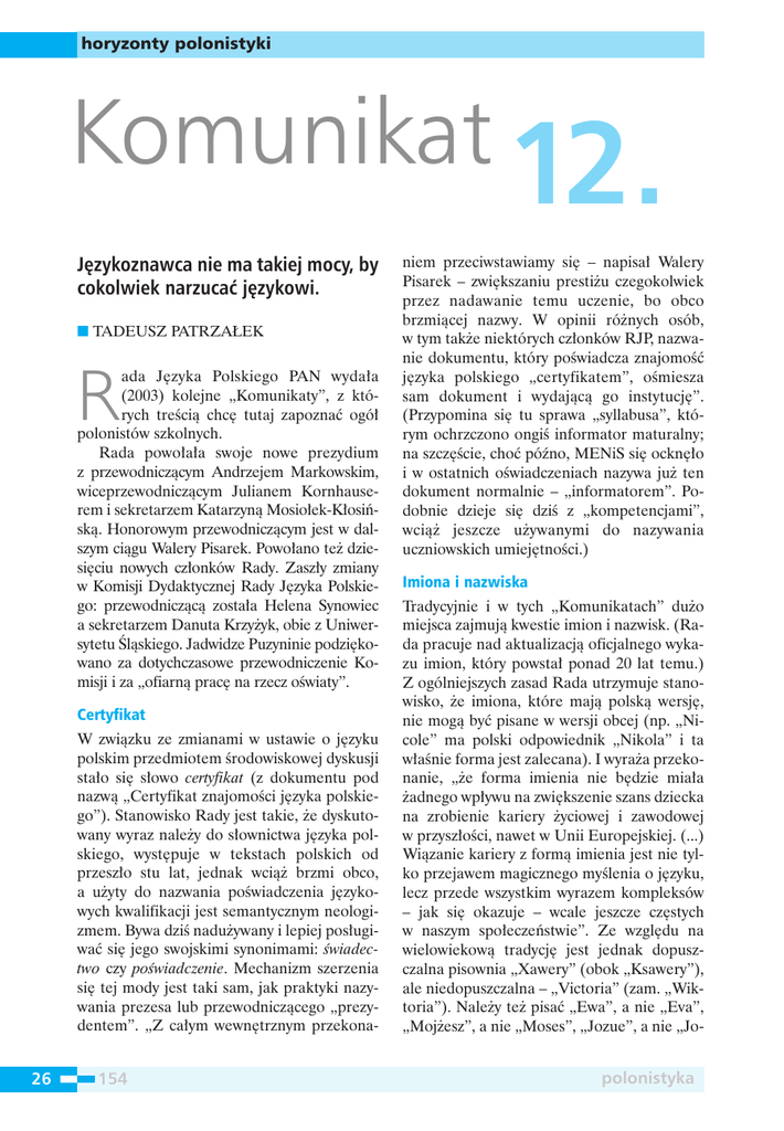 horyzonty polonistyki Komunikat 12. J´zykoznawca nie ma takiej mocy, by cokolwiek narzucaç j´zykowi. ■ TADEUSZ PATRZA¸EK R ada J´zyka Polskiego PAN wyda∏a (2003) kolejne „Komunikaty”, z których treÊcià chc´ tutaj zapoznaç ogó∏ polonistów szkolnych. Rada powo∏a∏a swoje nowe prezydium z przewodniczàcym Andrzejem Markowskim, wiceprzewodniczàcym Julianem Kornhauserem i sekretarzem Katarzynà Mosio∏ek-K∏osiƒskà. Honorowym przewodniczàcym jest w dalszym ciàgu Walery Pisarek. Powo∏ano te˝ dziesi´ciu nowych cz∏onków Rady. Zasz∏y zmiany w Komisji Dydaktycznej Rady J´zyka Polskiego: przewodniczàcà zosta∏a Helena Synowiec a sekretarzem Danuta Krzy˝yk, obie z Uniwersytetu Âlàskiego. Jadwidze Puzyninie podzi´kowano za dotychczasowe przewodniczenie Komisji i za „ofiarnà prac´ na rzecz oÊwiaty”. Certyfikat W zwiàzku ze zmianami w ustawie o j´zyku polskim przedmiotem Êrodowiskowej dyskusji sta∏o si´ s∏owo certyfikat (z dokumentu pod nazwà „Certyfikat znajomoÊci j´zyka polskiego”). Stanowisko Rady jest takie, ˝e dyskutowany wyraz nale˝y do s∏ownictwa j´zyka polskiego, wyst´puje w tekstach polskich od przesz∏o stu lat, jednak wcià˝ brzmi obco, a u˝yty do nazwania poÊwiadczenia j´zykowych kwalifikacji jest semantycznym neologizmem. Bywa dziÊ nadu˝ywany i lepiej pos∏ugiwaç si´ jego swojskimi synonimami: Êwiadectwo czy poÊwiadczenie. Mechanizm szerzenia si´ tej mody jest taki sam, jak praktyki nazywania prezesa lub przewodniczàcego „prezydentem”. „Z ca∏ym wewn´trznym przekona- 26 154 niem przeciwstawiamy si´ – napisa∏ Walery Pisarek – zwi´kszaniu presti˝u czegokolwiek przez nadawanie temu uczenie, bo obco brzmiàcej nazwy. W opinii ró˝nych osób, w tym tak˝e niektórych cz∏onków RJP, nazwanie dokumentu, który poÊwiadcza znajomoÊç j´zyka polskiego „certyfikatem”, oÊmiesza sam dokument i wydajàcà go instytucj´”. (Przypomina si´ tu sprawa „syllabusa”, którym ochrzczono ongiÊ informator maturalny; na szcz´Êcie, choç póêno, MENiS si´ ockn´∏o i w ostatnich oÊwiadczeniach nazywa ju˝ ten dokument normalnie – „informatorem”. Podobnie dzieje si´ dziÊ z „kompetencjami”, wcià˝ jeszcze u˝ywanymi do nazywania uczniowskich umiej´tnoÊci.) Imiona i nazwiska Tradycyjnie i w tych „Komunikatach” du˝o miejsca zajmujà kwestie imion i nazwisk. (Rada pracuje nad aktualizacjà oficjalnego wykazu imion, który powsta∏ ponad 20 lat temu.) Z ogólniejszych zasad Rada utrzymuje stanowisko, ˝e imiona, które majà polskà wersj´, nie mogà byç pisane w wersji obcej (np. „Nicole” ma polski odpowiednik „Nikola” i ta w∏aÊnie forma jest zalecana). I wyra˝a przekonanie, „˝e forma imienia nie b´dzie mia∏a ˝adnego wp∏ywu na zwi´kszenie szans dziecka na zrobienie kariery ˝yciowej i zawodowej w przysz∏oÊci, nawet w Unii Europejskiej. (...) Wiàzanie kariery z formà imienia jest nie tylko przejawem magicznego myÊlenia o j´zyku, lecz przede wszystkim wyrazem kompleksów – jak si´ okazuje – wcale jeszcze cz´stych w naszym spo∏eczeƒstwie”. Ze wzgl´du na wielowiekowà tradycj´ jest jednak dopuszczalna pisownia „Xawery” (obok „Ksawery”), ale niedopuszczalna – „Victoria” (zam. „Wiktoria”). Nale˝y te˝ pisaç „Ewa”, a nie „Eva”, „Moj˝esz”, a nie „Moses”, „Jozue”, a nie „Jo- polonistyka horyzonty polonistyki shua”. Przy okazji przypomniano ogólne wymagania stawiane imionom obywateli polskich: 1) przyswojenie, 2) oznaczanie p∏ci, 3) nieoÊmieszanie nosiciela, 4) nieto˝samoÊç z nazwami geograficznymi i pospolitymi, 5) nieodczuwanie charakteru zdrobnia∏ego, 6) zapis zgodny z polskà ortografià. Zatem: „Tola” i „Zula” nie sà ju˝ odczuwane jako zdrobnienia, mogà wi´c byç samodzielnymi imionami polskimi, ale nie mogà nimi byç: „Wiola”, „Mila” („Milla”), „Klimek” i „J´drek”, a tak˝e „Nel” (bohaterka Sienkiewiczowska by∏a Angielkà!). Po∏àczenia imion, np. „Anna Maria”, nale˝y traktowaç jako dwa imiona i pisaç bez ∏àcznika. „To, ˝e imiona pisane z ∏àcznikiem wyst´pujà w kulturach innych ni˝ nasza (np. francuskiej czy anglosaskiej), nie jest wystarczajàcym powodem do tego, by zwyczaj ten przenosiç do nas.” Obecnie nazwisko „Zamoyski” nosi w Polsce 66 osób, a nazwisko „Zamojski” – 2481 osób; obie te postaci graficzne nale˝y uznawaç za poprawne. K∏opotliwa odmiana Mo˝e te˝ warto powtórzyç troch´ innych opinii i zaleceƒ poprawnoÊciowych. Wyra˝enie public relation mo˝na stosowaç w oficjalnych nazwach, nie ma ono bowiem dok∏adnego odpowiednika polskiego, a zast´pujàce je czasami „doradztwo prasowe” jest du˝o mniej rozpowszechnione. Imi´ „Chone” mo˝e i powinno byç odmieniane, podobnie jak nazwiska, bo j´zyk polski jest fleksyjny. Tak˝e nazwiska zakoƒczone na „-e” i „-o”, a wi´c: „jad∏em ciastko u Bliklego”, „powiedzia∏ to ministrowi Handkemu”, „s∏uchali opery Moniuszki”, „id´ do paƒstwa Radtków”. K∏opoty sà z wo∏aczem, gdy˝ na ogó∏ nazwiska go nie majà. W ogóle nie mamy zwyczaju zwracania si´ do kogoÊ przy u˝yciu nazwiska, a szczególnie samego nazwiska, np. bez „pan”, „pani” czy tytu∏u, stopnia albo funkcji. Chocia˝ znamy historyczny wo∏acz równy mianownikowi: „Marsz, marsz Dàbrowski”, to przecie˝ Sienkiewicz napisa∏: „Panie pu∏kowniku Wo∏odyjowski!” Za to majà swoje wo∏acze imiona, dlatego w ka˝dej sytuacji lepiej jest zawo∏aç „Janku” ni˝ „Janek”, a to drugie uchodzi je- 3/2004 dynie w bardzo nieoficjalnych kontaktach. Nazwy obcych miast, jeÊli majà swoje spolszczenia i tradycj´ ich u˝ycia za sobà, to nale˝y je stosowaç, a wi´c „Pary˝”, a nie „Paris”, „Monachium”, a nie „München”, „Mediolan”, a nie „Milano”, nawet „Akwizgran”, a nie „Aachen”; te dru