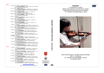 DVD-1 C. Tessarini - Sonata F-dur, cz. III i IV wyk. Patrycja NIEZGODA – wiolonczela, kl. III wydz. instr. naucz. Mirosława Krośniak, fortepian: Dominik Zabłocki A. Corelli - La Folia wyk. Adrianna MOŁOCZNIK – altówka, kl. III wydz. instr. naucz. Beata Toczek, fortepian: Janusz Dąbrowski A. Capuzzi - Koncert F-dur, cz. I wyk. Adam HANKUS - kontrabas, kl. I wydz. instr.. naucz. Tomasz Borski, fortepian: Janusz Dąbrowski A. Dworzak - Sonatina G-dur, cz. I wyk. Agnieszka DZINDZIO – skrzypce, kl. III wydz. instr. naucz. Renata Gajownik, fortepian: Elżbieta Gorączko-Krawiec J.B. Vanhal - Sonata Es-dur, cz. I wyk. Dorota GĄDEK – altówka, kl. V wydz. instr. naucz. Beata Toczek, fortepian: Janusz Dąbrowski F.M. Veraccini - Sonata e-moll, cz.I wyk. Daria HAWRON – skrzypce, kl. IV wydz. instr. naucz. Renata Gajwnik, fortepian: Elżbieta Gorączko- Krawiec www.psm.nysa.com.pl Nagranie DVD: Beata Toczek, Janusz Dąbrowski KONCERT w wykonaniu uczniów sekcji instrumentów smyczkowych i gitary Państwowej Szkoły Muzycznej II stopnia im. Witolda Lutosławskiego w Nysie KONCERT UCZNIÓW PSM NYSA - 19.01.2011 DVD-2 opr. Górski, Powroźniak - „Idziemy do szkoły” wyk. Jakub MACIOSZEK – skrzypce, klasa I cyklu 6-letniego naucz. i fortepian: Krzysztof Sala opr. T. Mazur - „Północ już była” wyk. Małgorzata BIENIAS – wiolonczela, kl. II cyklu 6-let. naucz. Mirosława Krośniak, fortepian: Aleksandra Brzeźnicka Melodia ludowa - Piosenka ukraińska wyk. Agnieszka PLUTA – skrzypce, kl. I cyklu 6-let. naucz. i fortepian: Krzysztof Sala Melodia ludowa - Piosenka ukraińska - Piosenka francuska wyk. Wiktor ORZESZKO – skrzypce, kl. I cyklu 6-let. naucz. i fortepian: Krzysztof Sala Anonim - Koci blues wyk. Karol BEREŹNICKI – gitara, kl. II cyklu 4-let. naucz. Jan Kędziora Melodia ludowa - Piosenka ukraińska wyk. Krzysztof MESJASZ – skrzypce, kl. I cyklu 6-let. naucz. i fortepian: Krzysztof Sala Górski, Powroźniak - Pieśń Filaretów wyk. Nikola KOWALSKA – skrzypce, kl. II cyklu 6-let. naucz. i fortepian: Krzysztof Sala I. Wołczkow - Toccata wyk. Wojciech JANCZAR – wiolonczela, kl. II cyklu 6-let. naucz. Monika Moczulska, fortepian: Elżbieta Gorączko-Krawiec Stasica, Garścia - Wariacje „Panie Janie” wyk. Szymon HAJDUK – skrzypce, kl. III cyklu 6-let. naucz. Krzysztof Sala, fortepian: Elżbieta Gorączko-Krawiec O. Rieding - Koncert G-dur, cz. I wyk. Jan RATUSZNIAK – skrzypce, kl. III cyklu 6-let. naucz. Krzysztof Sala, fortepian: Elżbieta Gorączko-Krawiec A. Vivaldi - Koncert a-moll, cz. I wyk. Karolina KONIK – skrzypce, kl. IV cyklu 6-let. naucz.: Krzysztof Sala, fortepian: Elżbieta Gorączko-Krawiec J.B. Accolay - Concertino a- moll H. Clebanoff - Milionerzy wyk. Kinga JANCZAR – skrzypce, kl. IV cyklu 6-let. naucz. Janusz Gajownik, fortepian: Elżbieta Gorączko-Krawiec H. Eccles - Sonata g-moll, cz. I i II wyk. Mateusz MŁYŃCZAK - kontrabas kl. I wydz. instr. naucz.: Tomasz Borski, fortepian: Janusz Dąbrowski W.A. Mozart - Sonata G-dur, cz. I wyk. Barbara RUPNIEWSKA – skrzypce, kl. II wydz. instr. naucz. Renata Gajownik, fortepian: Elżbieta Gorączko-Krawiec A. Dworzak - Sonatina G-dur, cz. I wyk. Aleksandra DOSKOCZ – skrzypce, kl. III wydz. instr. naucz. Krzysztof Sala, fortepian: Elżbieta Gorączko-Krawiec Sala Koncertowa im. Jerzego Kozarzewskiego PSM I i II stopnia im. Witolda Lutosławskiego w Nysie 19 stycznia 2011