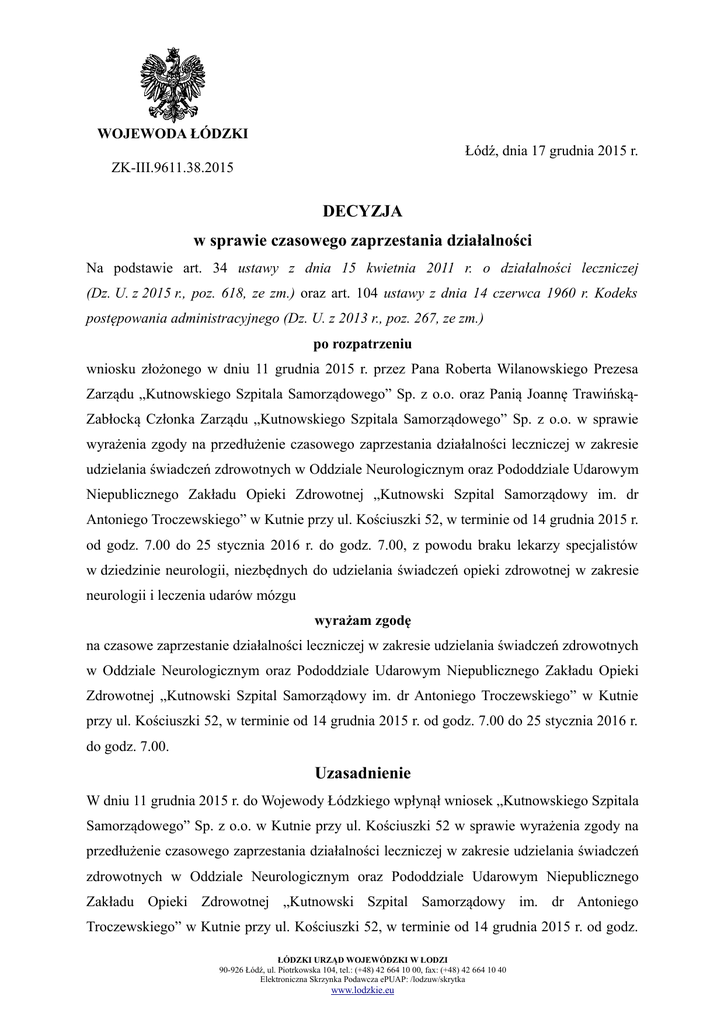 WOJEWODA ŁÓDZKI Łódź, dnia 17 grudnia 2015 r. ZK-III.9611.38.2015 DECYZJA w sprawie czasowego zaprzestania działalności Na podstawie art. 34 ustawy z dnia 15 kwietnia 2011 r. o działalności leczniczej (Dz. U. z 2015 r., poz. 618, ze zm.) oraz art. 104 ustawy z dnia 14 czerwca 1960 r. Kodeks postępowania administracyjnego (Dz. U. z 2013 r., poz. 267, ze zm.) po rozpatrzeniu wniosku złożonego w dniu 11 grudnia 2015 r. przez Pana Roberta Wilanowskiego Prezesa Zarządu „Kutnowskiego Szpitala Samorządowego” Sp. z o.o. oraz Panią Joannę TrawińskąZabłocką Członka Zarządu „Kutnowskiego Szpitala Samorządowego” Sp. z o.o. w sprawie wyrażenia zgody na przedłużenie czasowego zaprzestania działalności leczniczej w zakresie udzielania świadczeń zdrowotnych w Oddziale Neurologicznym oraz Pododdziale Udarowym Niepublicznego Zakładu Opieki Zdrowotnej „Kutnowski Szpital Samorządowy im. dr Antoniego Troczewskiego” w Kutnie przy ul. Kościuszki 52, w terminie od 14 grudnia 2015 r. od godz. 7.00 do 25 stycznia 2016 r. do godz. 7.00, z powodu braku lekarzy specjalistów w dziedzinie neurologii, niezbędnych do udzielania świadczeń opieki zdrowotnej w zakresie neurologii i leczenia udarów mózgu wyrażam zgodę na czasowe zaprzestanie działalności leczniczej w zakresie udzielania świadczeń zdrowotnych w Oddziale Neurologicznym oraz Pododdziale Udarowym Niepublicznego Zakładu Opieki Zdrowotnej „Kutnowski Szpital Samorządowy im. dr Antoniego Troczewskiego” w Kutnie przy ul. Kościuszki 52, w terminie od 14 grudnia 2015 r. od godz. 7.00 do 25 stycznia 2016 r. do godz. 7.00. Uzasadnienie W dniu 11 grudnia 2015 r. do Wojewody Łódzkiego wpłynął wniosek „Kutnowskiego Szpitala Samorządowego” Sp. z o.o. w Kutnie przy ul. Kościuszki 52 w sprawie wyrażenia zgody na przedłużenie czasowego zaprzestania działalności leczniczej w zakresie udzielania świadczeń zdrowotnych w Oddziale Neurologicznym oraz Pododdziale Udarowym Niepublicznego Zakładu Opieki Zdrowotnej „Kutnowski Szpital Samorządowy im. dr Antoniego Troczewskiego” w Kutnie przy ul. Kościuszki 52, w terminie od 14 grudnia 2015 r. od godz. ŁÓDZKI URZĄD WOJEWÓDZKI W ŁODZI 90-926 Łódź, ul. Piotrkowska 104, tel.: (+48) 42 664 10 00, fax: (+48) 42 664 10 40 Elektroniczna Skrzynka Podawcza ePUAP: /lodzuw/skrytka www.lodzkie.eu 7.00 do 25 stycznia 2016 r. do godz. 7.00. Jako uzasadnienie wnioskodawca podał, iż przyczyna przedłużenia czasowego zaprzestania działalności leczniczej spowodowana jest brakiem lekarzy specjalistów w dziedzinie neurologii, którzy są niezbędni do udzielania świadczeń opieki zdrowotnej w zakresie neurologii i leczenia udarów mózgu. Rozpatrując przedłożony wniosek należy zauważyć, iż zgodnie z przepisem art. 34 ust. 1 ustawy z dnia 15 kwietnia 2011 roku o działalności leczniczej (Dz. U. z 2015 r. poz. 618, ze zm.), podmiot leczniczy wykonujący działalność leczniczą w rodzaju stacjonarne i całodobowe świadczenia zdrowotne może, w zakresie świadczeń finansowanych ze środków publicznych, na okres nieprzekraczający 6 miesięcy, zaprzestać działalności leczniczej: całkowicie lub częściowo, w zakresie jednej lub więcej jednostek lub komórek organizacyjnych przedsiębiorstwa tego podmiotu związanych bezpośrednio z udzielaniem tych świadczeń. Na podstawie art. 34 ust. 3 i 5 cytowanej ustawy o działalności leczniczej, kierownik podmiotu leczniczego występuje do wojewody z wnioskiem o udzielenie zgody, zawierającym określenie przyczyny, proponowany okres oraz zakres zaprzestania działalności. Czasowe zaprzestanie działalności wymaga zgody wojewody, stosownie do treści zapisu art. 34 ust. 2 ww. ustawy. Jednocześnie, zgodnie z przepisem art. 34 ust. 6 cytowanej ustawy o działalności leczniczej, wojewoda przed wyrażeniem zgody zasięga opinii dyrektora właściwego oddziału wojewódzkiego Narodowego Funduszu Zdrowia. Niewydanie opinii w terminie 7 dni jest równoznaczne z wydaniem opinii pozytywnej. Wojewoda wydaje zgodę albo odmawia jej wydania, w drodze decyzji administracyjnej, w terminie 30 dni od dnia złożenia wniosku, stosownie do treści art. 34 ust. 7 cytowanej ustawy. Wniosek spełniał warunki określone przepisami prawa - art. 34 ustawy o działalności leczniczej (Dz. U. z 2015 r., poz. 618, ze zm.). W ramach wszczętego postępowania Wojewoda Łódzki zasięgnął opinii Dyrektora Łódzkiego Oddziału Wojewódzkiego Narodowego Funduszu Zdrowia oraz Konsultanta Wojewódzkiego w dziedzinie neurologii. Łódzki Oddział Wojewódzki Narodowego Funduszu Zdrowia pismem z dnia 16 grudnia 2015 r., znak: WŚOZ.I.425.428.2015 wyraził pozytywną opinię w tym zakresie. W opinii Konsultanta Wojewódzkiego w dziedzinie neurologii, z dnia 15 grudnia 2015 r., brak zespołu lekarzy specjalistów w dziedzinie neurologii w Kutnowskim Szpitalu Samorządowym Sp. z o.o., pomimo zakończenia przedłużających się prac remontowych, obecnie uniemożliwia udzielanie świadczeń opieki zdrowotnej w zakresie neurologii i leczenia udarów mózgu. Istnieje pilna konieczność uruchomienia dla północnego obszaru województwa łódzkiego ośrodka świadczącego procedury w zakresie neurologii i leczenie udarów. Należy mieć na uwadze również, że czasowe zaprzestanie działalności leczniczej nie może przekroczyć ustawowego terminu. Wojewoda Łódzki decyzją z dnia 9 listopada 2015 r., znak: ZK-III.9611.34.2015 wyraził zgodę na przedłużenie czasowego zaprzestania działalności leczniczej Oddziału Neurologicznego oraz Pododdziału Udarowego Niepublicznego Zakładu Opieki Zdrowotnej „Kutnowski Szpital Samorządowy im. dr Antoniego Troczewskiego” w Kutnie, będącego przedsiębiorstwem podmiotu leczniczego: „Kutnowski Szpital Samorządowy” Sp. z o.o. w terminie od 9 listopada 2015 r. od godz. 7.00 do 14 grudnia 2015 r. do godz. 7.00. Przyczyna czasowego zaprzestania działalności leczniczej wynikała z p