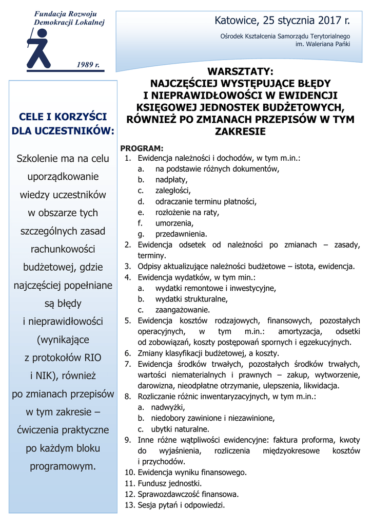 Katowice, 25 stycznia 2017 r. Rozwiązania informatyczne Ośrodek Kształcenia Samorządu Terytorialnego im. Waleriana Pańki CELE I KORZYŚCI DLA UCZESTNIKÓW: Szkolenie ma na celu uporządkowanie wiedzy uczestników w obszarze tych szczególnych zasad rachunkowości budżetowej, gdzie najczęściej popełniane są błędy i nieprawidłowości (wynikające z protokołów RIO i NIK), również po zmianach przepisów w tym zakresie – ćwiczenia praktyczne po każdym bloku programowym. WARSZTATY: NAJCZĘŚCIEJ WYSTĘPUJĄCE BŁĘDY I NIEPRAWIDŁOWOŚCI W EWIDENCJI KSIĘGOWEJ JEDNOSTEK BUDŻETOWYCH, RÓWNIEŻ PO ZMIANACH PRZEPISÓW W TYM ZAKRESIE PROGRAM: 1. Ewidencja należności i dochodów, w tym m.in.: a. na podstawie różnych dokumentów, b. nadpłaty, c. zaległości, d. odraczanie terminu płatności, e. rozłożenie na raty, f. umorzenia, g. przedawnienia. 2. Ewidencja odsetek od należności po zmianach – zasady, terminy. 3. Odpisy aktualizujące należności budżetowe – istota, ewidencja. 4. Ewidencja wydatków, w tym min.: a. wydatki remontowe i inwestycyjne, b. wydatki strukturalne, c. zaangażowanie. 5. Ewidencja kosztów rodzajowych, finansowych, pozostałych operacyjnych, w tym m.in.: amortyzacja, odsetki od zobowiązań, koszty postępowań spornych i egzekucyjnych. 6. Zmiany klasyfikacji budżetowej, a koszty. 7. Ewidencja środków trwałych, pozostałych środków trwałych, wartości niematerialnych i prawnych – zakup, wytworzenie, darowizna, nieodpłatne otrzymanie, ulepszenia, likwidacja. 8. Rozliczanie różnic inwentaryzacyjnych, w tym m.in.: a. nadwyżki, b. niedobory zawinione i niezawinione, c. ubytki naturalne. 9. Inne różne wątpliwości ewidencyjne: faktura proforma, kwoty do wyjaśnienia, rozliczenia międzyokresowe kosztów i przychodów. 10. Ewidencja wyniku finansowego. 11. Fundusz jednostki. 12. Sprawozdawczość finansowa. 13. Sesja pytań i odpowiedzi. SZKOLENIE SKIEROWANE DO: pracownicy działów księgowości jednostek budżetowych DANE DO KONTAKTU: Ośrodek Kształcenia Samorządu Terytorialnego im. Waleriana Pańki 40-014 Katowice ul. Mariacka 1 NIP: 522-000-18-95 Tel 32 259 86 73, 32 253 84 09 Fax. 32 259 86 73 w. 22, 26 e-mail: [email protected] www.okst.pl OSOBA DO KONTAKTU: Marlena Moliszewska-Gumulak tel. 32 206 80 39, 32 206 98 43 w. 29 [email protected] MIEJSCE SZKOLENIA: Katowice, siedziba Ośrodka, ul. Mariacka 1, II piętro. Mapkę dojazdu do miejsca szkolenia znajdą Państwo na www.okst.pl/dojazd TERMIN SZKOLENIA: Katowice: 25 stycznia 2017 r. godz. 10.00 – 15.00 CENA: 359 zł netto/os., Udział w szkoleniu zwolniony z VAT w przypadku finansowania szkolenia ze środków publicznych. Cena zawiera materiały szkoleniowe, zaświadczenie o ukończeniu szkolenia, poczęstunek i serwis kawowy. ZGŁOSZENIA: Wypełnioną kartę zgłoszenia należy przesłać mailem, faksem lub poprzez formularz zgłoszenia na www.okst.pl do 20 stycznia 2017 r. Jesteśmy członkiem: KOD SZKOLENIA Katowice, 184/17/G Nazwa nabywcy (dane do faktury) Adres nabywcy (ulica, nr domu, kod pocztowy, miejscowość) NIP Telefon Email 1. Imię i nazwisko uczestnika, stanowisko 2. Imię i nazwisko uczestnika, stanowisko 3. Imię i nazwisko uczestnika, stanowisko Oświadczam, że szkolenie dla ww. pracowników jest kształceniem zawodowym finansowanym w całości lub co najmniej 70% ze środków publicznych (proszę zaznaczyć właściwe) Członek FORUM (proszę zaznaczyć właściwe) UWAGA Ilość miejsc ograniczona. O udziale w szkoleniu decyduje kolejność zgłoszeń. Zgłoszenie na szkolenie musi zostać potwierdzone przesłaniem do Ośrodka karty zgłoszenia (mail, fax lub formularz na www.okst.pl). Brak pisemnej rezygnacji ze szkolenia najpóźniej na trzy dni robocze przed terminem będzie równoznaczny z obciążeniem Państwa należnością za to szkolenie niezależnie od przyczyny rezygnacji. Płatność należy uregulować przelewem przed lub po szkoleniu (na przelewie prosimy podać nazwę szkolenia lub jego kod). NR RACHUNKU: BPH: 68-10600076-0000321000197618 TAK ☐ NIE ☐ TAK ☐ NIE ☐ PODPIS