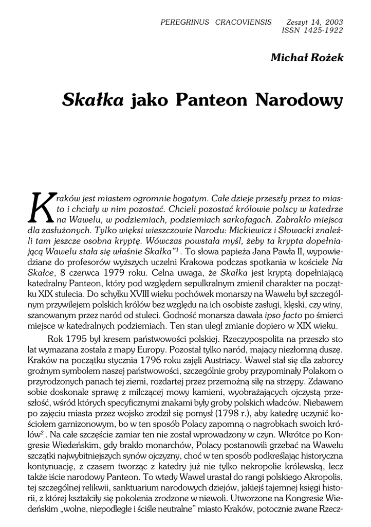 PEREGRINUS CRACOVIENSIS Zeszyt 14, 2003 ISSN 1425−1922 Michał Rożek Skałka jako Panteon Narodowy K raków jest miastem ogromnie bogatym. Całe dzieje przeszły przez to mias− to i chciały w nim pozostać. Chcieli pozostać królowie polscy w katedrze na Wawelu, w podziemiach, podziemiach sarkofagach. Zabrakło miejsca dla zasłużonych. Tylko więksi wieszczowie Narodu: Mickiewicz i Słowacki znaleź− li tam jeszcze osobna kryptę. Wówczas powstała myśl, żeby ta krypta dopełnia− jącą Wawelu stała się właśnie Skałka”1 . To słowa papieża Jana Pawła II, wypowie− dziane do profesorów wyższych uczelni Krakowa podczas spotkania w kościele Na Skałce, 8 czerwca 1979 roku. Celna uwaga, że Skałka jest kryptą dopełniającą katedralny Panteon, który pod względem sepulkralnym zmienił charakter na począt− ku XIX stulecia. Do schyłku XVIII wieku pochówek monarszy na Wawelu był szczegól− nym przywilejem polskich królów bez względu na ich osobiste zasługi, klęski, czy winy, szanowanym przez naród od stuleci. Godność monarsza dawała ipso facto po śmierci miejsce w katedralnych podziemiach. Ten stan uległ zmianie dopiero w XIX wieku. Rok 1795 był kresem państwowości polskiej. Rzeczypospolita na przeszło sto lat wymazana została z mapy Europy. Pozostał tylko naród, mający niezłomną duszę. Kraków na początku stycznia 1796 roku zajęli Austriacy. Wawel stał się dla zaborcy groźnym symbolem naszej państwowości, szczególnie groby przypominały Polakom o przyrodzonych panach tej ziemi, rozdartej przez przemożną siłę na strzępy. Zdawano sobie doskonale sprawę z milczącej mowy kamieni, wyobrażających ojczystą prze− szłość, wśród których specyficznymi znakami były groby polskich władców. Niebawem po zajęciu miasta przez wojsko zrodził się pomysł (1798 r.), aby katedrę uczynić ko− ściołem garnizonowym, bo w ten sposób Polacy zapomną o nagrobkach swoich kró− lów2 . Na całe szczęście zamiar ten nie został wprowadzony w czyn. Wkrótce po Kon− gresie Wiedeńskim, gdy brakło monarchów, Polacy postanowili grzebać na Wawelu szczątki najwybitniejszych synów ojczyzny, choć w ten sposób podkreślając historyczna kontynuację, z czasem tworząc z katedry już nie tylko nekropolie królewską, lecz także iście narodowy Panteon. To wtedy Wawel urastał do rangi polskiego Akropolis, tej szczególnej relikwii, sanktuarium narodowych dziejów, jakiejś tajemnej księgi histo− rii, z której kształciły się pokolenia zrodzone w niewoli. Utworzone na Kongresie Wie− deńskim „wolne, niepodległe i ściśle neutralne” miasto Kraków, potocznie zwane Rzecz− 120 Michał Rożek pospolitą Krakowską, stało się rychło świadkiem dwóch wspaniałych politycznych manifestacji, które bezpośrednio wiązały się z Wawelem. W podziemiach katedry – ponownie gotowych do na przyjęcie trumien – pogrzebano Księcia Józefa Poniatow− skiego i Tadeusza Kościuszkę. Od tej pory przywilej grzebania w katedrze wiązał się nie z koroną monarszą, lecz z wolą narodowych elit, które dostrzegły w tej prastarej koronacyjnej świątyni Akropol i Panteon zarazem. Ten, który wolą elit miał spocząć od tej pory na Wawelu musiał być uznanym przez wszystkich bohaterem narodowym. Na Wawelu zaczęto przeto grzebać nie szkielety, lecz idee. Od tej pory – jak słusznie pisał Andrzej Kijowski – „Z wawelskiego Wzgórza (…) pozdrawiają nas bohaterowie żywi, których stworzyliśmy sami na własną miarę wedle naszych aspiracji do wol− ności. W grobach krypty św. Leonarda spoczywają idee, nie szkielety”3. Księcia Józefa Poniatowskiego, bohatera epopei napoleońskiej, grzebano w katedrze 23 lip− ca 1817 roku, zaś Tadeusza Kościuszkę 23 czerwca 1818 roku. Obydwie uroczysto− ści funeralne przyczyniły się do pomnożenia sławy Krakowa, który w owym czasie – nie bez racji – utożsamiano z miastem historii, wyrażającej narodową tożsamość ista− nowiącej także źródło tożsamości, esencję polskości. Zdaniem współczesnych Kraków przechował najcenniejsze relikwie dziejowe, w okresie niewoli tak bardzo pobudzają− ce wyobraźnię. Wedle naocznego świadka tych pamiętnych wydarzeń Kazimierza Gir− tlera: „Pogrzeby te na umysł oddziałały, były one jakby przeglądem ostatnich dziejów Polski. Rozrzewnieni starce wracali do domu jakby z Ziemi Świętej, czy− niąc ofiary z uczuć, na jakie tylko zdobyć się mogli, każdy przekazywał swemu następcy obowiązki z uczuć tych i ślubów płynące, a łzy narodu lały się po gła− zach świadczących o jego wielkości. My, młodzież, oswajaliśmy się z dziełami ta− kich ludzi, jak Poniatowski i Kościuszko, serca nasze biły mocno na opowiadania wojowników, którzy pod nimi służyli. Czyniliśmy im jedne za drugimi zapytania, aż pojęliśmy, że oni wiedzą jedynie o przeszłości, a przyszłość na nas spoczywa. Ztego pogrzebu duch Polski, jakoby zawołał na nas: Jeszcze Polska nie zginęła”4. W pierwszej połowie XIX stulecia wzrosło znaczenie Krakowa jako miasta pa− miątek narodowych, więcej miasta grobów niekwestionowanych narodowych wielko− ści. Nadszedł czas kultury przetrwania, a peregrynacjom rodaków do byłej stolicy Rzeczypospolitej Obojga Narodów towarzyszył niespotykany w tej skali patriotyzm. Silnie historyzująca atmosfera Krakowa nasuwała szereg refleksji. Zmuszała do prze− myśleń, przywracała też poczucie przynależności narodowej. Kultura czasu przetrwa− nia stała się najistotniejszym spoiwem decydującym o istnieniu narodu. Kraków po− strzegany był jako symbol dziejowej roli Polski. To Wincenty Pol skreślił te słowa o tym mieście: „wjeżdżając do Krakowa, kto nie był Polakiem, ten się nim staje”5, najle− piej chyba oddając znaczenie Krakowa dla kultury narodowej w XIX stuleciu. Z upły− wem czasu to tutaj – pod Wawelem –