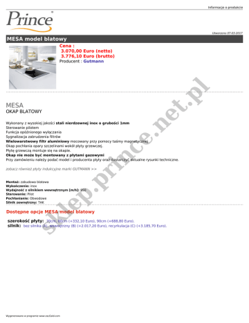 Informacje o produkcie Utworzono 07-03-2017 MESA model blatowy Cena : 3.070,00 Euro (netto) 3.776,10 Euro (brutto) pl Producent : Gutmann t. MESA . ne OKAP BLATOWY pr in c e. Wykonany z wysokiej jakości stali nierdzewnej inox o grubości 1mm Sterowanie pilotem Funkcja opóźnionego wyłączania Sygnalizacja zabrudzenia filtrów Wielowarstwowy filtr aluminiowy mocowany przy pomocy taśmy magnetycznej Okap pochłania opary szczelinami wokół płyty grzewczej. Płytę grzewczą montuje się na okapie. Okap nie może być montowany z płytami gazowymi Przy zamówieniu należy podać model i producenta płyty oraz dostarczyć aktualne rysunki techniczne. zobacz również płyty indukcyjne marki GUTMANN >> sk le p. Montaż: zabudowa blatowa Wykończenie: inox Wydajność z silnikiem wewnętrznym [m/h]: 950 Sterowanie: Pilot Pochłanianie: Obwodowe Silnik zewnętrzny: TAK Dostępne opcje MESA model blatowy szerokość płyty: 70cm, 80cm (+332,10 Euro), 90cm (+688,80 Euro). silnik: bez silnika (A), wewnętrzny (B) (+2.017,20 Euro), recyrkulacja (C) (+3.185,70 Euro). Wygenerowano w programie www.oscGold.com