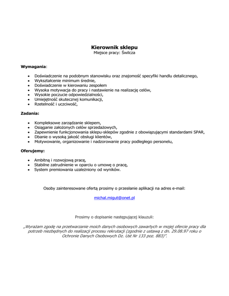Kierownik sklepu Miejsce pracy: Świlcza Wymagania: Doświadczenie na podobnym stanowisku oraz znajomość specyfiki handlu detalicznego, Wykształcenie minimum średnie, Doświadczenie w kierowaniu zespołem Wysoka motywacja do pracy i nastawienie na realizację celów, Wysokie poczucie odpowiedzialności, Umiejętność skutecznej komunikacji, Rzetelność i uczciwość, Zadania: Kompleksowe zarządzanie sklepem, Osiąganie założonych celów sprzedażowych, Zapewnienie funkcjonowania sklepu-sklepów zgodnie z obowiązującymi standardami SPAR, Dbanie o wysoką jakość obsługi klientów, Motywowanie, organizowanie i nadzorowanie pracy podległego personelu, Oferujemy: Ambitną i rozwojową pracę, Stabilne zatrudnienie w oparciu o umowę o pracę, System premiowania uzależniony od wyników. Osoby zainteresowane ofertą prosimy o przesłanie aplikacji na adres e-mail: [email protected] Prosimy o dopisanie następującej klauzuli: „Wyrażam zgodę na przetwarzanie moich danych osobowych zawartych w mojej ofercie pracy dla potrzeb niezbędnych do realizacji procesu rekrutacji (zgodnie z ustawą z dn. 29.08.97 roku o Ochronie Danych Osobowych Dz. Ust Nr 133 poz. 883)”.