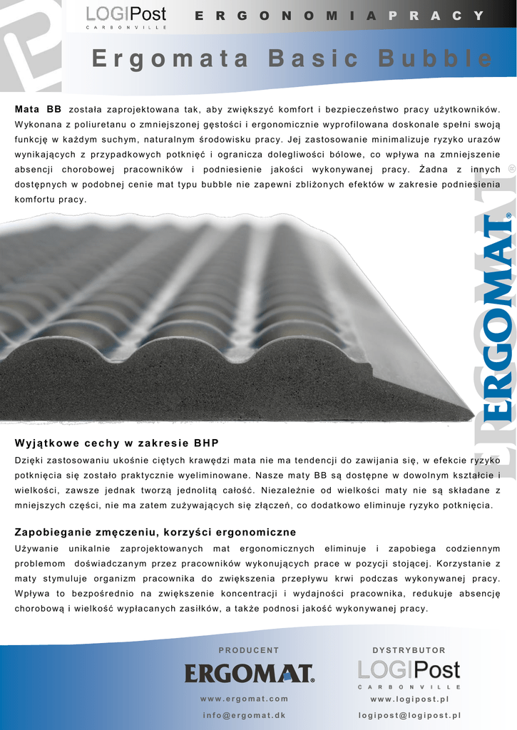 E R G O N O M I A P R A C Y Ergomata Basic Bubble Mata BB zo s t a ła za pr oj ek to wa n a tak , a b y zwi ęk s z yć k om f ort i be zp i e c ze ńs t wo pr ac y u ż ytk o wn ik ó w. W yk ona na z p o l i ur et a nu o zm n i ej s zo n ej g ęs toś c i i e rg o nom ic zn i e w yp r of i l o wa na d os k on a le s p eł n i s woj ą f unk c j ę w k a żd ym s uc h ym , n at ur a ln ym ś r od o wis k u pr ac y. J ej za s t os o wa n i e m i n im al i zuj e r yz yk o ura zó w w yn ik aj ąc yc h z pr z yp adk o w yc h p otk n i ęć i ogr a n ic za d o l eg l i woś c i b ól o we , c o wp ł ywa na zm n i ej s ze n ie abs e nc j i c h or ob o wej pr ac o wn ik ó w i p od n ies i en i e j ak oś c i w y k on ywa n ej prac y. Ż ad n a z in n yc h dos t ęp n yc h w po d ob n ej c en i e m at t yp u bu b b le n i e za p e wn i zb l i żo n yc h ef ek tó w w zak re s i e po d n ies i e ni a k om f or tu pr ac y. W yjątkow e cechy w zakresie BHP D zi ęk i za s tos o wa n iu u k oś ni e c i ęt yc h k r a węd zi m at a n i e m a t e nd e n c j i d o za wi j an i a s i ę, w ef ek c i e r yz yk o po tk ni ęc i a s i ę zo s t a ło pr ak t yc zn i e w ye l im in o wa n e. Nas ze m a t y B B s ą d os t ę p ne w d o wo l n ym k s zt ałc i e i wi e lk oś c i , za ws ze j e d nak t wo r zą j e d no l i tą c a łoś ć . N ie za l e żn i e o d wi e lk oś c i m at y n i e s ą s k ł ad a ne z m niej s z yc h c zę ś c i, n i e m a za tem zu ż ywa j ąc yc h s i ę zł ą c ze ń , c o d od atk o wo e l im in uj e r yz yk o p otk n ięc i a. Zapobieganie zmęczeniu, korzyści ergonomiczne U ż ywa n i e pro b l em om u nik a l n ie za pr oj ek to wa n yc h m at er g on om ic zn yc h e lim i nuj e i za p o b i eg a c od zi e n n ym doś wi a dc za n ym pr ze z pr ac o wn i k ów w yk o nuj ąc yc h pra c e w p o z yc j i s t oj ąc ej . K or z ys t a n i e z m at y s t ym ul uj e or ga n i zm pr ac o wn ik a d o z wi ęk s zen i a pr ze p ł ywu k rwi p o dc za s w yk o n ywa n ej pr ac y. W pł ywa t o b e zp oś r e d n io n a z wi ęk s ze ni e k onc e ntr ac j i i w yd a j n o ś c i pr ac o wn ik a, r ed u k uj e a bs enc j ę c hor o b o wą i wi elk oś ć w yp ł a c a n yc h za s i łk ó w, a t ak że po d nos i j ak oś ć w yk on ywa n ej pr ac y. PRODUCENT DYSTRYBUTOR www.ergomat.com www.logipost.pl [email protected] [email protected] Parametry techniczne standardow ej maty ERGOMAT Basic Bubble Materiał: Piankowy poliuretan Kolor: Antracyt Waga: 2 100 g +/- 50g Długość (bez ukośnie ciętych krawędzi): 90 cm +/- 1% Szerokość (bez krawędzi): 60 cm +/- 1% Grubość: 15 mm Właściwośći termiczne Właściwości ergonomiczne zostaną zachowane przy: Minimalnej temperaturze użytkowania: 0 °C Maksymalnej temperaturze użytkowania: 80 °C Maksymalna wytrzymałość termiczna: 120 °C Gęstość: 330 kg/m³ Twardość: 18 - 28 Sh A Obciążenie zużycia średniego= 5 N: 800 mm³ Wytrzymałość na rozciąganie: 1 Mpa Wydłużenie przy zerwaniu: 200 % Wytrzymałość na rozerwanie: 1.5 N / mm Opór elektryczny (po przyłożeniu do punktu powierzchni % 50 RH): > 20 x 10 9 Ω Podatna na promienie UV Użytkowanie w pomieszczeniach czystych: nie testowano Produkt nie zaw iera silikonu ani lateksu Solidnie w ykończona całości maty zapobiega tw orzeniu się w ystrzępień i w ypustków Dostępne modele mat Mata typu Basic Bubble 3 LETNIA GWARANCJA W szystkie produkty firm y Ergomat podlegają warunkowej gwarancji jeśli tylko użytk owano je zgodnie z przeznaczeniem*, nawet przez 24 godziny na dobę, 7 dni w tygodniu. Gwarancja nie obejmuje zniszczeń mechanicznych spowodowanych przeciągnięciem przez matę lub jej obciążeniem zbyt dużym i ciężarami. Gwarancja nie ma zastosowania także w przypadku przeciągnięcia lub przejazdu przez matę wszelkiego rodzaju wózk ów paletowych, palet, skrzyń, wózków widłowych itp. Gwarancja dotycząca uszkodzeń wynik ając ych z reakcji maty na roztwory chemiczne, oleje, ciecze lub inne substancje aktywne ma różne zastosowanie, w zależności od rodzaju użytk owanej maty. W celu właściwego doboru maty dedyk owanej konkretnym warunkom należy skonsultować się z dystrybutorem lub osobą reprezentującą firmę Ergomat. Dopasowanie rodzaju maty zależy od charakterystyk i otoczenia w Państwa firmie oraz od spec yfiki miejsca, w którym mata będzie wykorzystywana. Okres gwaranc yjny rozpoczyna się z dniem nabycia produktu. Produkt podlegając y gwarancji w efekcie odpowiednio uzasadnionej i zatwierdzonej przez firmę Ergomat akcji gwaranc yjnej zostanie wymieniony na nowy. Gwarancja nie pokrywa kosztów bezpośrednich i pośrednich użytkownika a tak że nie zapewnia zwrotu pieniędzy. * Poprzez użytkowanie zgodne z przeznaczeniem rozumie się korzystanie z maty przez użytkownika pozostającego w pozycji stojącej, poruszanie się po niej w odpowiednim obuwiu pracowniczym, w otoczeniu, w którym temperatura powietrza nie przekracza 25 º C, a wilgotność powietrza 80%.