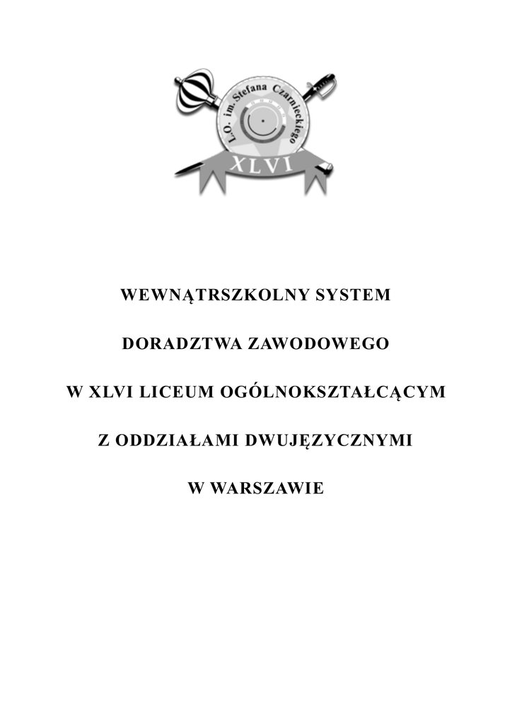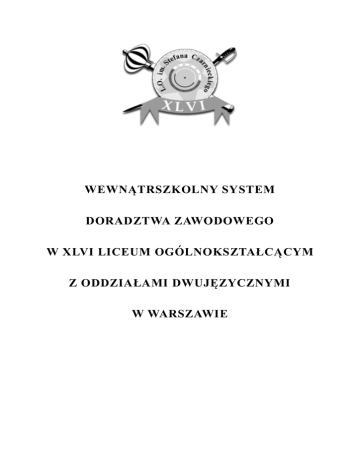 ! WEWNĄTRSZKOLNY SYSTEM DORADZTWA ZAWODOWEGO W XLVI LICEUM OGÓLNOKSZTAŁCĄCYM Z ODDZIAŁAMI DWUJĘZYCZNYMI W WARSZAWIE Spis treści I. Wstęp ( założenia ) II. Podstawy prawne III. Cele ogólne i szczegółowe IV. Adresaci i ich korzyści wynikające z WSDZ V. Koordynator i osoby odpowiedzialne za realizację programu VI. Czas i miejsce realizacji zadań VII. Metody i formy pracy doradczej VIII. Współpraca IX. Przewidywane rezultaty (efekty) X. Ocena i ewaluacja I. Wstęp Wewnątrzszkolny System Doradztwa Zawodowego jest realizowany we współpracy koordynatora doradztwa zawodowego, nauczycieli, rodziców i uczniów, a także placówek i instytucji poza szkolnych. Jest on odpowiedzią na zadania dla szkoły ponadgimnazjalnej wynikające z Ustawy o systemie oświaty i rozporządzeń Ministra Edukacji Narodowej. WSDZ określa zadania podejmowane w szkole w celu przygotowania uczniów do wyboru zawodu, poziomu i kierunku kształcenia. II. Podstawy prawne Ustawa z dnia 7 września 1991 r. o systemie oświaty (Dz. U. z 2004 r. Nr 256, poz. 2572) ze zm. Rozporządzenie Ministra Edukacji Narodowej z dnia 30 kwietnia 2013 r. w sprawie zasad udzielania i organizacji pomocy psychologiczno-pedagogicznej w publicznych przedszkolach, szkołach i placówkach (Dz. U. z 2013r., poz. 532). Rozporządzenie Ministra Edukacji Narodowej z dnia 21 maja 2001r. w sprawie ramowych statutów publicznego przedszkola oraz publicznych szkół. Rozporządzenie ministra Edukacji Narodowej w sprawie szczegółowych zasad działania publicznych poradni psychologiczno-pedagogicznych w tym publicznych poradni specjalistycznych z 1 lutego 2013 r. § 25. 1. Do zadań doradcy zawodowego należy w szczególności: 1) systematyczne diagnozowanie zapotrzebowania uczniów na informacje edukacyjne i zawodowe oraz pomoc w planowaniu kształcenia i kariery zawodowej; 2) gromadzenie, aktualizacja i udostępnianie informacji edukacyjnych i zawodowych właściwych dla danego poziomu kształcenia; 3) prowadzenie zajęć związanych z wyborem kierunku kształcenia i zawodu oraz planowaniem kształcenia i kariery zawodowej; 4) koordynowanie działalności informacyjno-doradczej prowadzonej przez szkołę i placówkę; 5) współpraca z innymi nauczycielami w tworzeniu i zapewnieniu ciągłości działań w zakresie doradztwa edukacyjno-zawodowego; 6) wspieranie nauczycieli, wychowawców grup wychowawczych i innych specjalistów w udzielaniu pomocy psychologiczno-pedagogicznej. 2. W przypadku braku doradcy zawodowego w szkole lub placówce, dyrektor szkoły lub placówki wyznacza nauczyciela, wychowawcę grupy wychowawczej lub specjalistę planującego i realizującego zadania z zakresu doradztwa edukacyjno-zawodowego. III. Cele ogólne i szczegółowe Cele ogólne: ▪ Przygotowanie do dalszego kształcenia , do roli pracownika na współczesnym rynku pracy ▪ Wzmacnianie myślenia o karierze zawodowej w perspektywie procesu podejmowania decyzji ▪ Aktywizowanie i podnoszenie kompetencji nauczycieli do prowadzenia orientacji i doradztwa zawodowego w szkole. ▪ Rozwijanie aktywności poznawczej uczniów w kierunku właściwej samooceny swoich możliwości psychofizycznych. ▪ Poznawanie przez młodzież własnej osobowości w określaniu przydatności zawodowej. ▪ Przygotowanie uczniów do konstruowania realistycznych planów kariery edukacyjno zawodowej ▪ Inspirowanie młodzieży do poznawania kierunków kształcenia i wymagań edukacyjnych w szkołach wyższych ▪ Poznawanie zawodów przyszłości w kraju i w Unii Europejskiej. ▪ Aktywizowanie rodziców w proces wychowawczy dziecka dotyczący wyboru dalszej drogi edukacyjnej i właściwej szkoły wyższej. ▪ Prowadzenie indywidualnego i grupowego doradztwa zawodowego na terenie szkoły. ▪ Określenie predyspozycji i zainteresowań ucznia, ▪ Przygotowanie rodziców do efektywnego wspierania dzieci w podejmowaniu przez nie decyzji edukacyjnych i zawodowych, ▪ Pomoc nauczycielom w realizacji tematów związanych z wyborem zawodu w ramach lekcji przedmiotowych i wychowawczych, ▪ Współpraca z Urzędem Pracy, Akademickim Biurami Karier ,FMP, NBP, OHP, uczelniami wyższymi, szkołami policealnymi Cele szczegółowe dotyczące samopoznania: ▪ Rozwijanie zainteresowań uczniów ▪ Nauka i trenowanie umiejętności miękkich tj. umiejętności pracy w grupie, komunikacji werbalnej i niewerbalnej, radzenia sobie ze stresem, przywództwa i kierowaniem grupą, inteligencji emocjonalnej oraz gotowość do uczenia się, otwartość na doświadczenie, aktywne słuchanie, wywieranie wpływu, zaangażowanie, wyznaczanie i realizacja celów, autoprezentacja, samodzielność, pewność siebie ▪ Nazywanie swoim mocnych i słabych stron Cele szczegółowe dotyczące rynku edukacji i pracy: ▪ Poznanie kierunków studiów i zawodów przyszłości ▪ Rozwijanie postawy wobec edukacji i pracy ▪ Analizowanie rynku pracy ▪ Tworzenie biznesplanów Cele szczegółowe dotyczące podejmowania decyzji: ▪ Wyznaczanie celów ▪ Tworzenie własnych ścieżek zawodowych w oparciu o zainteresowania, osobowość, znajomość mocnych i słabych stron, preferencji rodzaju pracy ▪ Tworzenie portfolio zawodowego - gromadzenie dokumentacji potwierdzającej doświadczenie zawodowe i zainteresowania zawodowe ▪ Branie odpowiedzialności za podjęte decyzje i mierzenie się z konsekwencjami wyborów IV. Adresaci i ich korzyści wynikające z WSDZ 1. Uczniowie ▪ Możliwość rozwijania kompetencji twardych i miękkich ▪ Znajomość aktualnego rynku pracy i wymagań na uczelniach wyższych ▪ Otrzymanie wsparcia w wyborze dalszej ścieżki rozwoju ▪ Określenie swoich predyspozycji i zainteresowań ▪ Umiejętność wyznaczania celów ▪ Radzenie sobie z odpowiedzialnością za swoje plany i działani ▪ Uzyskanie możliwości poszerzenia zainteresowań 2. Rodzice ▪ Uzyskują aktualne i rzetelne informacje dotyczące edukacji i rynku pracy ▪ Wiedza o dziecku (osobowości, k