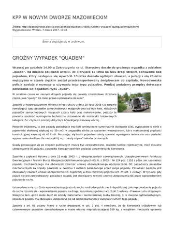 KPP W NOWYM DWORZE MAZOWIECKIM Źródło: http://kppnowydwor.policja.waw.pl/pnd/aktualnosci/48893,Grozny-wypadek-quotquademquot.html Wygenerowano: Wtorek, 7 marca 2017, 17:47 Strona znajduje się w archiwum. GROŹNY WYPADEK "QUADEM" Wczoraj po godzinie 14.00 w Zakroczymiu na ul. Starostwo doszło do groźnego wypadku z udziałem „quada”. Na miejscu policjanci ustalili, że kierująca 15-latka na łuku drogi straciła panowanie nad pojazdem, który następnie się wywrócił. 15-latka doznała ogólnych obrażeń, a jadący z nią 23-letni mężczyzna w stanie ciężkim został przetransportowany śmigłowcem do szpitala. Nowodworska policja apeluje o rozwagę w używaniu tego typu pojazdów. Poniżej podajemy przepisy dotyczące poruszania się pojazdami typu „quad”. W ostatnim czasie na naszych drogach pojawiły się pojazdy czterokołowe określane często, jako "quady". Co mówi prawo o poruszaniu się nimi? Zgodnie z Rozporządzeniem Ministra Infrastruktury z dnia 28 lipca 2005 r.w sprawie homologacji typu pojazdów samochodowych mających dwa lub trzy koła, niektórych pojazdów samochodowych mających cztery koła oraz motorowerów, pojazdy te powinny spełniać wymagania techniczne stosowane do motocykli trójkołowych kategorii L5e, chyba że przepisy dotyczące homologacji stanowią inaczej. Motocykl trójkołowy, to jest pojazdy posiadające trzy koła umieszczone symetrycznie (kategoria L5e), wyposażone w silnik o pojemności skokowej większej niż 50 cm3, w przypadku silnika ze spalaniem wewnętrznym, lub o maksymalnej prędkości konstrukcyjnej większej niż 45 km/h. Poruszając się takim pojazdem należy spełniać wymagania techniczne oraz posiadać wyposażenie określone dla motocykli tj. np.: należy używać hełmów ochronnych. Quady poruszające się po drogach publicznych muszą być zarejestrowane, posiadać tablice rejestracyjne, mieć aktualne ubezpieczenie OC pojazdu, a ponadto kierujący powinien posiadać uprawnienia do kierowania. Zgodnie z zapisami Ustawy z dnia 22 maja 2003 r. o ubezpieczeniach obowiązkowych, Ubezpieczeniowym Funduszu Gwarancyjnym i Polskim Biurze Ubezpieczycieli Komunikacyjnych (Dz.U. z 2003 r. Nr 124 poz. 1152 z późn. zm.) posiadacz pojazdu mechanicznego ma obowiązek zawrzeć umowę obowiązkowego ubezpieczenia OC posiadaczy pojazdów mechanicznych za szkody powstałe w związku z ruchem posiadanego przez niego pojazdu. Posiadacz pojazdu jest obowiązany zawrzeć umowę ubezpieczenia OC najpóźniej w dniu rejestracji pojazdu (art. 29 ust. 1 ustawy). W sytuacji, gdy pojazd nie jest zarejestrowany, posiadacz pojazdu jest obowiązany zawrzeć umowę ubezpieczenia OC przed wprowadzeniem pojazdu do ruchu. Ustawodawca nie rozróżnia wprowadzenia pojazdu do ruchu na drodze publicznej i niepublicznej. Jako wprowadzenie pojazdu do ruchu rozumie się - wprowadzenie pojazdu na drogę, rozumianą zgodnie z art. 2 pkt 1 ustawy - Prawo o ruchu drogowym. Wszędzie tam, gdzie może dojść do szkody materialnej i niematerialnej osoby trzeciej, tj. w miejscu ogólnodostępnym, posiadacz pojazdu ma obowiązek ubezpieczyć się od szkód powstałych w związku z ruchem tego pojazdu. Zgodnie z art. 88 ustawy Prawo o ruchu drogowym, w ust. 2 pkt. 4 określono, że do kierowania trójkołowym lub czterokołowym pojazdem samochodowym o masie własnej nieprzekraczającej 550 kg, z wyjątkiem motocykla uprawnia prawo jazdy kategorii B1. Jest ona niższej rangi niż kat B, więc posiadanie kat. B uprawnia też do kierowania wspomnianym pojazdem. Jeżeli quad będzie zarejestrowany, jako motorower osoba pełnoletnia, czyli taka, która skończyła 18 lat nie musi posiadać uprawnień do kierowania motorowerem, jednakże osoba w wieku od 13 do 18 lat powinna posiadać kartę motorowerową. Kierujący pojazdem samochodowym czterokołowym zarejestrowanym jako ciągnik rolniczy będzie zmuszony do korzystania z tego pojazdu jak z typowego ciągnika rolniczego, z pełnymi konsekwencjami np. zakazu ruchu po drodze ekspresowej, do konieczności doposażenia pojazdu np.: w trójkątną tablicę wyróżniający pojazd wolny, dwa boczne lusterka, gaśnicę itp. Ponadto zgodnie z art. 96. § 1 Kodeksu Wykroczeń właściciel, posiadacz, użytkownik lub prowadzący pojazd, który: 1) dopuszcza do prowadzenia pojazdu na drodze publicznej lub w strefie zamieszkania osobę niemającą sprawności fizycznej lub psychicznej w stopniu umożliwiającym należyte prowadzenie pojazdu, 2) dopuszcza do prowadzenia pojazdu na drodze publicznej osobę niemającą wymaganych uprawnień, 3) dopuszcza do prowadzenia pojazdu na drodze publicznej lub w strefie zamieszkania osobę znajdującą się w stanie po użyciu alkoholu lub podobnie działającego środka, 4) dopuszcza pojazd do jazdy na drodze publicznej pomimo braku wymaganych dokumentów stwierdzających dopuszczenie pojazdu do ruchu, 5) dopuszcza pojazd do jazdy na drodze publicznej, pomimo że pojazd nie jest należycie zaopatrzony w wymagane urządzenia i przyrządy albo pomimo że nie nadają się one do spełnienia swego przeznaczenia, 6) dopuszcza do korzystania z pojazdu samochodowego w sposób niezgodny z jego przeznaczeniem, podlega karze grzywny. Tak więc również na rodzicach ciąży obowiązek nadzoru nad właściwym korzystaniem z quadów przez ich pociechy. Dziecko w wieku do 10 lat na drodze publicznej nie może kierować jakimkolwiek pojazdem, z wyjątkiem kierowania rowerem pod opieką osoby dorosłej. Nie ma natomiast bezpośredniego zakazu kierowania pojazdem poza drogą publiczną. Jednak należy zastosować art. 1 ust. 2 ustawy prawo o ruchu drogowym, który odnosi się do ruchu odbywającego się poza drogami publicznymi, gdzie ustawodawca określa, że przepisy stosuje się, jeżeli jest to konieczne dla uniknięcia zagrożenia bezpieczeństwa uczestników tego ruchu. W przypadku dziecka kierowanie wymienionym quadem jest sytuacją zagrażającą jego zdrowiu i życiu. Dziecko w tym wieku z p