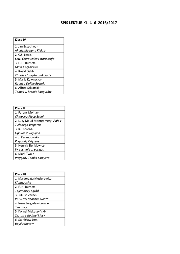 SPIS LEKTUR KL. 4- 6 2016/2017 Klasa IV 1. Jan BrzechwaAkademia pana Kleksa 2. C.S. LewisLew, Czarownica i stara szafa 3. F. H. BurnettMała księżniczka 4. Roald DahlCharlie i fabryka czekolady 5. Maria KownackaRogaś z Doliny Roztoki 6. Alfred Szklarski – Tomek w krainie kangurów Klasa V 1. Ferenc MolnarChłopcy z Placu Broni 2. Lucy Maud Montgomery- Ania z Zielonego Wzgórza 3. K. DickensOpowieść wigilijna 4. J. ParandowskiPrzygody Odyseusza 5. Henryk SienkiewiczW pustyni i w puszczy 6. Mark TwainPrzygody Tomka Sawyera Klasa VI 1. Małgorzata MusierowiczKłamczucha 2. F. H. BurnettTajemniczy ogród 3. Juliusz VerneW 80 dni dookoła świata 4. Irena JurgielewiczowaTen obcy 5. Kornel MakuszyńskiSzatan z siódmej klasy 6. Stanisław LemBajki robotów