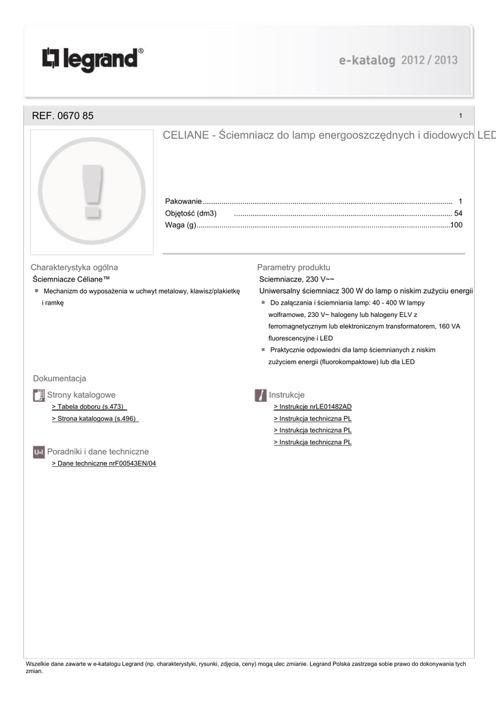 REF. 0670 85 1 CELIANE - Ściemniacz do lamp energooszczędnych i diodowych LED Pakowanie .......................................................................................................................................... 1 Objętość (dm3) .......................................................................................................................................... 54 Waga (g) .......................................................................................................................................... 100 Charakterystyka ogólna Parametry produktu Ściemniacze Céliane™ Sciemniacze, 230 V~~ Mechanizm do wyposażenia w uchwyt metalowy, klawisz/plakietkę i ramkę Uniwersalny ściemniacz 300 W do lamp o niskim zużyciu energii Do załączania i ściemniania lamp: 40 - 400 W lampy wolframowe, 230 V~ halogeny lub halogeny ELV z ferromagnetycznym lub elektronicznym transformatorem, 160 VA fluorescencyjne i LED Praktycznie odpowiedni dla lamp ściemnianych z niskim zużyciem energii (fluorokompaktowe) lub dla LED Dokumentacja Strony katalogowe Instrukcje > Tabela doboru (s.473) > Instrukcje nrLE01482AD > Strona katalogowa (s.496) > Instrukcja techniczna PL > Instrukcja techniczna PL > Instrukcja techniczna PL Poradniki i dane techniczne > Dane techniczne nrF00543EN/04 Wszelkie dane zawarte w e-katalogu Legrand (np. charakterystyki, rysunki, zdjęcia, ceny) mogą ulec zmianie. Legrand Polska zastrzega sobie prawo do dokonywania tych zmian.