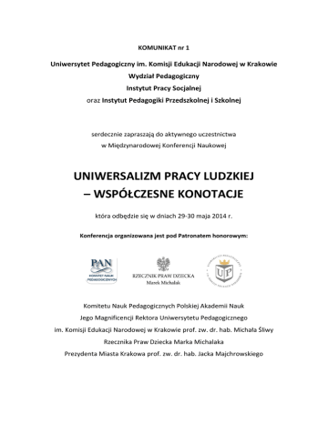 KOMUNIKAT nr 1 Uniwersytet Pedagogiczny im. Komisji Edukacji Narodowej w Krakowie Wydział Pedagogiczny Instytut Pracy Socjalnej oraz Instytut Pedagogiki Przedszkolnej i Szkolnej serdecznie zapraszają do aktywnego uczestnictwa w Międzynarodowej Konferencji Naukowej UNIWERSALIZM PRACY LUDZKIEJ – WSPÓŁCZESNE KONOTACJE która odbędzie się w dniach 29-30 maja 2014 r. Konferencja organizowana jest pod Patronatem honorowym: Komitetu Nauk Pedagogicznych Polskiej Akademii Nauk Jego Magnificencji Rektora Uniwersytetu Pedagogicznego im. Komisji Edukacji Narodowej w Krakowie prof. zw. dr. hab. Michała Śliwy Rzecznika Praw Dziecka Marka Michalaka Prezydenta Miasta Krakowa prof. zw. dr. hab. Jacka Majchrowskiego Radę Naukową Konferencji stanowią: prof. zw. dr hab. Danuta Gielarowska-Sznajder (Akademia Pedagogiki Specjalnej, Warszawa) prof. zw. dr hab. Ryszard Gerlach (Uniwersytet Kazimierza Wielkiego, Bydgoszcz) prof. zw. dr hab. Stefan Kwiatkowski (Akademia Pedagogiki Specjalnej, Warszawa) prof. zw. dr hab. Zbigniew Marek (Akademia Ignatianum, Kraków) prof. zw. dr hab. Bożena Muchacka (Uniwersytet Pedagogiczny, Kraków) prof. zw. dr hab. Mirosław Szymański (Akademia Pedagogiki Specjalnej, Warszawa) prof. zw. dr hab. Zygmunt Wiatrowski (Wyższej Szkole Humanistyczno-Ekonomicznej Włocławek) prof. APS dr hab. Janusz Gęsicki (Akademia Pedagogiki Specjalnej, Warszawa) prof. UR dr hab. Grzegorz Grzybek (Uniwersytet Rzeszowski, Rzeszów) prof. UP dr hab. Norbert Pikuła (Uniwersytet Pedagogiczny, Kraków) prof. UP dr hab. Adam Solak (Uniwersytet Pedagogiczny, Kraków) prof. UP dr hab. Zofia Szarota (Uniwersytet Pedagogiczny, Kraków) prof. AJD dr hab. Ireneusz Świtała (Akademia Jana Długosza, Częstochowa) prof. UR dr hab. Władysław Piotr Wlaźlak (Uniwersytet Rzeszowski, Rzeszów) prof. UHP dr hab. Tamara Zacharuk (Uniwersytet Humanistyczno Przyrodniczy, Siedlce) prof. Olena Bykovska (Uniwersytet im. M. P. Dragomanowa, Kijów, Ukraina) prof. Anna Byszewski, PhD (University of Ottawa, Kanada) prof. Magda Stroiński, PhD (University Hamilton, Kanada) prof. Snezana Mojsovska-Salamovska, PhD (University St.Kliment Ohridski, Bitoli, Macedonia) doc. dr Bozydara Iskrewa Kriwiradewa PhD (University of Sofia, Bułgaria) prof. Tatiana Zielienowa Gieorgiejewna (Uniwersytet Moskiewski, Rosja) prof. PhDr. Eva Žiaková, CSc. (Univerzita Pavla Jozefa Šafárika, Košice, Słowacja) doc. dr Jiří Prokop, PhD (Charles University in Prague, Czechy) Michał Kasprzak, PhD (Ryerson University of Toronto, Kanada) Walenty Konstantinow, PhD (Mołdawska Akademia Nauk, Mołdawia) Komitet Organizacyjny Konferencji prof. UP dr hab. Norbert Pikuła – przewodniczący prof. zw. dr hab. Bożena Muchacka prof. UP dr hab. Adam Solak dr Magdalena Lubińska-Bogacka – sekretarz naukowy dr Marek Banach – sekretarz dr Maciej Soliński – sekretarz dr Józefa Matejek – sekretarz Tematyka Konferencji Temat pracy jest wielowymiarowy i interdyscyplinarny, dlatego też problematyka obrad koncentrować się będzie wokół zagadnień pracy i jej uwarunkowań kulturowych, psycho-społecznych, ekonomicznych i obywatelskich. Zauważa się, że wszystkie zmiany, będące rezultatem współcześnie zachodzących procesów transformacyjnych, globalizacyjnych czy integracyjnych, w swej istocie lokują się w obszarze pracy ludzkiej, która ma ścisły związek z wielorakimi aspektami życia człowieka: dzieci – młodzieży – dorosłych. Powyższa teza potrzebuje współcześnie dyskursu z perspektyw różnych dyscyplin naukowych i instytucji działających w „dystrybucji” z pracą ludzką. Właściwe ich postrzeganie stanowi gwarant ładu społecznego w różnych wymiarach, w tym także w wymiarze godności, wychowania, edukacji i odpowiedzialności. Zagadnienia, które zamierzamy podjąć powinny skupiać się na szacunku do pracy, drugiego człowieka, przestrzegania praw pracowniczych oraz wszelkich działań wspierających rynek pracy. Konferencja skierowana jest do ludzi nauki, nauczycieli akademickich, nauczycieli szkół średnich, gimnazjów i szkół podstawowych, środowisk samorządowych, instytucji pozarządowych, pracodawców i pracowników, gremium kościelnego i politycznego. Proponowane obszary problemowe Konferencji 1. Praca człowieka – wymiar teoretyczny. 2. Praca człowieka – wymiar społeczno-ekonomiczny i psychopedagogiczny. 3. Praca człowieka – wymiar etyczny. 4. Aspekty pracy w obszarze polityki oświatowej i w pedagogice szkolnej 5. Podmioty pracy. 6. Edukacja, szkolnictwo zawodowe a rynek pracy i jego wymagania. 7. Pedagog, nauczyciel na rynku pracy. 8. Pracownik socjalny a rynek pracy. 9. Wsparcie osób bezrobotnych w kontekście rynku pracy. 10. Aktywność i pozycja seniorów na rynku pracy. Serdecznie zapraszamy do uczestnictwa w organizowanej przez nas Konferencji Naukowej. Państwa obecność uświetni planowane spotkanie naukowe, a czynny w nim udział wzbogaci wartość merytoryczną Konferencji. Mamy nadzieję, że implikacje z przedstawionych badań zostaną zauważone i odzwierciedlone w programach polityki społecznej. Adres do korespondencji: Uniwersytet Pedagogiczny im. Komisji Edukacji Narodowej Instytut Pracy Socjalnej os. Stalowe 17 31-922 Kraków tel.: +48 12 662 79 50, fax: +48 12 644 22 38 e-mail: [email protected] Sekretarz naukowy Konferencji: dr Magdalena Lubińska-Bogacka tel.: +48 690043737 e-mail: [email protected] Udział w Konferencji: 1. Konferencja odbędzie się w Uniwersytecie Pedagogicznym im. KEN w Krakowie, przy ul. Ingardena 4 oraz na os. Stalowym 17. 2. W ramach Konferencji przewiduje się imprezy towarzyszące. 3. Zgłoszenie uczestnictwa w konferencji prosimy przesłać drogą elektroniczną na adres: [email protected] do 4 kwietnia 2014 roku. 4. Artykuły zgodne ze wskazówkami edytorskimi prosimy przesłać drogą elektroniczną na adres: [email protected] do 16 maja 2014 r. 5. Opłata za udział w Konferencji wynosi 400 zł. 6. Istnieje mo