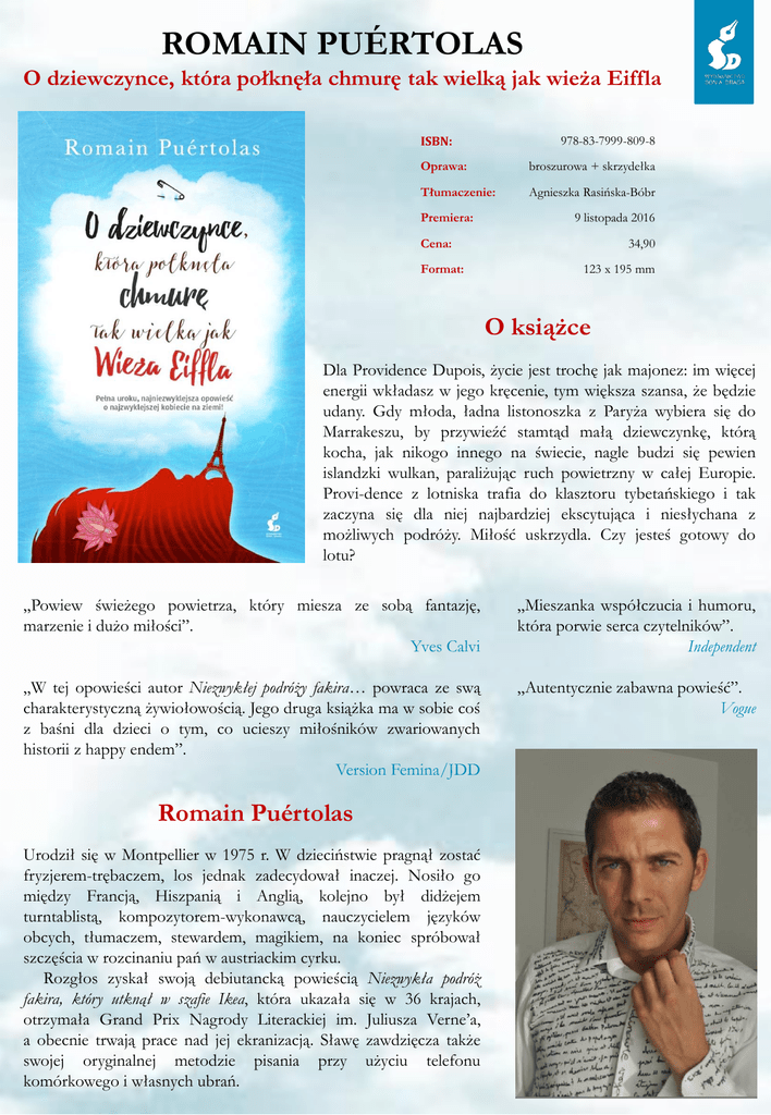 ROMAIN PUÉRTOLAS O dziewczynce, która połknęła chmurę tak wielką jak wieża Eiffla ISBN: 978-83-7999-809-8 Oprawa: broszurowa + skrzydełka Tłumaczenie: Agnieszka Rasińska-Bóbr Premiera: 9 listopada 2016 Cena: Format: 34,90 123 x 195 mm O książce Dla Providence Dupois, życie jest trochę jak majonez: im więcej energii wkładasz w jego kręcenie, tym większa szansa, że będzie udany. Gdy młoda, ładna listonoszka z Paryża wybiera się do Marrakeszu, by przywieźć stamtąd małą dziewczynkę, którą kocha, jak nikogo innego na świecie, nagle budzi się pewien islandzki wulkan, paraliżując ruch powietrzny w całej Europie. Provi-dence z lotniska trafia do klasztoru tybetańskiego i tak zaczyna się dla niej najbardziej ekscytująca i niesłychana z możliwych podróży. Miłość uskrzydla. Czy jesteś gotowy do lotu? „Powiew świeżego powietrza, który miesza ze sobą fantazję, marzenie i dużo miłości”. Yves Calvi „Mieszanka współczucia i humoru, która porwie serca czytelników”. Independent „W tej opowieści autor Niezwykłej podróży fakira… powraca ze swą charakterystyczną żywiołowością. Jego druga książka ma w sobie coś z baśni dla dzieci o tym, co ucieszy miłośników zwariowanych historii z happy endem”. Version Femina/JDD „Autentycznie zabawna powieść”. Vogue Romain Puértolas Urodził się w Montpellier w 1975 r. W dzieciństwie pragnął zostać fryzjerem-trębaczem, los jednak zadecydował inaczej. Nosiło go między Francją, Hiszpanią i Anglią, kolejno był didżejem turntablistą, kompozytorem-wykonawcą, nauczycielem języków obcych, tłumaczem, stewardem, magikiem, na koniec spróbował szczęścia w rozcinaniu pań w austriackim cyrku. Rozgłos zyskał swoją debiutancką powieścią Niezwykła podróż fakira, który utknął w szafie Ikea, która ukazała się w 36 krajach, otrzymała Grand Prix Nagrody Literackiej im. Juliusza Verne’a, a obecnie trwają prace nad jej ekranizacją. Sławę zawdzięcza także swojej oryginalnej metodzie pisania przy użyciu telefonu komórkowego i własnych ubrań. Ważne jest to, by śmiechu było więcej niż płaczu Wywiad z Romainem Puértolasem Skąd wzięła się u Pana skłonność do tak długich tytułów? Dla mnie tytuł jest jednocześnie pierwszym zdaniem książki. Nadaje jej ton. Pierwsze zdanie jest jak drzwi, które otwierasz, by uciec od codzienności. Są obietnicą niesamowitej przygody. W O dziewczynce, która połknęła chmurę tak wielką jak wieża Eiffla opisane są dwie historie – jedna w drugiej. Czy mógłby Pan je streścić? Wszystko zaczyna się od chwili, w której pewien kontroler lotów wchodzi do zakładu fryzjerskiego. Starszy wiekiem fryzjer zabiera się za obcinanie jego włosów, a w tym czasie klient opowiada mu niezwykłą historię Providence Dupois, paryskiej listonoszki, która dzięki miłości do małej dziewczynki mieszkającej trzy tysiące kilometrów od Paryża wznosi się w powietrze i zaczyna latać jak ptak. Przyprawia Pan swoje książki sporą dawką humoru. Humor odgrywa ważną rolę w moim życiu. Pozwala mi na wszystko spoglądać z dystansem. Jedynymi rzeczami, jakimi należy się przejmować są śmierć i choroby, które do niej prowadzą. Naprawdę jedynymi. A nawet w przypadku chorób humor może okazać się skutecznym remedium. Ale w książkach porusza Pan bardzo poważne tematy. Smutna historia to coś, co równoważy optymistyczną, pozytywną narrację. Jest czymś, co sprawia, że humor nabiera mocy. Bez poważnych wątków moje powieści nie byłyby niczym więcej jak tylko zabawnymi książkami. A nie takie są moje intencje. Na życie składają się śmiech i łzy. Ważne jest to, by śmiechu było więcej niż płaczu. Nie zapominajmy o miłości. W Pana książkach to miłość jest najważniejsza. Ja kocham życie. Zakochuję się we wszystkim. Dla miłości zrobiłbym wszystko, posunął się do każdego szaleństwa. Właściwie to już to robiłem. Można zakochać się w innym człowieku, w psie, w nowej profesji, w programie telewizyjnych, w książce, w sobie samym też. Wszystko jedno. Ważne, żeby w ogóle kochać. To wibracje związane z tym uczuciem sprawiają, że żyjesz. Historia Zahery jest bardzo poruszająca. Cała książka jest poruszająca, bardziej poruszająca niż Niezwykła podróż fakira... Taki był plan, tę stronę mojej osoby chciałem pokazać. Otworzyłem serce. Podarowałem je moim czytelnikiem. Jestem okropnie romantyczny… 8.07.2015 Sonia Draga Sp. z o.o., Pl. Grunwaldzki 8-10, 40-127 Katowice, Tel.: 32 7826477, 7826037, Fax: 032 2537728 Dział handlowy: Danuta Czarnowska, 693420384, [email protected] Promocja: Agnieszka Jedlińska, 695672067, [email protected] Redakcja: [email protected] W Pana powieściach zawsze pojawia się jakiś wątek związany z bieżącą sytuacją na świecie. To prawda. Nie chcę tracić kontaktu z rzeczywistością. Ale to, co zawieram w moich powieściach, to jedynie mój sposób postrzegania świata. Wielu rzeczy, które mnie otaczają, nie rozumiem. Wiele spraw zupełnie mnie nie interesuje, przykładowo ekonomia czy polityka. Ale jednak te kwestie na tym czy innym etapie odgrywają jakąś rolę w moim życiu. Władza latami przechodzi z prawej strony sceny politycznej na lewą i z powrotem, a tak naprawdę nic istotnego się nie dzieje. Polityka służy wąskiej grupie ludzi, którzy dzięki niej bogacą się, kupują domy, samochody i jachty. Jeżeli ktoś mówi, że tak nie jest, może oznaczać to jedynie, że jest politykiem. Choć teraz utrzymuje się Pan z pisania faktem jest, że bywał Pan zmuszony podejmować się najrozmaitszych zajęć. Żyje się tylko raz. Osoby, które wierzą w reinkarnację lub w to, że czeka ich życie po śmierci, to marzyciele bojący się śmierci. Ja też boję się śmierci, ale takie jest życie. Dlatego już jako dziecko obiecałem sobie, że będę robić w życiu wszystko. Co dwa la