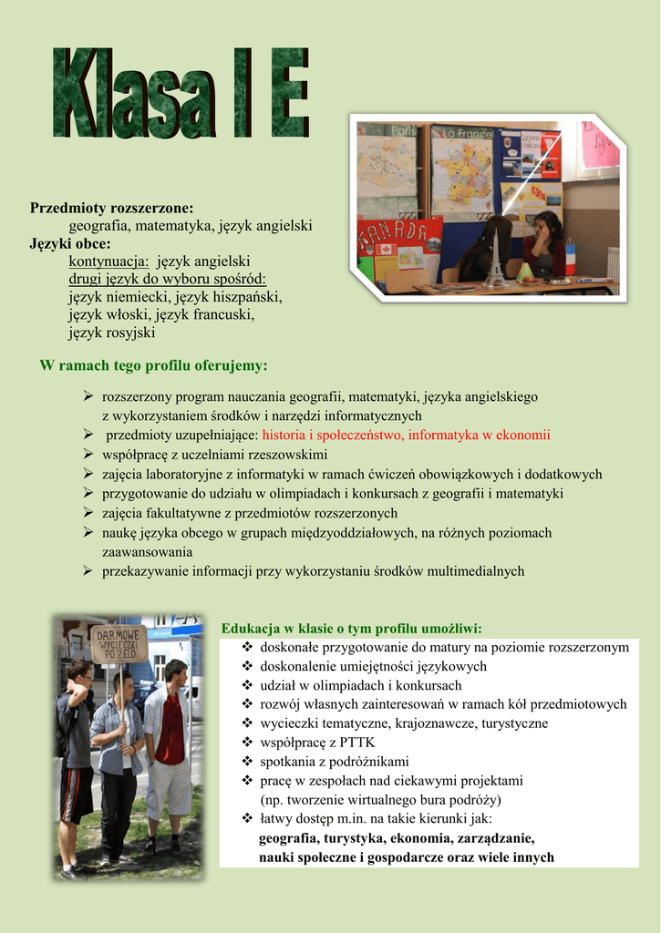 Przedmioty rozszerzone: geografia, matematyka, język angielski Języki obce: kontynuacja: język angielski drugi język do wyboru spośród: język niemiecki, język hiszpański, język włoski, język francuski, język rosyjski W ramach tego profilu oferujemy:  rozszerzony program nauczania geografii, matematyki, języka angielskiego        z wykorzystaniem środków i narzędzi informatycznych przedmioty uzupełniające: historia i społeczeństwo, informatyka w ekonomii współpracę z uczelniami rzeszowskimi zajęcia laboratoryjne z informatyki w ramach ćwiczeń obowiązkowych i dodatkowych przygotowanie do udziału w olimpiadach i konkursach z geografii i matematyki zajęcia fakultatywne z przedmiotów rozszerzonych naukę języka obcego w grupach międzyoddziałowych, na różnych poziomach zaawansowania przekazywanie informacji przy wykorzystaniu środków multimedialnych Edukacja w klasie o tym profilu umożliwi:  doskonałe przygotowanie do matury na poziomie rozszerzonym  doskonalenie umiejętności językowych  udział w olimpiadach i konkursach  rozwój własnych zainteresowań w ramach kół przedmiotowych  wycieczki tematyczne, krajoznawcze, turystyczne  współpracę z PTTK  spotkania z podróżnikami  pracę w zespołach nad ciekawymi projektami (np. tworzenie wirtualnego bura podróży)  łatwy dostęp m.in. na takie kierunki jak: geografia, turystyka, ekonomia, zarządzanie, nauki społeczne i gospodarcze oraz wiele innych