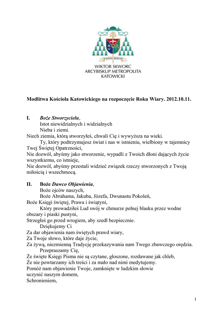 Modlitwa Kościoła Katowickiego na rozpoczęcie Roku Wiary. 2012.10.11. I. Boże Stworzycielu, Istot niewidzialnych i widzialnych Nieba i ziemi. Niech ziemia, którą stworzyłeś, chwali Cię i wywyższa na wieki. Ty, który podtrzymujesz świat i nas w istnieniu, wielbiony w tajemnicy Twej Świętej Opatrzności, Nie dozwól, abyśmy jako stworzenie, wypadli z Twoich dłoni dających życie wszystkiemu, co istnieje, Nie dozwól, abyśmy przestali widzieć związek rzeczy stworzonych z Twoją miłością i wszechmocą. II. Boże Dawco Objawienia, Boże ojców naszych, Boże Abrahama, Jakuba, Józefa, Dwunastu Pokoleń, Boże Księgi świętej, Prawa i świątyni, Który prowadziłeś Lud swój w chmurze pełnej blasku przez wodne obszary i piaski pustyni, Strzegłeś go przed wrogiem, aby szedł bezpiecznie. Dziękujemy Ci Za dar objawienia nam świętych prawd wiary, Za Twoje słowo, które daje życie, Za żywą, niezmienną Tradycję przekazywania nam Twego zbawczego orędzia. Przepraszamy Cię, Że święte Księgi Pisma nie są czytane, głoszone, rozdawane jak chleb, Że nie powtarzamy ich treści i za mało nad nimi medytujemy. Pomóż nam objawienie Twoje, zamknięte w ludzkim słowie uczynić naszym domem, Schronieniem, 1 I celem naszych dróg. Niech wszyscy, którzy nazywają się Twymi dziećmi, poznając Pismo Święte, Do syta nakarmią się Jego treścią, Pogłębią swoją wiarę, I zrozumieją, że bez znajomości Twoich wersetów, Nieśmiertelnych, zbawiennych i wyzwalających, Każde życie jest uschniętym figowcem, A śmierć bezowocna. III. Boże Odkupicielu, Zbawicielu nasz Gdy noc świata, w swym biegu, zbliżała się do połowy, rozdarłeś niebiosa i zstąpiłeś na ziemię. Stałeś się człowiekiem, dzieckiem pukającym do drzwi świata, synem Maryi i Józefa, cieśli z Nazaretu, poddanym ich woli. Nowonarodzony, którego najświętsze imię czczone jest w noc Bożego Narodzenia, Bądź uwielbiony w tajemnicy Bóstwa, które przyjęło ludzką naturę, Bądź uwielbiony w tajemnicy głoszonej Ewangelii, W tajemnicy Twych cudów i znaków, zapowiadających pełnię czasów. Z sercem włócznią przebitym: Bądź uwielbiony w tajemnicy Twojej męki, śmierci i zmartwychwstania, W tajemnicy Twego wniebowstąpienia. Dziękujemy Ci za to, że stałeś się nam tak bliski, że zamieszkałeś pośród nas dzieląc z nami los pielgrzymów, zdążających do niebiańskiej ojczyzny. Dziękujemy Ci za przykład synowskiego posłuszeństwa okazywanego Maryi i Józefowi, a nade wszystko Ojcu, który jest w Niebie. Dziękujemy za przykład pracy fizycznej, której nadałeś wartość odkupieńczą. Dziękujemy za Twoje Słowo, za objawienie w Nim niezgłębionej prawdy o Trójcy Przenajświętszej, o Bogu, który jest Miłością, Za nowe przykazanie, które jest i będzie naszym programem na życie i wieczność. Czczony w tajemnicy Eucharystii, Dziękujemy Ci za Twoje Ciało i Krew, w których pozostajesz z nami w naszych parafialnych wieczernikach aż do skończenia świata. Za Kościół, mistyczne Ciało, którego jesteś Głową, a my jego członkami, Za wszczepienie nas w Boską Winorośl w sakramencie Chrztu Świętego, Za dar wiary, dzięki któremu mieszkasz w naszych sercach, Za dar Bożego życia przywracany i umacniany w nas przez Twoje Słowo i Święte Sakramenty, Za przemianę naszej śmierci w paschę, która życie przemienia i uwydatnia, Za nieśmiertelność, której nadałeś nowy, pełen nadziei, sens. Nieraz wyrzucałeś swym najbliższym uczniom brak wiary, Dlatego, przypatrujemy się naszej, 2 Pytając, czy jest chociaż jak ziarnko gorczycy, Czy jest jak skarb lub drogocenna perła, dla których warto sprzedać wszystko, co posiadamy? Przepraszamy Cię, Królu Wszechświata z katowickiej katedry, Że dar wiary traktujemy nieraz jak ów sługa, co otrzymany talent zakopał w ziemi, Że nie pogłębiamy naszej wiary, pozwalając by zamieniła się w bezmyślną obrzędowość, Że zapominamy Tobie bezgranicznie ufać i Tobie wierzyć, Że ukrywamy wiarę w ścianach domu i w murach świątyni, a w życiu publicznym jej się wyrzekamy, Że wstydzimy się przyznać do Ciebie, gdy przychodzi czas świadectwa, Że lękamy się wyznać Ciebie przed ludźmi w obawie wyśmiania, towarzyskiego odrzucenia czy prześladowań, Że nie dzielimy się skarbem wiary z innymi, zwłaszcza z najbliższymi w domu, który przestaje być pierwszą szkołą wiary, Że dajemy zgorszenie słabym, którzy błądzą, widząc nasz brak konsekwencji i niestałość, I tak nie zauważamy, jak powoli stajemy się letnimi, gasząc w sobie światło wiary i tracąc jej radość. Panie, Dobry Pasterzu, dający życie za Owce, Strzeż nas przed rutyną i przeciętnością, które prowadzą do śmierci wiary, a sumienie zmuszają do milczenia. O, daj nam, Panie tomaszowe pragnienie wyznawania – Pan mój i Bóg mój! IV. Duchu Święty Boże, który nas uświęcasz i ożywiasz, Duchu Pocieszycielu, Bądź uwielbiony w tajemnicy stworzenia, kiedy unosiłeś się nad wodami, Bądź uwielbiony w tajemnicy odkupienia, kiedy spocząłeś nad Jordanem na Synu Człowieczym, Bądź uwielbiony w tajemnicy Twego zesłania na Apostołów pod postacią ognistych języków i wichru, Bądź uwielbiony w tajemnicy Kościoła, napełnionego Twymi rozlicznymi charyzmatami, z których największa jest Miłość, Bądź uwielbiony w tajemnicy ludzkiego serca, w którym rozlewasz łaskę synostwa Bożego, Bądź uwielbiony w tajemnicy modlitwy, której usta człowieka nie potrafią wyrazić. Dziękujemy Ci za owoce Twojego działania w tych, którzy są Ci posłuszni, za miłość, radość, pokój, cierpliwość, uprzejmość, dobroć, wierność, łagodność i opanowanie. Za wzrost naszej wiary, nadziei i miłości. Stworzycielu, Wywołujący z kości i popiołów 3 Ludzi zmartwychwstałych i przemienionych, Wybacz nam zatwardziałość serca i karku, Zawinioną przez grzech, głuchotę uszu i ś