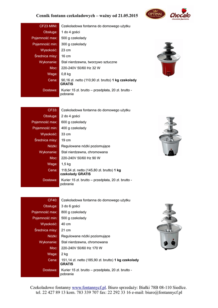 Cennik fontann czekoladowych – ważny od 21.05.2015 CF23 MINI: Obsługa: Czekoladowa fontanna do domowego użytku 1 do 4 gości Pojemność max: 500 g czekolady Pojemność min: 300 g czekolady Wysokość: 23 cm Średnica misy: 16 cm Wykonanie: Moc: Stal nierdzewna, tworzywo sztuczne 220-240V 50/60 Hz 32 W Waga: 0,8 kg Cena: 90,16 zł. netto (110,90 zł. brutto) 1 kg czekolady GRATIS Dostawa: CF33: Obsługa: Kurier 15 zł. brutto – przedpłata, 20 zł. brutto pobranie Czekoladowa fontanna do domowego użytku 2 do 4 gości Pojemność max: 600 g czekolady Pojemność min: 400 g czekolady Wysokość: 33 cm Średnica misy: 19 cm Nóżki: Wykonanie: Moc: Regulowane nóżki poziomujące Stal nierdzewna, chromowana 220-240V 50/60 Hz 90 W Waga: 1,5 kg Cena: 118,54 zł. netto (145,80 zł. brutto) 1 kg czekolady GRATIS Dostawa: CF40: Obsługa: Kurier 15 zł. brutto – przedpłata, 20 zł. brutto pobranie Czekoladowa fontanna do domowego użytku 3 do 6 gości Pojemność max: 800 g czekolady Pojemność min: 500 g czekolady Wysokość: 40 cm Średnica misy: 21 cm Nóżki: Wykonanie: Moc: Regulowane nóżki poziomujące Stal nierdzewna, chromowana 220-240V 50/60 Hz 170 W Waga: 2 kg Cena: 151,14 zł. netto (185,90 zł. brutto) 1 kg czekolady GRATIS Dostawa: Kurier 15 zł. brutto – przedpłata, 20 zł. brutto pobranie Czekoladowe fontanny www.fontannycf.pl. Biuro sprzedaży: Białki 78B 08-110 Siedlce. tel. 22 427 89 13 kom. 783 339 707 fax: 22 292 33 16 e-mail: [email protected] CF46: Obsługa: Czekoladowa fontanna do domowego użytku 3 do 10 gości Pojemność max: 1200 g czekolady Pojemność min: 700 g czekolady Wysokość: Średnica misy: Nóżki: Wykonanie: Moc: 46 cm 21,5 cm Regulowane nóżki poziomujące Stal nierdzewna, chromowana 220-240V 50/60 Hz 175 W Waga: 2,3 kg Cena: 216,18 zł. netto (265,90 zł. brutto) 1 kg czekolady GRATIS Dostawa: CF55: Obsługa: Kurier 15 zł. brutto – przedpłata, 20 zł. brutto pobranie Czekoladowa fontanna do domowego użytku 5 do 15 gości Pojemność max: 1400 g czekolady Pojemność min: 800 g czekolady Wysokość: Średnica misy: Nóżki: Wykonanie: Moc: 55 cm 21,5 cm Regulowane nóżki poziomujące Stal nierdzewna, chromowana 220-240V 50/60 Hz 180 W Waga: 2,5 kg Cena: 292,28 zł. netto (359,50 zł. brutto) 1 kg czekolady GRATIS Dostawa: CF40 TWIN M: Obsługa: Kurier 15 zł. brutto – przedpłata, 20 zł. brutto pobranie Półprofesjonalna fontanna czekoladowa 6 do 20 gości Pojemność max: 2x800 g czekolady Pojemność min: 500 g czekolady Wysokość: Szerokość misy: Długość misy: Nóżki: Wykonanie: Moc: Wymiary pudełka: 40 cm 21,5 cm 29 cm Regulowane nóżki poziomujące Stal nierdzewna, chromowana 220-240V 50/60 Hz 320 W 32X23x43 cm Waga: 3,5 kg Cena: 341,38 zł. netto (419,90 zł. brutto) 2 kg czekolady GRATIS (1 kg mlecznej i 1 kg białej) Dostawa: Kurier 15 zł. brutto – przedpłata, 20 zł. brutto - pobranie Czekoladowe fontanny www.fontannycf.pl. Biuro sprzedaży: Białki 78B 08-110 Siedlce. tel. 22 427 89 13 kom. 783 339 707 fax: 22 292 33 16 e-mail: [email protected] CF54 SPM: Obsługa: Półprofesjonalna fontanna czekoladowa 15 do 40 gości Pojemność max: 1,9 kg czekolady Pojemność min: 0,9 kg czekolady Wysokość: 54 cm Średnica misy: 23 cm Nóżki: Regulowane nóżki poziomujące Sterowanie: Niezależny włącznik grzałki/silnika Wykonanie: Misa: stal nierdzewna, chromowana Kolumna: stal nierdzewna, chromowana Świder: tworzywo sztuczne Moc: Zastosowanie: Ciągła praca: Wymiary pudełka: Waga: 220-240V 50/60 Hz 190 W Do komercyjnego wykorzystania Do 4 godz. pracy bez przerwy 37 x 36 x 27 cm 2,4 kg Cena: Czekolada: CF51 PRO: 2,5kg czekolady GRATIS Dostawa: Kurier 15 zł. brutto - przedpłata Dostawa: Kurier 20 zł. brutto - pobranie Profesjonalna fontanna czekoladowa Obsługa: 20 do 60 gości Pojemność max: 3 kg czekolady Pojemność min: 2 kg czekolady Wysokość: 51 cm Średnica misy: 33 cm Silnik: Wolnoobrotowy Nóżki: Regulowane nóżki poziomujące Sterowanie: 593,41 zł. netto (729,90 zł. brutto) Termostat regulowany 10 – 100 º C Niezależny włącznik grzałki/silnika Wykonanie: Moc: Stal nierdzewna, chromowana 220-240V 50/60 Hz 340 W Zastosowanie: Do komercyjnego wykorzystania Ciągła praca: Do 12 godz. pracy bez przerwy Wymiary pudełka: Waga: 38 x 38 x 53 cm 6,5 kg Cena: Czekolada: 1220 zł. netto (1500,60 zł. brutto) 2,5kg czekolady GRATIS Dostawa: Kurier 0 zł. - przedpłata Dostawa: Kurier 25 zł. brutto - pobranie Czekoladowe fontanny www.fontannycf.pl. Biuro sprzedaży: Białki 78B 08-110 Siedlce. tel. 22 427 89 13 kom. 783 339 707 fax: 22 292 33 16 e-mail: [email protected] CF65 PRO: Obsługa: Profesjonalna fontanna czekoladowa 40 do 100 gości Pojemność max: 5 kg czekolady Pojemność min: 2,5 kg czekolady Wysokość: 65 cm Średnica misy: 35 cm Silnik: Wolnoobrotowy Nóżki: Regulowane nóżki poziomujące Sterowanie: Termostat regulowany 10 – 100 º C Niezależny włącznik grzałki/silnika Wykonanie: Moc: Stal nierdzewna, chromowana 220-240V 50/60 Hz 390 W Zastosowanie: Do komercyjnego wykorzystania Ciągła praca: Do 12 godz. pracy bez przerwy Wymiary pudełka: Waga: 38 x 40 x 40 cm 10,2 kg Cena: Czekolada: CF75 PRO: Obsługa: 5 kg czekolady GRATIS Dostawa: Kurier 0 zł. - przedpłata Dostawa: Kurier 25 zł. brutto - pobranie Profesjonalna fontanna czekoladowa 50 do 130 gości Pojemność max: 6,5 kg czekolady Pojemność min: 2,5 kg czekolady Wysokość: 75 cm Średnica misy: 41 cm Silnik: Super Silent Nóżki: Regulowane nóżki poziomujące Sterowanie: 2420 zł. netto (2976,60 zł. brutto) Termostat regulowany 10 – 100 º C Niezależny włącznik grzałki/silnika Wykonanie: Moc: Stal nierdzewna, chromowana 220-240V 50/60 Hz 750 W Zastosowanie: Do komercyjnego wykorzystania Ciągła praca: Do 12 godz. pracy bez przerwy Wymiary pudełka: Waga: Wyposażenie: 64 x 53 x 49 cm 16 kg Specjalny CASE do przechowywania Cena: Czekolada: 4090 zł. netto (5030,70 zł. brutto) 7,5 kg czekolad