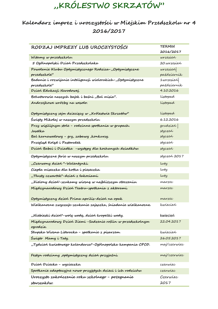 ,,KRÓLESTWO SKRZATÓW” Kalendarz imprez i uroczystości w Miejskim Przedszkolu nr 4 2016/2017 RODZAJ IMPREZY LUB UROCZYSTOŚCI TERMIN Witamy w przedszkolu. wrzesień 5 Ogólnopolski Dzień Przedszkolaka Powołanie Klubu Optymistycznego Rodzica-,,Optymistyczne przedszkole” Badanie i rozwijanie inteligencji wielorakich-,,Optymistyczne przedszkole” 2016/2017 20.wrzesień wrzesień| październik 1wrzesień| październik Dzień Edukacji Narodowej. 4.10.2016 Bohaterowie naszych bajek i baśni „Bal misia”. listopad Andrzejkowe wróżby na wesoło. listopad Optymistyczny sejm dziecięcy w ,,Królestwie Skrzatów” listopad Święty Mikołaj w naszym przedszkolu. 6.12.2016 Przy wigilijnym stole - rodzinne spotkania w grupach. grudzień | Jasełka styczeń Bal karnawałowy - gry, zabawy ,konkursy. styczeń Przegląd Kolęd i Pastorałek styczeń Dzień Babci i Dziadka -występy dla kochanych dziadków. styczeń Optymistyczne ferie w naszym przedszkolu. styczeń 2017 ,,Czerwony dzień "-Walentynki. luty Ciepła miseczka dla kotka i pieseczka. luty ,,Tłusty czwartek"-dzień z łakociami. luty ,,Zielony dzień'-szukamy wiosnę w najbliższym otoczeniu. marzec Międzynarodowy Dzień Teatru-spotkania z aktorami. marzec Optymistyczny dzień Prima aprilis-dzień na opak marzec Wielkanocne zwyczaje-szukanie zajączka, śniadanie wielkanocne. kwiecień ,,Niebieski dzień"-wolę wodę, dzień kropelki wody. kwiecień Międzynarodowy Dzień Ziemi -Sadzenie roślin w przedszkolnym 22.04.2017 ogrodzie. Słupska Wiosna Literacka - spotkanie z pisarzem. kwiecień Święto Mamy i Taty. 26.05.2017 ,,Tydzień kwiatowego kalendarza"-Ogólnopolska kampania CPCD. maj/czerwiec Festyn rodzinny ,optymistyczny dzień przyjaźni. maj/czerwiec Dzień Dziecka - wycieczka. czerwiec Spotkanie adaptacyjne nowo przyjętych dzieci i ich rodziców. czerwiec Uroczyste zakończenie roku szkolnego - pożegnanie Czerwiec starszaków. 2017