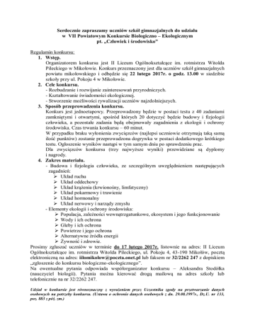 Serdecznie zapraszamy uczniów szkół gimnazjalnych do udziału w VII Powiatowym Konkursie Biologiczno – Ekologicznym pt. „Człowiek i środowisko” Regulamin konkursu: 1. Wstęp. Organizatorem konkursu jest II Liceum Ogólnokształcące im. rotmistrza Witolda Pileckiego w Mikołowie. Konkurs przeznaczony jest dla uczniów szkół gimnazjalnych powiatu mikołowskiego i odbędzie się 22 lutego 2017r. o godz. 13.00 w siedzibie szkoły przy ul. Pokoju 4 w Mikołowie. 2. Cele konkursu. - Rozbudzanie i rozwijanie zainteresowań przyrodniczych. - Kształtowanie świadomości ekologicznej. - Stworzenie możliwości rywalizacji uczniów najzdolniejszych. 3. Sposób przeprowadzenia konkursu. Konkurs jest jednoetapowy. Przeprowadzony będzie w postaci testu z 40 zadaniami zamkniętymi i otwartymi, spośród których 20 dotyczyć będzie budowy i fizjologii człowieka, a pozostałe zadania będą obejmowały zagadnienia z ekologii i ochrony środowiska. Czas trwania konkursu – 60 minut. W przypadku braku wyłonienia zwycięzców (najlepsi uczniowie otrzymają taką samą ilość punktów) zostanie przeprowadzona dogrywka w postaci dodatkowego krótkiego testu. Ogłoszenie wyników nastąpi w tym samym dniu po sprawdzeniu prac. Dla zwycięzców konkursu (trzy najwyższe wyniki) przewidziane są dyplomy i nagrody. 4. Zakres materiału. - Budowa i fizjologia człowieka, ze szczególnym uwzględnieniem następujących zagadnień: Układ ruchu Układ oddechowy Układ krążenia (krwionośny, limfatyczny) Układ pokarmowy i trawienie Układ hormonalny Układ nerwowy i narządy zmysłu - Elementy ekologii i ochrony środowiska: Populacja, zależności wewnątrzgatunkowe, ekosystem i jego funkcjonowanie Wody i ich ochrona Gleby i ich ochrona Powietrze i jego ochrona Alternatywne źródła energii Żywność i zdrowie. Prosimy zgłaszać uczniów w terminie do 17 lutego 2017r. listownie na adres: II Liceum Ogólnokształcące im. rotmistrza Witolda Pileckiego, ul. Pokoju 4, 43-190 Mikołów, pocztą elektroniczną na adres: [email protected] lub faksem nr 32/2262 247 z dopiskiem „zgłoszenie do konkursu biologiczno-ekologicznego”. Na ewentualne pytania odpowiada współorganizator konkursu – Aleksandra Stodółka (nauczyciel biologii). Pytania można kierować drogą mailową na adres szkoły lub telefonicznie na nr 32/2262 247. Udział w konkursie jest równoznaczny z wyrażeniem przez Uczestnika zgody na przetwarzanie danych osobowych na potrzeby konkursu. (Ustawa o ochronie danych osobowych z dn. 29.08.1997r., Dz.U. nr 133, poz. 883 z póź. zm.)
