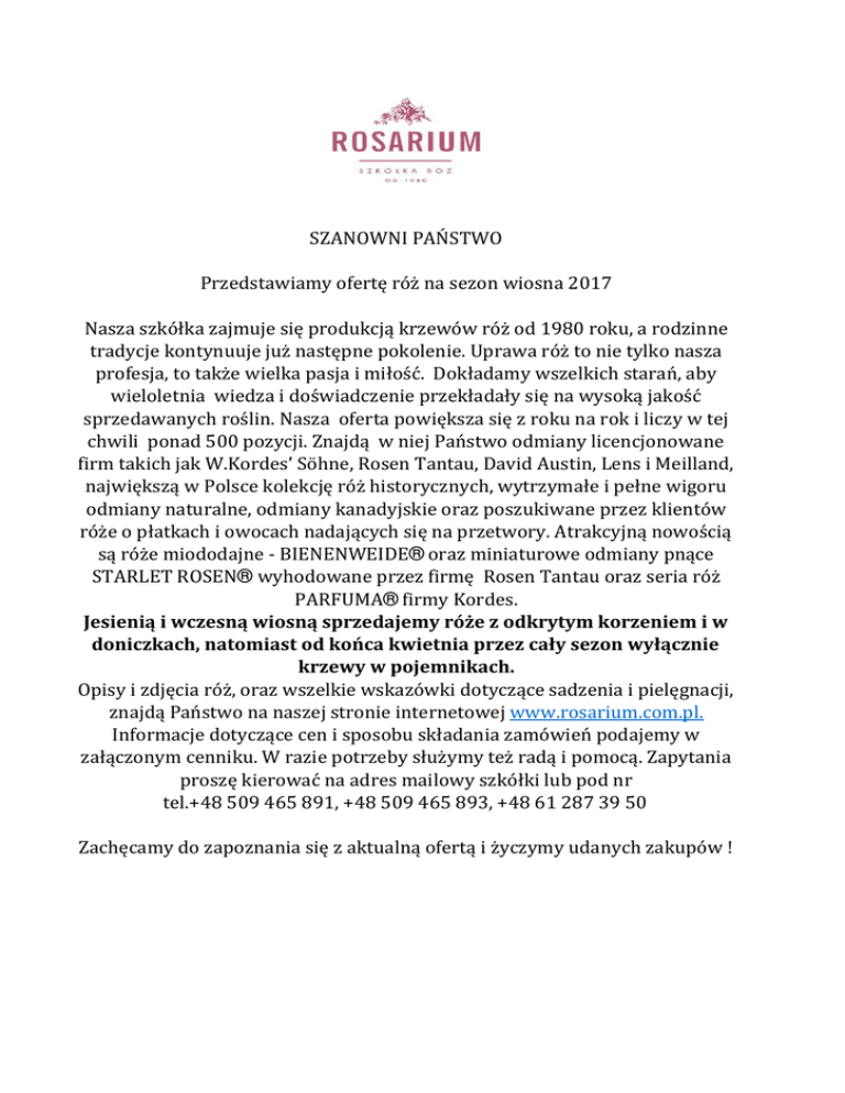 SZANOWNI PAŃSTWO Przedstawiamy ofertę róż na sezon wiosna 2017 Nasza szkółka zajmuje się produkcją krzewów róż od 1980 roku, a rodzinne tradycje kontynuuje już następne pokolenie. Uprawa róż to nie tylko nasza profesja, to także wielka pasja i miłość. Dokładamy wszelkich starań, aby wieloletnia wiedza i doświadczenie przekładały się na wysoką jakość sprzedawanych roślin. Nasza oferta powiększa się z roku na rok i liczy w tej chwili ponad 500 pozycji. Znajdą w niej Państwo odmiany licencjonowane firm takich jak W.Kordes’ Söhne, Rosen Tantau, David Austin, Lens i Meilland, największą w Polsce kolekcję róż historycznych, wytrzymałe i pełne wigoru odmiany naturalne, odmiany kanadyjskie oraz poszukiwane przez klientów róże o płatkach i owocach nadających się na przetwory. Atrakcyjną nowością są róże miododajne - BIENENWEIDE® oraz miniaturowe odmiany pnące STARLET ROSEN® wyhodowane przez firmę Rosen Tantau oraz seria róż PARFUMA® firmy Kordes. Jesienią i wczesną wiosną sprzedajemy róże z odkrytym korzeniem i w doniczkach, natomiast od końca kwietnia przez cały sezon wyłącznie krzewy w pojemnikach. Opisy i zdjęcia róż, oraz wszelkie wskazówki dotyczące sadzenia i pielęgnacji, znajdą Państwo na naszej stronie internetowej www.rosarium.com.pl. Informacje dotyczące cen i sposobu składania zamówień podajemy w załączonym cenniku. W razie potrzeby służymy też radą i pomocą. Zapytania proszę kierować na adres mailowy szkółki lub pod nr tel.+48 509 465 891, +48 509 465 893, +48 61 287 39 50 Zachęcamy do zapoznania się z aktualną ofertą i życzymy udanych zakupów ! Róże naturalne (dzikie) i ich mieszańce: l.p. Odmiana Barwa kwiatów Wielkość i rodzaj kwiatów Zapach Kwitnienie Wys./ Szer. [m] Mrozoodporność ++ 1x, V 2,0 – 2,5 / 1,8 - 3,0 -35ºC 8-10 cm, pełne ++++ powtarza 2,0 - 3,0 / 2,0 -30°C miedzianożółta 12 cm, półpełne +++ powtarza 1,5 - 2,5 / 2,0 -34°C 4 Fimbriata biała z różowym cieniem 6 - 7 cm, półpełne +++ powtarza 1,2 - 1,5 / 1,2 -30°C 5 Harison’s Yellow złotożółta 6 – 7 cm, półpełne ++ 1x, V/VI 1,2 – 2,0 / 1,5 -30°C 6 Juhannusruusu białokremowa 4 - 7 cm, podwójne +++ 1x, VI/VII 1,5 / 0,7 -34°C 7 Karpatia ( Rosa pomifera) różowa 4 - 6 cm, pojedyncze - 1x V/VI 2,0 / 1,5 -34°C Kazanlik (Rosa damascena 8 'Trigintipetala') jasnoróżowa 5 cm, półpełne ++++ 1x, VI 1,5 – 2,0 / 1,2 - 1,8 -32ºC 9 Rosa californica jasnoróżowa 4-5 cm, pojedyncze ++++ 1x, IV-V 1,0 - 2,0 / 1,5 -32ºC 10 Rosa canina, róża dzika białoróżowa 3 - 4 cm, pojedyncze +++ 1x, V 2,0 – 3,0 / 2,0 - 3,0 -32°C 11 Rosa damascena ‘Koszuty’ różowa 6- 8 cm, pełne ++++ 1x, VI 1,2 – 1,5 / 1,5 -32ºC Rosa hugonis (Rosa xiantina f. 12 hugonis) siarkowożółta 5 cm, pojedyncze - 1x, V 1,0 - 3,0 / 1,5 - 3,0 -32ºC 13 Rosa pendulina ‘Harstad’ ciemnoróżowa 4 cm, pojedyncze ++ 1x, VI 2,5 / 2,0 -32°C 1 Canary Bird (Rosa xanthina) żółta 4 cm, pojedyncze 2 Conrad Ferdinand Meyer srebrzystoróżowa 3 Dr Eckkner Dostępność odkryty Dodatkowe informacje korzeń/donicz ka Jedna z najwcześniej kwitnących odmian, pokryta ogromną ilością niewielkich, kanarkowych kwiatów, wygląda wręcz zjawiskowo. Wspaniała odmiana o przepięknych, słodko pachnących odkryty kwiatach, tworzy okazałe, kolczaste krzewy o korzeń / czerwonawych pędach, drugie kwitnienie często bardziej doniczka efektowne, choć mniej obfite. Mieszaniec Rosa rugosa , tworzy masywne, silne, odkryty kolczaste krzewy. Kuliste, półpełne kwiaty tej odmiany o korzeń / zapachu róż stulistnych, mają tendencję do różowienia. doniczka Odmiana nadająca się na zwarte żywopłoty. Krzepka i zdrowa odmiana, mieszaniec Rosa rugosa, o kwiatach postrzępionych, przypominających goźdzki. Kwitnienie powtarza umiarkowanie i ma niewielkie doniczka wymagania. Bardzo odporna na złe gleby, kwitnie wcześnie, nadzwyczaj obficie, okrywając się niezliczoną ilością uroczych, wiosennych kwiatów. nie ma R.spinosissima pochodząca z Finlandii, dokąd trafiła przed 1800 r z carskiej Rosji, niezwykle popularna i lubiana w tym kraju ze względu na niewielkie wymagania nie ma i wczesne, obfite i prześliczne kwitnienie. odkryty Róża jabłkowata, o nieprzeciętnie dużych, bardzo korzeń / wartościowych owocach, bogatych w witaminy. Wcześnie doniczka i obficie plonująca, doskonała na przetwory. Bułgarska róża olejkowa, pochodząca sprzed 1612 r., uprawiana w dolinie Kazanłyk do produkcji olejku odkryty różanego, o niezwykle intensywnym zapachu, łatwa w korzeń / doniczka uprawie, dość odporna na mróz i choroby. Wyjątkowo żywotna i odporna odmiana, o kwiatach pachnących cynamonem i goździkami; jej owoce są odkryty bogatym źródłem wit. A, C i E, flawonoidów i innych korzeń / aktywnych biologicznie związków blokujących rozwój doniczka komórek nowotworowych. odkryty Róża dzika znana jako szypszyna, lub 'róża psia', kwitnie korzeń / bardzo obficie w kwietniu; owoce nadają się na wina i doniczka nalewki. odkryty Róża znaleziona w starym parku przy Muzeum Ziemi korzeń / Średzkiej w Koszutach, łączy wszystkie walory róż doniczka damasceńskich przy doskonałej odporności na mróz. odkryty Dzika róża pochodząca z Chin, jedna z nawcześniej korzeń / kwitnących w naszym klimacie, wygląda zjawiskowo, doniczka obsypana masą subtelnych, żółtych kwiatów. odkryty Róża alpejska, bardzo odporna na mróz; ciekawa ze korzeń / don. względu na dekoracyjne, czerwone pędy i owoce. nie ma 2 Rosa pteragonis (The 14 Cambridge Rose) jasnożółta z kremowym oczkiem 5 cm, pojedyncze ++ 15 Rosa roxburghii białolilioworóżowa 7 – 8 cm, pojedyncze 16 Rosa rubiginosa, róża dzika różowy 4-5 cm, pojedyncze Rosa rubrifolia ‘Nova’ ( syn. 17 Rosa glauca) ciemnoróżowa 18 Rosa rugosa 'Adam Chodun' 19 Rosa rugosa 'Agnes' 20 Rosa rugosa 'Belle Poitevine' 1x, V 2,0 - 5,0 / 2,5 - 3,0 