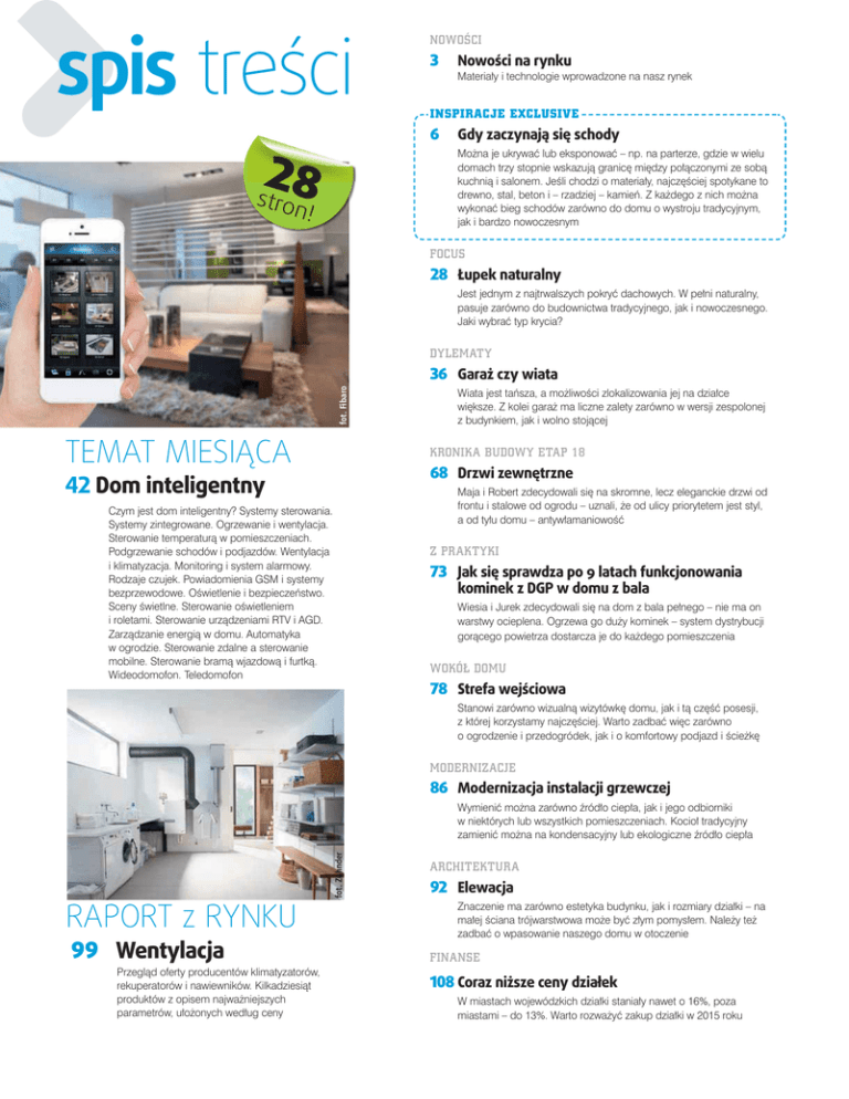 spis treści 3 INSPIRACJE EXCLUSIVE 6 2 8 stro Nowości na rynku 1 0 * Gdy zaczynają się schody 1/*2*23, * 4 40 * 5 0,4 * ,, 3 3* !)*/ / *2 , jak i bardzo nowoczesnym n! 28 Łupek naturalny 5*20 , ,* 5* 2* 6 DYLEMATY fot. Fibaro 36 Garaż czy wiata TEMAT MIESIĄCA !,/ * 0 4*)* / " * ,* 68 Drzwi zewnętrzne 42 Dom inteligentny 1 # 4*,* + 3 ,/ , 030 2 Czym jest dom inteligentny? Systemy sterowania. Systemy zintegrowane. Ogrzewanie i wentylacja. i klimatyzacja. Monitoring i system alarmowy. Rodzaje czujek. Powiadomienia GSM i systemy ! " #$% &'( ) &* w ogrodzie. Sterowanie zdalne a sterowanie +* +$+ 73 Jak się sprawdza po 9 latach funkcjonowania kominek z DGP w domu z bala 5* 403 /* *3 */ 78 Strefa wejściowa *4,* 42 , **4 2 4 " *,* *+ /*4 86 Modernizacja instalacji grzewczej RAPORT z RYNKU 99 Wentylacja +* , * *- * * / ,0/0 fot. Zehnder 2/70 0,* * ** - 0 2/** 70 0 92 Elewacja ) **,* 0* 3 0 /2008// 2 108 Coraz niższe ceny działek * 0* 09:;, 39<;/2* 0* =>9@*