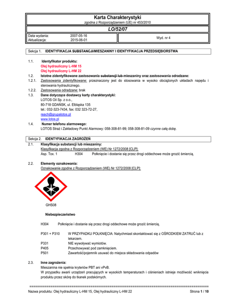 Karta Charakterystyki zgodna z Rozporządzeniem (UE) nr 453/2010 LO/52/07 Data wydania: Aktualizacja: 2007-05-16 2015-06-01 Wyd. nr 4 Sekcja 1. IDENTYFIKACJA SUBSTANCJI/MIESZANINY I IDENTYFIKACJA PRZEDSIĘBIORSTWA 1.1. 1.2. 1.2.1. 1.2.2. 1.3. 1.4. Identyfikator produktu: Olej hydrauliczny L-HM 15 Olej hydrauliczny L-HM 22 Istotne zidentyfikowane zastosowania substancji lub mieszaniny oraz zastosowania odradzane: Zastosowania zidentyfikowane: przeznaczony jest do stosowania w wysoko obciążonych układach napędu i sterowania hydraulicznego. Zastosowania odradzane: brak Dane dotyczące dostawcy karty charakterystyki: LOTOS Oil Sp. z o.o., 80-718 GDAŃSK, ul. Elbląska 135 tel.: 032-323-7434, fax: 032 323-72-27, [email protected] www.lotos.pl Numer telefonu alarmowego: LOTOS Straż i Zakładowy Punkt Alarmowy: 058-308-81-99; 058-308-81-09 czynne całą dobę. Sekcja 2. IDENTYFIKACJA ZAGROŻEŃ 2.1. Klasyfikacja substancji lub mieszaniny: Klasyfikacja zgodna z Rozporządzeniem (WE) Nr 1272/2008 [CLP]: Asp. Tox. 1 H304 Połknięcie i dostanie się przez drogi oddechowe może grozić śmiercią. 2.2. Elementy oznakowania: Oznakowanie zgodne z Rozporządzeniem (WE) Nr 1272/2008 [CLP]: GHS08 Niebezpieczeństwo H304 Połknięcie i dostanie się przez drogi oddechowe może grozić śmiercią. P301 + P310 P331 P405 P501 2.3. W PRZYPADKU POŁKNIĘCIA: Natychmiast skontaktować się z OŚRODKIEM ZATRUĆ lub z lekarzem. NIE wywoływać wymiotów. Przechowywać pod zamknięciem. Zawartość/pojemnik usuwać do miejsca składowania odpadów Inne zagrożenia: Mieszanina nie spełnia kryteriów PBT ani vPvB. W przypadku awarii urządzeń pracujących w wysokich temperaturach i ciśnieniach istnieje możliwość wniknięcia produktu przez skórę do tkanek podskórnych. ============================================================================================== Nazwa produktu: Olej hydrauliczny L-HM 15, Olej hydrauliczny L-HM 22 Strona 1 / 10 Karta Charakterystyki zgodna z Rozporządzeniem (UE) nr 453/2010 LO/52/07 Data wydania: Aktualizacja: 2007-05-16 2015-06-01 Wyd. nr 4 Podczas prac z gorącym produktem istnieje niebezpieczeństwo oparzeń termicznych. Produkt może powodować podrażnienie układu oddechowego w przypadku, gdy występuje w postaci mgły olejowej lub w postaci gorących oparów, lub po połknięciu. Badania przeprowadzone dla podobnych produktów nie wykazały działań szkodliwych dla oczu lub wykazały występowanie lekkich podrażnień. Sekcja 3. SKŁAD / INFORMACJA O SKŁADNIKACH 3.1. Substancje: nie dotyczy 3.2. Mieszaniny: Numer Stężenie [%m/m] rejestracji CAS WE 01-211947487816-0000 72623-86-0 276-737-9 ≤ 45,00 Nazwa substancji Oleje smarowe (ropa naftowa), hydrorafinowane węglowodory C15-30, obojętny olej bazowy Olej bazowy – niespecyfikowany Klasyfikacja substancji zgodnie z Rozp. nr 1272/2008 Asp. Tox. 1, H304 Sekcja 4. ŚRODKI PIERWSZEJ POMOCY 4.1. Opis środków pierwszej pomocy: Przez drogi oddechowe: Wdychanie jest mało prawdopodobne ze względu na niską prężność par substancji w temperaturze otoczenia. Objawy: podrażnienie dróg oddechowych wywołane nadmiernym narażeniem na wyziewy, mgły lub opary. W przypadku objawów spowodowanych wdychaniem wyziewów, mgieł lub oparów produktu: O ile jest to bezpieczne, przenieść poszkodowanego do spokojnego i dobrze wentylowanego miejsca. Jeśli poszkodowany jest nieprzytomny i: - Poszkodowany nie oddycha - Upewnić się, czy nie ma przeszkód w oddychaniu i zapewnić sztuczne oddychanie w wykonaniu przeszkolonego personelu. W razie konieczności wykonać masaż serca i uzyskać pomoc medyczną. - W przypadku, gdy poszkodowany oddycha - Umieścić poszkodowanego w pozycji bezpiecznej. W razie potrzeby podać tlen. W przypadku utrzymujących się trudności z oddychaniem zwrócić się do lekarza. W przypadku kontaktu ze skórą: Objawy: sucha skóra, podrażnienie w przypadku powtarzającego się lub przedłużającego narażenia. W przypadku zetknięcia się z produktem o wysokiej temperaturze może dojść do oparzeń. Zdjąć skażoną odzież oraz obuwie i pozbyć się ich w sposób bezpieczny. Umyć skażoną część ciała wodą z mydłem. W przypadku wystąpienia i utrzymywania się podrażnienia, obrzmienia lub zaczerwienienia skóry zwrócić się do lekarza. Podczas stosowania urządzeń wysokociśnieniowych może dojść do wstrzyknięcia przezskórnego. W przypadku obrażeń spowodowanych wysokim ciśnieniem niezwłocznie zwrócić się o pomoc medyczną. Nie czekać na pogłębienie się objawów. Lekkie poparzenia należy schłodzić: Trzymać poparzoną część ciała pod strumieniem zimnej wody przez przynajmniej pięć minut lub do momentu zelżenia bólu. Koniecznie zapobiec hipotermii. Nie okładać oparzeń lodem. Ostrożnie zdjąć nieprzywierającą odzież. NIE WOLNO próbować usuwać części odzieży przyklejonych do poparzonej skóry. Należy odcinać odzież wokół tych miejsc. W każdym przypadku poważnego oparzenia zwrócić się do lekarza. ============================================================================================== Nazwa produktu: Olej hydrauliczny L-HM 15, Olej hydrauliczny L-HM 22 Strona 2 / 10 Karta Charakterystyki zgodna z Rozporządzeniem (UE) nr 453/2010 LO/52/07 Data wydania: Aktualizacja: 2007-05-16 2015-06-01 Wyd. nr 4 Po dostaniu się do oczu: Objawy: nieznaczne podrażnienie. W przypadku zetknięcia się z produktem o wysokiej temperaturze może dojść do oparzeń. Ostrożnie przepłukiwać wodą przez kilka minut. Jeśli to możliwe i łatwe do wykonania, wyjąć poszkodowanemu soczewki kontaktowe. Kontynuować płukanie. W przypadku wystąpienia i utrzymywania się podrażnienia, niewyraźnego widzenia lub obrzęku, należy zwrócić się do specjalisty. W przypadku zachlapania oka gorącym produktem, należy je niezwłocznie schłodzić pod strumieniem zimnej, bieżącej wody, aby rozproszyć nagromadzone ciepło. Niezwłocznie zwrócić si