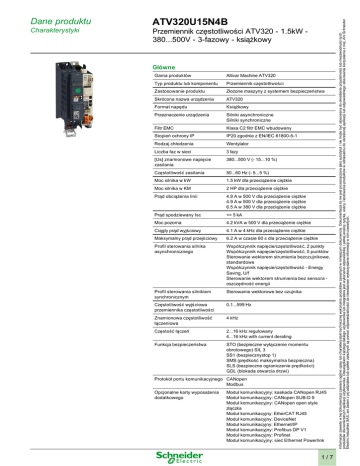 ATV320U15N4B Charakterystyki Przemiennik częstotliwości ATV320 - 1.5kW 380...500V - 3-fazowy - książkowy Główne Gama produktów Altivar Machine ATV320 Typ produktu lub komponentu Przemiennik częstotliwości Zastosowanie produktu Złożone maszyny z systemem bezpieczeństwa Skrócona nazwa urządzenia ATV320 Format napędu Książkowy Przeznaczenie urządzenia Silniki asynchroniczne Silniki synchroniczne Filtr EMC Klasa C2 filtr EMC wbudowany Stopień ochrony IP IP20 zgodnie z EN/IEC 61800-5-1 Rodzaj chłodzenia Wentylator Liczba faz w sieci 3 fazy [Us] znamionowe napięcie zasilania 380...500 V (- 15...10 %) Częstotliwość zasilania 50...60 Hz (- 5...5 %) Moc silnika w kW 1.5 kW dla przeciążenie ciężkie Moc silnika w KM 2 HP dla przeciążenie ciężkie Prąd obciążenia linii 4.9 A w 500 V dla przeciążenie ciężkie 4.9 A w 500 V dla przeciążenie ciężkie 6.5 A w 380 V dla przeciążenie ciężkie Prąd spodziewany Isc <= 5 kA Moc pozorna 4.2 kVA w 500 V dla przeciążenie ciężkie Ciągły prąd wyjściowy 4.1 A w 4 kHz dla przeciążenie ciężkie Maksymalny prąd przejściowy 6.2 A w czasie 60 s dla przeciążenie ciężkie Profil sterowania silnika asynchronicznego Współczynnik napięcie/częstotliwość, 2 punkty Współczynnik napięcie/częstotliwość, 5 punktów Sterowanie wektorem strumienia bezczujnikowe, standardowe Współczynnik napięcie/częstotliwość - Energy Saving, U/f Sterowanie wektorem strumienia bez sensora oszczędność energii Profil sterowania silnikiem synchronicznym Sterowanie wektorowe bez czujnika Częstotliwość wyjściowa przemiennika częstotliwości 0.1...599 Hz Znamionowa częstotliwość łączeniowa 4 kHz Częstość łączeń 2...16 kHz regulowany 4...16 kHz with current derating Funkcja bezpieczeństwa STO (bezpieczne wyłączenie momentu obrotowego) SIL 3 SS1 (bezpiecznystop 1) SMS (prędkość maksymalna bezpieczna) SLS (bezpieczne ograniczenie prędkości) GDL (blokada otwarcia drzwi) Protokół portu komunikacyjnego CANopen Modbus Opcjonalne karty wyposażenia dodatkowego Moduł komunikacyjny: kaskada CANopen RJ45 Moduł komunikacyjny: CANopen SUB-D 9 Moduł komunikacyjny: CANopen open style złączka Moduł komunikacyjny: EtherCAT RJ45 Moduł komunikacyjny: DeviceNet Moduł komunikacyjny: Ethernet/IP Moduł komunikacyjny: Profibus DP V1 Moduł komunikacyjny: Profinet Moduł komunikacyjny: sieć Ethernet Powerlink 1/7 Informacje zawarte w tej dokumentacji zawiera ogólne opisy lub charakterystyki technicznej wykonania produktów zawartych w niniejszym dokumencie. Dokumentacja ta nie jest przeznaczona jako substytut i nie może być stosowana do określenia przydatności lub niezawodności tych produktów dla konkretnych aplikacji użytkownika. Obowiązkiem każdego takiego użytkownika lub integratora jest wykonanie odpowiedniej i pełnej analizy ryzyka, oceny i testowania produktów w odniesieniu do określonej aplikacji lub odpowiedniego stosowania korzystania z niej .Ani Schneider Electric Industries SAS, ani żaden z jej oddziałów lub spółek zależnych są ponosi odpowiedzialności za niewłaściwe wykorzystanie informacji w nim zawartych. Dane produktu Uzupełnienie Napięcie wyjściowe <= napięcia zasilania Dopuszczalny tymczasowy udar prądowy 1.5 x In w czasie 60 s dla przeciążenie ciężkie Zakres prędkości 1...100 z silnik asynchroniczny w trybie otwartej pętli Dokładność prędkości +/- 10 % znamionowego poślizgu 0,2 Tn do Tn Dokładność momentu +/- 15 % Przejściowe przeciążenie momentem 170...200 % znamionowego prądu silnika Moment hamujący < 170 % z rezystorem hamującym w czasie 60 s Pętla regulacji Regulator PID ze zmianą nastaw Kompensacja poślizgu silnika Automatyczne bez względu na obciążenie Niedostępny w stosunku napięcie/częstotliwość (2 lub 5 punktów) Regulowane 0...300 % Rampy przyspieszania i zwalniania S U CUS Automatyczne zatrzymanie rampy zwalniania - zasilenie DC Adaptacja rampy zwalniania Liniowy Przełączanie rampy Hamowanie do zatrzymania Przez wstrzykiwanie prądu stałego (DC) Rodzaj zabezpieczenia Przemiennik częstotliwości: zabezpieczenie cieplne Przemiennik częstotliwości: przetężenie między fazami wyjściowymi a ziemią Przemiennik częstotliwości: wyłączenia faz na wejściu Przemiennik częstotliwości: zabezpieczenie przed przegrzaniem Przemiennik częstotliwości: zwarcie między fazami silnika Rozdzielczość częstotliwości Zespół wyświetlacza: 0,1 Hz Wejście analogowe: 0.012/50 Hz Przyłącza elektryczne Sterowanie, zacisk śrubowy: 0.5...1.5 mm² AWG 20...AWG 16 Resyztor napędowy/hamujacy, zacisk śrubowy: 1.5...2.5 mm² AWG 14...AWG 12 Zasilanie, zacisk śrubowy: 1.5...4 mm² AWG 14...AWG 10 Typ konektora 1 RJ45 dla Modbus/CANopen na przednim panelu Interfejs fizyczny 2-przewodowe RS 485 dla Modbus Ramka transmisji RTU dla Modbus Prędkość transmisji 4.8, 9.6, 19.2, 38.4 kbit/s dla Modbus 50 kbps, 125 kbps, 250 kbps, 500 kbps, 1 Mbps dla CANopen Format danych 8 bitów, konfigurowalne nieparzyste, parzyste lub bez parzystości dla Modbus Rodzaj polaryzacji Bez impedancji dla Modbus Liczba adresów 1...247 dla Modbus 1...127 dla CANopen Sposób dostępu Urządzenie slave dla CANopen Zasilanie Zasilanie wewnętrzne potencjometru odniesiena (1 do 10 kΩ): 10.5 V DC (+/- 5 %) stała <= 10 mA (zabezpieczenie przeciążeniowe i zwarciowe) Sygnalizacja lokalna 1 LED czerwony dla napięcie napędu 1 LED zielony dla CANopen działa 1 LED zielony dla CANopen działa 1 LED czerwony dla błąd CANopen 1 LED czerwony dla błąd napędu Szerokość 45 mm Wysokość 325 mm Głębokość 245 mm Masa produktu 2.5 kg Numer wejścia analogowego 3 Typ wejścia analogowego Napięcie (AI1): 0...10 V prąd stały (DC), impedancja 30000 om, rozdzielczość 10 bitów Bipolarne napięcie różnicowe (AI2): +/- 10 V prąd stały (DC), impedancja 30000 om, rozdzielczość 10 bitów Prąd (AI3): 0...20 mA (or 4-20 mA, x-20 mA, 20-x mA lub inne konfigura
