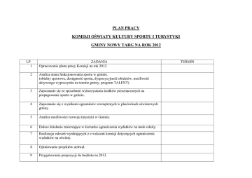 PLAN PRACY KOMISJI OŚWIATY KULTURY SPORTU I TURYSTYKI GMINY NOWY TARG NA ROK 2012 LP 1 ZADANIA Opracowanie planu pracy Komisji na rok 2012. 2 Analiza stanu funkcjonowania sportu w gminie. (obiekty sportowe, dostępność sportu, dyspozycyjność obiektów, możliwość aktywnego wypoczynku na terenie gminy, program TALENT) 3 Zapoznanie się ze sposobami wykorzystania środków przeznaczonych na propagowanie sportu w gminie. 4 Zapoznanie się z wynikami egzaminów zewnętrznych w placówkach oświatowych gminy. 5 Analiza możliwości rozwoju turystyki w Gminie. 6 Dalsze działania zmierzające w kierunku ograniczenia wydatków na małe szkoły. 7 Realizacja zaleceń wynikających z e wskazań komisji dotyczących ograniczenia wydatków na oświatę. 8 Opiniowanie projektów uchwał. 9 Przygotowanie propozycji do budżetu na 2013. TERMIN Ramowy plan pracy Komisji Zdrowia, Ochrony Środowiska i Porządku Publicznego na rok 2012 Założenia ogólne: 1. Komisja w celu realizacji przyjętego planu działania zbierać się będzie co najmniej raz w miesiącu. Lp. Zakres działania Zadanie do realizacji 1. Zadania stałe 1. Opiniowanie projektów uchwał na sesje Rady Gminy 2. 2. Opiniowanie i rozpatrywanie spraw przekazanych Komisji przez Radę, Wójta lub inne komisje. Zadania z zakresu 1. Analiza bieżącego funkcjonowania opieki zdrowotnej na terenie Ochrony Zdrowia 3. Gminy. Wypracowanie wniosków w celu dalszego rozwoju ochrony zdrowia. 2. Przeprowadzenie analizy zakresu działania pełnomocnika ds. profilaktyki rozwiązywania problemów alkoholowych i narkomanii oraz Gminnego Ośrodka Pomocy Społecznej. 3. Ustalenie i wspieranie najbardziej skutecznych metod profilaktyki uzależnień ze szczególnym uwzględnieniem ograniczenia narkomanii i innych uzależnień. Wspieranie skutecznych kierunków działania w ramach zadań Gminnego Ośrodka Pomocy Społecznej. Zadania z zakresu 1.1. Przeanalizowanie gospodarki odpadami na terenie gminy Ochrony Wypracowanie wniosków zmierzających do poszerzenia zakresu Środowiska segregacji odpadów z uwzględnieniem nowej ustawy o utrzymaniu czystości i porządku w gminach. 1.2. Formułowanie wniosków i opinii dotyczących gospodarki ściekami z uwzględnieniem modernizacji i rozwoju urządzeń kanalizacyjnych. 2. Prowadzenie działań organizacyjnych zmierzających do ograniczenia emisji zanieczyszczeń do atmosfery. Przewidywany termin realizacji 31.12.2012 Osoby, instytucje organizacje współdziałające Przew. Rady Kier. Urzędu 31.12.2012 I kwartał 2012 IV kwartał 2012 *Dyrektor Gminnego Zespołu Ośrodków II kwartał 2012 *Pełnomocnik ds. uzależnień. *Kierownik GOPS II kwartał 2012 *Pełnomocnik ds. III kwartał 2012 uzależnień. *Kierownik GOPS I kwartał 2012 *Pod. Przedsiębiorstwo III kwartał 2012 Komunalne. *Komendant Straży Gminnej II kwartał 2012 *Pod. Przedsiębiorstwo III kwartał 2012 Komunalne. II kwartał 2012 III kwartał 2012 Lp. Zakres działania Zadanie do realizacji Przewidywany termin realizacji 31.12.2012 Osoby, instytucje organizacje współdziałające Gminny ZOSP. Prezes Zarządu ZOSP. II kwartał 2012 *Komendant Straży Gminnej. *Komenda Pow. Policji. I kwartał 2012 *Powiatowy Zarząd III kwartał 2012 Dróg. *Komeda Pow. Policji. 31.12.2012 *Regionalny Zarząd Gospodarki Wodnej. Sołtysi wsi 4. Zadania z zakresu Porządku Publicznego i Bezpieczeństwa 1. Prowadzenie działań zmierzających do umocnienia i dalszego rozwoju Ochotniczych Straży Pożarnych działających na terenie Gminy 2. Prowadzenie analizy bezpieczeństwa imprez i uroczystości oraz bezpieczeństwa w szkołach podstawowych i gimnazjach. Wypracowanie wniosków zmierzajacych do poprawy stanu bezpieczeństwa na terenie Gminy. 3. Zebranie informacji o stanie bezpieczeństwa na drogach. Wytyczenie kierunków działań organizacyjnych zmierzających do poprawy bezpieczeństwa w ruchu pieszym i samochodowym. 4. Formułowanie wniosków obejmujących działania zmierzające do ograniczenia zagrożeń ze strony wód powodziowych. Zadania dodatkowe 1. Komisja zamierza nawiązać współpracę z merytorycznymi komisjami Rady Gminy: Bukowina Tatrzańka, Łapsze Wyżne, w zakresie podanym poniżej: *Bukowina Tatrzańska - stan ochrony przed zanieczyszczeniam wód potoku Białka. *Łapsze Wyżne - zabezpieczenie przed wodami powodziowymi. Opracował: Przewodniczący Komisji Paweł Długi Plan Pracy Komisji Budownictwa i Gospodarki Komunalnej na 2012 r. LP ZADANIA 1 Opiniowanie materiałów i uchwał na sesje Rady Gminy Nowy Targ 2 Zorganizowanie i przeprowadzenie Komisji na teren miejscowości Gminy Nowy Targ w celu wyboru inwestycji. 3 Opiniowanie podziału środków na drogi gminne. 4 Weryfikacja stanu dróg gminnych i oświetlenia. 5 Opiniowanie wniosków do budżetu Gminy na 2013r. TERMIN Plan Pracy Komisji Rolnictwa, Finansów i Handlu na 2012 r. LP 1 ZADANIA Opiniowanie uchwał na sesję. TERMIN I Półrocze 2 Analiza wykonania budżetu za 2011r. I Półrocze 3 Opracowanie mechanizmu wypłaty diet dla sołtysów oraz radnych. I Półrocze 4 Opiniowanie uchwał na sesję. II Półrocze 5 Analiza wykonania budżetu za I półrocze 2012r. II Półrocze 6 Rozpatrywanie wniosków poszczególnych komisji do budżetu gminy na 2013 r. II Półrocze 7 Opiniowanie budżetu na 2013 r. II Półrocze