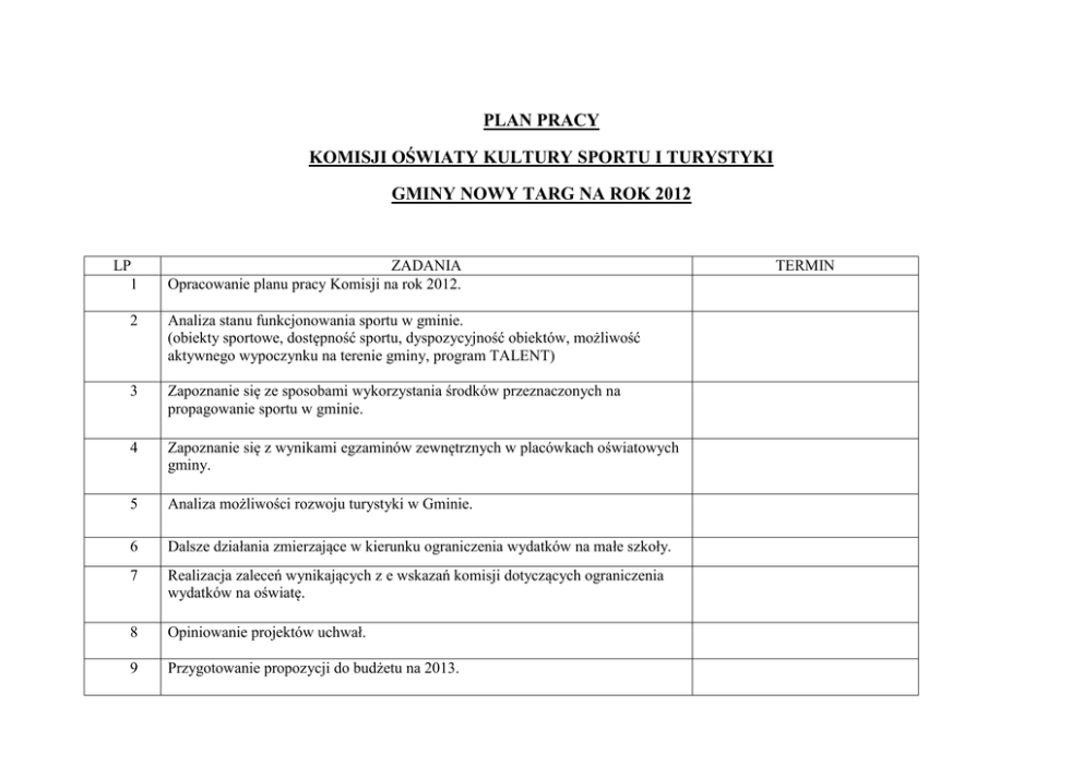 plan pracy komisji oświaty kultury sportu i turystyki gminy nowy targ