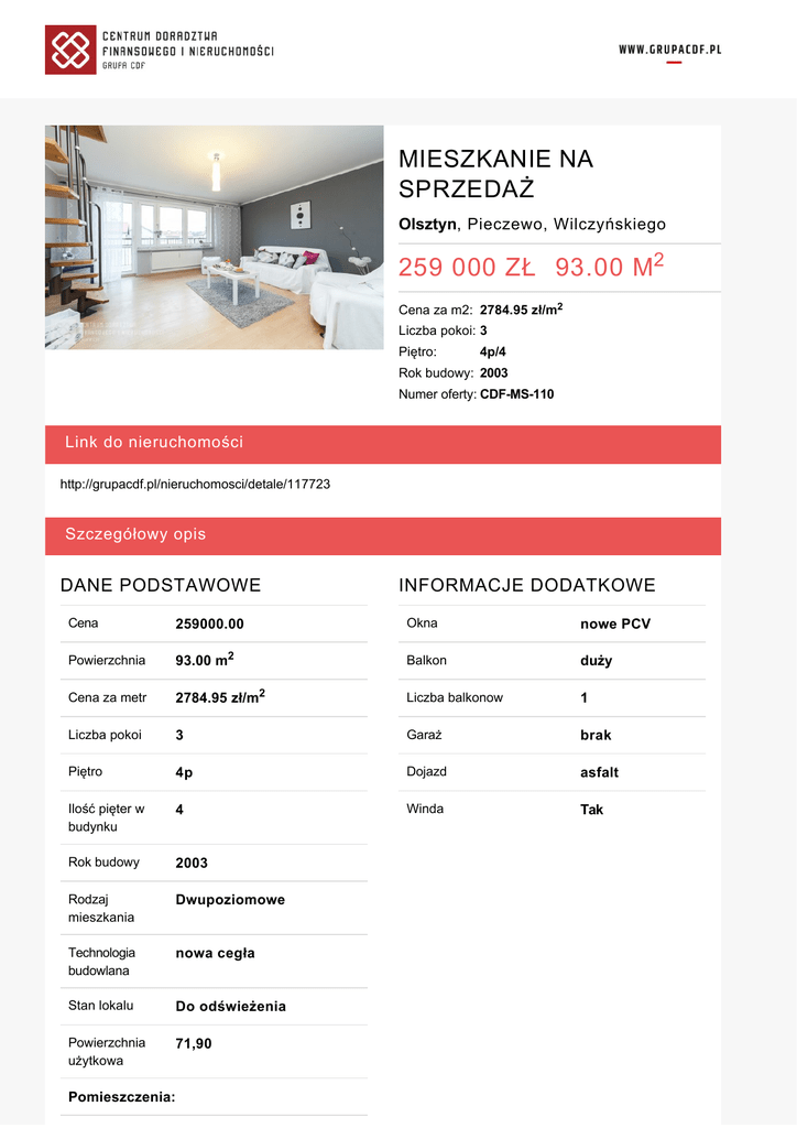 MIESZKANIE NA SPRZEDAŻ Olsztyn, Pieczewo, Wilczyńskiego 259 000 ZŁ 93.00 M2 Cena za m2: 2784.95 zł/m2 Liczba pokoi: 3 Piętro: 4p/4 Rok budowy: 2003 Numer oferty: CDF-MS-110 Link do nieruchomości http://grupacdf.pl/nieruchomosci/detale/117723 Szczegółowy opis DANE PODSTAWOWE INFORMACJE DODATKOWE Cena 259000.00 Okna nowe PCV Powierzchnia 93.00 m2 Balkon duży Cena za metr 2784.95 zł/m2 Liczba balkonow 1 Liczba pokoi 3 Garaż brak Piętro 4p Dojazd asfalt Ilość pięter w budynku 4 Winda Tak Rok budowy 2003 Rodzaj mieszkania Dwupoziomowe Technologia budowlana nowa cegła Stan lokalu Do odświeżenia Powierzchnia użytkowa 71,90 Pomieszczenia: Ilość pokoi 3 Ilość łazienek 2 Ilość toalet 2 Kuchnia Typ pomieszczenia aneks kuchenny połączony z jadalnią Rodzaj kuchni z zabudową kuchenną Podłogi terakota Łazienka Typ pomieszczenia razem z wc Liczba 2 Wc Liczba 2 Ściany glazura Podłogi terakota Przedpokój Podłogi terakota Opis nieruchomości Wybierz się na wirtualny spacer po nieruchomości (link:http://grupacdf.pl/media/vs/117723.html) Zapraszam do zapoznania się z ofertą sprzedaży atrakcyjnego, przestronnego mieszkania położonego w Olsztynie na osiedlu Pieczewo przy ul. Wilczyńskiego. Nieruchomość o pow. 93 m2 składa się z dwóch poziomów. Na pierwszym z nich wyróżniamy kuchnię z jadalnią, duży salon z wyjściem na balkon typu loggia oraz łazienkę.Istnieje możliwość wyodrębnienia trzeciego pokoju. Na drugim poziomie znajduje się przestronna sypialnia, garderoba oraz łazienka W pokojach na podłodze zostały położone panele, okna są plastikowe,ściany szpachlowane i pomalowane. Kuchnia jest umeblowana i wyposażona w sprzęt AGD, połączona została z jadalnia, dzięki czemu mieszkanie jest naprawdę przestronne. W łazienkach położone zostały płytki w jasnej kolorystyce, jedna z nich wyposażona jest w wannę, druga w prysznic. Mieszkanie jest przytulne i słoneczne. Pozostawia duże możliwości aranżacyjne. Blok wybudowany został w nowej technologii, a usytuowanie w sąsiedztwie lasu , na końcu ulicy zapewnia mieszkańcom komfort i ciszę .Przed blokiem znajdują się miejsca parkingowe dla mieszkańców. Zapraszam wszystkie osoby zainteresowane na zapoznanie się z materiałem zdjęciowym oraz na prezentację. Więcej szczegółów na: http://grupacdf.pl/nieruchomosci/detale/117723 FINANSOWANIE Zapraszamy do bezpłatnego skorzystania z usług naszych doradców finansowych GrupaCDF, którzy pomogą uzyskać najlepszy kredyt na rynku! Dysponujemy ofertami kredytów wszystkich rzetelnych banków na rynku. W prosty i jasny sposób doradzamy – porównujemy i wyjaśniamy propozycje. Nasze wsparcie jest bezpłatne i kompleksowe – od momentu złożenia wniosku, po wypłatę środków. DORADCA GrupyCDF POMOŻE PAŃSTWU W: - Porównaniu ofert z 23 banków i uzyskaniu wstępnej decyzji kredytowej - już podczas pierwszego spotkania, - Wyborze najlepszej oferty - najdogodniejszego systemu rat, okresu kredytowania, - Sporządzeniu i złożeniu wniosków w wybranych bankach, - Skompletowaniu niezbędnych dokumentów, dotyczących nabywanej nieruchomości. - Omówieniu warunków umowy kredytowej - Pomocy na każdym etapie procesu transakcyjnego Z nami realizacja marzenia o własnym domu jest PROSTA! OSOBA ODPOWIEDZIALNA ZA OFERTĘ W BIURZE SPRZEDAŻY: Agnieszka Falkowska GrupaCDF Sp. z o.o. ul. Mazurska 12/18 10-520 Olsztyn tel.: +48 695808059 tel./fax: +48 89 527 78 13 [email protected] Zapraszamy również do naszego olsztyńskiego oddziału: Centrum Doradztwa Finansowego i Nieruchomości GrupaCDF Ul. Mazurska 12/18 10-520 Olsztyn tel. +48 89 527 78 13 Odwiedź naszą stronę: www.grupacdf.pl Niniejsza oferta nie stanowi oferty w rozumieniu kodeksu cywilnego. Dane w niej zawarte mają charakter informacyjny i mogą ulegać zmianie. Numer oferty w biurze: CDF-MS-110 Korzyści DLACZEGO WARTO SKORZYSTAĆ Z NASZYCH USŁUG? Chcemy, abyś nie musiał tracić czasu i pieniędzy na bieganie po wielu bankach, notariuszach, prawnikach, towarzystwach ubezpieczeń, rzeczoznawcach majątkowych, urzędach, biurach nieruchomości… Dzięki nam kupno nieruchomości opiera się na kontakcie z JEDNYM PARTNEREM, a skomplikowany proces JEST PROSTY. 1. GWARANCJA SUKCESU Nasi doświadczeni doradcy finansowi, z wieloletnim stażem zapewnią Ci transakcję, jak najbardziej korzystną dla Ciebie. Gwarantujemy Ci atrakcyjną cenę nieruchomości, zniżki przy opłatach notarialnych oraz najkorzystniejszą ofertę kredytu. Nasze usługi doradztwa finansowego nic Cię nie kosztują, a doradca finansowy pomoże uzyskać najlepszy kredyt na rynku. 2. KOMPLEKSOWOŚĆ Zajmiemy się procesem kupna Twojej nieruchomości od początku do końca transakcji. Zadbamy o poprawność całej dokumentacji, sprawdzenie stanu prawnego nieruchomości oraz jej finansowanie. W innowacyjny sposób łączymy zawód pośrednika nieruchomości i doradcy finansowego poprzez kompleksowe usługi. Z nami zakup nieruchomości JEST PROSTY. Agnieszka Falkowska [email protected] +48 695 808 059 GrupaCDF Sp. z o.o. 10-520 Olsztyn, ul. Mazurska 12/18 tel./fax: +48 89 527 78 13