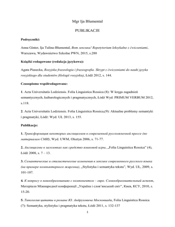 Mgr Ija Blumental PUBLIKACJE Podręczniki: Anna Ginter, Ija Tulina-Blumental, Вот лексика! Repetytorium leksykalne z ćwiczeniami, Warszawa, Wydawnictwo Szkolne PWN, 2015, s.280 Książki redagowane (redakcja językowa): Agata Piasecka, Rosyjska frazeologia i frazeografia. Skrypt z ćwiczeniami do nauki języka rosyjskiego dla studentów filologii rosyjskiej, Łódź 2012, s. 144. Czasopisma współredagowane: 1. Acta Universitatis Lodziensis. Folia Linguistica Rossica (8): W kręgu zagadnień semantycznych, kulturologicznych i pragmatycznych, Łódź Wyd. PRIMUM VERBUM 2012, s.118. 2. Acta Universitatis Lodziensis. Folia Linguistica Rossica,(9): Aktualne problemy semantyki i pragmatyki, Łódź: Wyd. UŁ 2013, s. 155. Publikacje: 1. Трансформация некоторых англицизмов в современной русскоязычной прессе (по материалам СМИ), Wyd. UWM, Olsztyn 2006, s. 71-77. 2. Англицизмы в заголовках как средство языковой игры, „Folia Linguistica Rossica” (4), Łódź 2008, s. 7 – 13. 3. Семантические и стилистические изменения в лексике современного русского языка (на примере компьютерного жаргона), „Stylistyka i semantyka tekstu”, Wyd. UŁ, 2009, s. 101-107. 4. К вопросу о новообразованиях с компонентом – евро. Словообразовательный аспект, Матеріали Міжнародної конференції „Україна і слов’янський світ”, Киев, КСУ, 2010, s. 15-20. 5. Типология цитаты в романе Ю. Андруховича Московиада, Folia Linguistica Rossica (7): Semantyka, stylistyka i pragmatyka tekstu, Łódź 2011, s. 132-137 1 6. Антропонимикон романа Ю. Андруховича „Московиада”. Интертекстуальный аспект, Język i styl tekstów literackich i nieliterackich, Łódź 2012, s. 60-67 7. О „культурнознаковых” прецедентных высказываниях в заголовках (по материалам еженедельника „Огонёк” за 2012 год), Acta Universitatis Lodziensis, Folia Linguistica Rossica”, (9): Aktualne problemy semantyki i pragmatyki, Łódź: Wyd. UŁ 2013, s.17-26. 8. Ия Блюменталь, Aгата Пясецка, O структуре и содержании польско-украинского словаря фразеологизмов (к проблеме проекта), W kręgu zagadnień semantycznych i stylistycznych pod red. A.Piasecka i I. Blumental, Łódź 2014, s. 303-317. 9. Пясецька А., Блюменталь, Польсько-український фразеологічний словник (структура, зміст, перспективи), Система і структура східнослов’янських мов, випуск 8, Київ 2015, s. 237-250. W druku znajduję się: Языковая презентация как элемент формирования экстралингвистических компетенций у студентов (из опыта работы). Najważniejsze tłumaczenia: Z języka polskiego na ukraiński: 1. Żółte Wody – Жовті Води 1648, Wyd. MON, Warszawa 1999, s. 170. 2. Katalog wystawy „Polskie lalki teatralne i filmowe” (Lwów) przygotowanej przez Muzeum Archeologiczne i Etnograficzne w Łodzi, Łódź 2006, s. 20. Z języka ukraińskiego na język polski: Skarby broni XV-XVIII w. Ze zbiorów Lwowskiego Muzeum Historycznego, Biblioteka Muzeum archeologicznego i Etnograficznego w Łodzi nr 34, Łódź 2006, s. 131. Z języka polskiego na język ukraiński, z języka ukraińskiego na język polski: Materiały projektu zrealizowanego przez Muzeum Archeologiczne i Etnograficzne w Łodzi „Wyróżnieni strojem. Huculszczyzna - tradycja i współczesność” (2013). Z języka polskiego na język rosyjski i ukraiński: 2 Materiały dydaktyczne dla rodziców „Wielojęzyczne rodziny” 2013/14 (w ramach projektu „Wielojęzyczne rodziny” http://www.multilingual-families.eu./) Z języka polskiego na język ukraiński: 1. Skrypt „30 ćwiczeń wspierających wielojęzyczność w domu” 2014/15 (w ramach projektu „Wielojęzyczne rodziny” http://www.multilingual-families.eu./) 2. Skrypt „29 ćwiczeń wspierających wielojęzyczność w domu” 2013/14 (w ramach projektu „Wielojęzyczne rodziny” http://www.multilingual-families.eu./) 3. Przewodnik dla rodziców dzieci głuchych, Łódź 2015, s.88 3