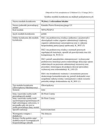 Załącznik nr 9 do zarządzenia nr 12 Rektora UJ z 15 lutego 2012 r. Sylabus modułu kształcenia na studiach podyplomowych Nazwa modułu kształcenia Wybory i referendum lokalne Nazwa jednostki prowadzącej moduł Kod modułu Katedra Prawa Konstytucyjnego UJ Język modułu kształcenia polski Efekty kształcenia dla modułu kształcenia EK1: ma podstawową wiedzę o jednostce i jej prawach i obowiązkach wobec organów administracji rządowej, organów administracji samorządowej oraz w zakresie bezpośredniej partycypacji społecznej: K_W07 (3) WPA-PSAP12 EK2: ma podstawową wiedzę o normach prawnych regulujących instytucje, sposób ich powoływania oraz ich kompetencje: K_W10 (1) EK3: potrafi samodzielnie zinterpretować i wykorzystać podstawowe instytucje prawa materialnego dotyczące spraw załatwianych na poziomie administracji terenowej oraz procedury zmierzającej do podjęcia decyzji (procedury wyborczej oraz referendalnej): K_U03 (2) EK4: ma świadomość ważności i zrozumienie procesu skutecznego komunikowania się, potrafi doskonalić oraz uzupełniać nabytą wiedzę i umiejętności a także rozumie potrzebę stałego doskonalenia się: K_K01 (1) Typ modułu kształcenia (obowiązkowy/fakultatywny) Semestr Obowiązkowy letni Imię i nazwisko osoby/osób Dr Piotr Czarny prowadzących moduł Imię i nazwisko osoby/osób Dr Piotr Czarny egzaminującej/egzaminujących bądź udzielającej zaliczenia, w przypadku gdy nie jest to osoba prowadząca dany moduł Sposób realizacji konwersatorium Wymagania wstępne i dodatkowe Rodzaj i liczba godzin zajęć dydaktycznych wymagających bezpośredniego udziału Nie dotyczy 4 nauczyciela akademickiego i studentów, gdy w danym module przewidziane są takie zajęcia Liczba punktów ECTS przypisana modułowi Bilans punktów ECTS 1 ECTS Konwersatorium: 4 godziny, Konsultacje wykładowcy: 1 godzina Łącznie 5 godzin tzw. kontaktowych Stosowane metody dydaktyczne Metody sprawdzania i oceny efektów kształcenia uzyskanych przez studentów Forma i warunki zaliczenia modułu, w tym zasady dopuszczenia do egzaminu, zaliczenia, a także forma i warunki zaliczenia poszczególnych zajęć wchodzących w zakres danego modułu Treści modułu kształcenia Wykaz literatury podstawowej i uzupełniającej 1 pkt ECTS x 25 godzin = 25 godzin w tym: 5 godzin kontaktowych i 20 godzin niekontaktowych (praca własna studenta) Konwersatorium Nie dotyczy Warunkiem zaliczenia jest uczestnictwo studenta w zajęciach Program zagadnień: zajęć obejmuje omówienie następujących 1. Wybory jako konieczny element koncepcji samorządu terytorialnego. 2. Referendum jako uzupełniająca władcza forma wpływu mieszkańców na działalność jednostek samorządu terytorialnego. 3. Normatywne podstawy samorządowego prawa wyborczego i referendum lokalnego. 4. Zasady samorządowego prawa wyborczego (powszechność, bezpośredniość, równość, tajność, wolność i proporcjonalność). 5. Systemy wyborcze w wyborach do organów samorządu terytorialnego. 6. Zasięg terytorialny, rodzaje, przedmiot i moc wiążąca referendum lokalnego. 7. Gwarancje prawidłowego przebiegu wyborów. 1. Chmaj M., Skrzydło W., System wyborczy w RP, Wyd. Zakamycze, Warszawa 2002. 2. Czaplicki K.W., Dauter B., Kisielewicz A., Rymarz F., Samorządowe prawo wyborcze. Komentarz, Wyd. Wolters Kluwer 2006 Warszawa 2006. 3. Czaplicki K.W., Dauter B., Kisielewicz A., Rymarz F., Ustawa o referendum lokalnym. Komentarz, Wolters Kluwer Polska - ABC , Warszawa 2007. 4. Dolnicki B., Samorząd terytorialny, Wyd. Zakamycze, Kraków 2009. 5. Uziębło P., Ustawa o referendum lokalnym. Komentarz, Wyd. Wolters Kluwer Warszawa 2007.