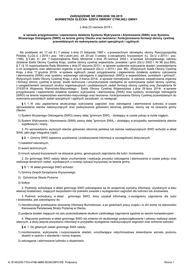 ZARZĄDZENIE NR ORN.0050.106.2015 BURMISTRZA OLECKA- SZEFA OBRONY CYWLINEJ GMINY z dnia 23 czerwca 2015 r. w sprawie przygotowania i zapewnienia działania Systemu Wykrywania i Alarmowania (SWA) oraz Systemu Wczesnego Ostrzegania (SWO) na terenie gminy Olecko oraz tworzenia i funkcjonowania formacji obrony cywilnej przewidzianych do wykonywania zadań specjalnych i ogólnych. Na podstawie art. 17 ust. 6 i 7 ustawy z dnia 21 listopada 1967 r. o powszechnym obowiązku obrony Rzeczypospolitej Polskiej (t.j.Dz.U z 2015 r.,poz. 144 z poźn.zm), art. 20 ust. 3 ustawy o zarządzaniu kryzysowym (t.j. Dz.U z 2013 r. poz. 1166), § 3 pkt. 6 i pkt. 7 rozporządzenia Rady Ministrów z dnia 25 czerwca 2002 r. w sprawie szczegółowego zakresu dzialania Szefa Obrony Cywilnej Kraju, szefów obrony cywilnej województw, powiatów i gmin (Dz.U 2002 r. Nr 96 ,poz.850), § 7 i § 10 rozporzadzenia Rady Ministrów z dnia 07 stycznia 2013 r. w sprawie systemów wykrywania skażeń i powiadamiania o ich wystąpieniu oraz właściwości organów w tych sprawach (Dz.U. z 2013 r. poz. 96), „Wytycznych Szefa Obrony Cywilnej Kraju z dnia 17 grudnia 2010r. w sprawie ogólnych zasad przygotowania i zapewnienia działania systemu cykrywania i alarmowania (SWA) oraz systemu wdzesnego ostrzegania o zagrożeniach (SWO) w województwie, powiatach i gminach”, Wytycznych Szefa Obrony Cywilnej Kraju z dnia 3 marca 2014r. w sprawie normatywów, w zakresie zaopatrywania organów i formacji obrony cywilnej w sprzęt, środki techniczne i umundurowanie niezbędne do wykonywania zadań obrony cywilnej, z uwzglednieniem ramowych struktur organizacyjnych i podstawowych zadań formacji obrony cywilnej oraz Zarządzenia Nr 215/2014 Wojewody Warmińsko-Mazurskiego - Szefa Obrony Cywilnej Wojewodztwa z dnia 29 lipca 2014r. w sprawie przygotowania i zapewnienia działania systemu wykrywania i alarmowania (SWA) oraz systemu wczesnego ostrzegania (SWO) na terenie wojewodztwa warmińsko-mazurskiego oraz tworzenia i funkcjonowania Obrony Cywilnej przewidzianych do wykonania pozostałych zadań specjalnych i ogólnych zarzadzam, co następuje: § 1. 1. W celu zapewnienia skutecznego wykrywania zagrożeń oraz ostrzegania i alarmowania ludności w czasie wprowadzenia stanów nadzwyczajnych oraz podwyższania gotowości obronnej państwa, tworzy się na obszarze gminy Olecko: 1) System Wczesnego Ostrzegania (SWO) zwany dalej ”gminnym SWO„ - dzialający w czasie pokoju w trybie ciągłym, 2) System Wykrywania i Alarmowania (SWA) zwany dalej "gminnym SWA„ - dzialający w przypadku wprowadzenia stanów wyjatkowych i wojny, 2. Po wprowadzeniu wyższych stanów gotowości obronnej państwa lub stanów nadzwyczajnych SWO wchodzi w skład SWA, jako jego integralna część. § 2. 1. Gminny SWO zapewnia uzyskiwanie i przekazywanie informacji w szczegolności dotyczacych: 1) katastrof naturalnych, 2) awarii technicznych, 3) innych sytuacji kryzysowych na obszarze gminy, generujacych zagrożenia dla ludzi i środowiska. 2. Do gminnego SWO należy także uruchamianie i realizacja procedur ostrzegania i alarmowania w czasie pokoju oraz realizacja doraźnych zadań, wynikajacych z rozwoju sytuacji kryzysowej na terenie gminy. § 3. 1. W skład gminnego SWO wchodzi: 1) Gminny Zespół Zarządzania Kryzysowego, 2) . Ochotnicze Straże Pożarne 3) Sołtysi 2. Podmioty wchodzące w skład gminnego SWO zobowiązane są do wzajemnej wymiany informacji, uzyskanych w toku własnej działalności, mających bezpośredni lub pośredni zwiazek z wystąpieniem zagrożeń dla ludności lub środowiska. 3. Podmiot wchodzacy w skład i środowiska, jest zobowiązany do: gminnego SWO, ktory uzyskał informację o wystąpieniu zagrożenia dla ludzi 1) niezwłocznego przekazania stosownej informacji Burmistrzowi, a po godzinach pracy urzędu i w dni wolne na stanowisko Kierowania Państwowej Straży Pożarnej w Olecku, 2) podjecia działań mających na celu przeciwdziałanie skutkom zaistniałego zagrożenia zgodnie ze swoimi kompetencjami. 4. Włączenie podmiotu w skład gminnego SWO nie zmienia ich służbowego podporządkowania i zakresu realizacji zadań własnych, a służy jedynie pozyskaniu informacji w przypadku wystąpienia nadzwyczajnych zagrożeń oraz ochronie ludności. § 4. 1. Do głównych zadań gminnego SWA należy: 1) monitorowanie, wykrywanie i rozpoznawanie skażeń, umożliwiające natychmiastowe stwierdzenie wzrostu poziomu skażeń w oparciu o standardy i normy krajowe, 2) ostrzeganie i alarmowanie ludności o skażeniach, Id: B1463255-7703-47AB-ABB5-6D38C08F01DE. Podpisany Strona 1 3) przekazywanie Szefowi Obrony Cywilnej informacji o zagrożeniach uderzeniami z powietrza, w warunkach zewnetrznego zagrożenia bezpieczeństwa państwa i w czasie wojny, w celu podjęcia stosownych działań ochronnych na administrowanym terenie, b) ostrzeganie i alarmowanie ludności o zagrożeniach, o których mowa w pkt. 3, c) zapewnienie obiegu informacji o zagrożeniach, o ktorych mowa w pkt. 3. § 5. 1. W skład gminnego SWA wchodzi: 1) Drużyna Wykrywania i Alarmowania (DWA) 2) punkty alarmowania (PA). § 6. 1. Biorąc pod uwagę ocenę zagrożeń i potrzebę zapewnienia bezpieczeństwa na terenie gminy tworzy się następujace formacje: 1) Drużynę Wykrywania i Alarmowania (dwa) 2) Pluton Ratownictwa Ogólnego (pro) 2. Szczegółowe zasady organizacji i zadania formacji określa Plan działania formacji SWA stanowiący odrębny dokument, opracowany na podstawie załącznika nr 1 do zarządzenia. § 7. W celu właściwej organizacji działania formacji obrony cywilnej należy zapewnić: 1) warunki lokalowe, techniczne oraz socjalne niezbędne do skutecznego działania formacji po rozwinieciu, 2) stałe utrzymywanie gotowości do działania formacji poprzez realizację procesu szkoleniowego. § 8. Osobom powołanym do formacji obrony cywilnej nadać przydziały organizacyjno-mobilizacyjne zgodnie z obowiazujacymi przepisami. § 9. 1. Formacje SWA os
