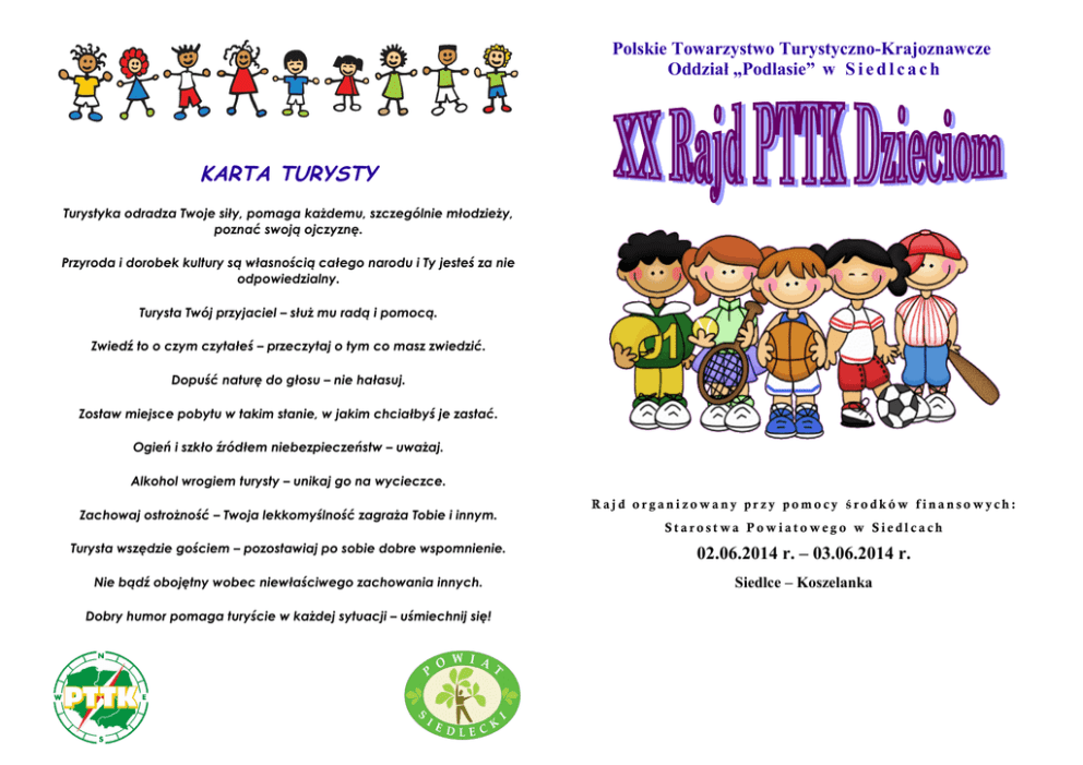 Polskie Towarzystwo Turystyczno-Krajoznawcze Oddział „Podlasie” w S i e d l c a c h KARTA TURYSTY Turystyka odradza Twoje siły, pomaga każdemu, szczególnie młodzieży, poznać swoją ojczyznę. Przyroda i dorobek kultury są własnością całego narodu i Ty jesteś za nie odpowiedzialny. Turysta Twój przyjaciel – służ mu radą i pomocą. Zwiedź to o czym czytałeś – przeczytaj o tym co masz zwiedzić. Dopuść naturę do głosu – nie hałasuj. Zostaw miejsce pobytu w takim stanie, w jakim chciałbyś je zastać. Ogień i szkło źródłem niebezpieczeństw – uważaj. Alkohol wrogiem turysty – unikaj go na wycieczce. Zachowaj ostrożność – Twoja lekkomyślność zagraża Tobie i innym. Raj d organizowany pr zy pom ocy środków finansowych: Starostwa Powiatowego w Siedlcach Turysta wszędzie gościem – pozostawiaj po sobie dobre wspomnienie. 02.06.2014 r. – 03.06.2014 r. Nie bądź obojętny wobec niewłaściwego zachowania innych. Siedlce – Koszelanka Dobry humor pomaga turyście w każdej sytuacji – uśmiechnij się! Program Rajdu Organizatorzy: Oddział PTTK „Podlasie” w Siedlcach Współorganizatorzy: Starostwo Powiatowe w Siedlcach Termin Rajdu: 02.06 - 03.06.2014 r. Warunki uczestnictwa: W Rajdzie mogą brać udział uczniowie szkół podstawowych oraz gimnazjum pod opieką nauczycieli (jeden opiekun na 15 osób). Obowiązuje posiadanie śpiwora, latarki, obuwia turystycznego. Prosimy także o wzięcie płyt z muzyką. Zgłoszenia: Zgłoszenia przyjmuje Oddział PTTK w Siedlcach do dnia 16 maja 2014 r. wyłącznie w Centrum Informacji Turystycznej przy ul. Pułaskiego 7 według załączonej do Regulaminu Karty Zgłoszenia. 2 czerwca 2014 (poniedziałek) 7.40 - zbiórka uczestników przed siedzibą Oddziału PTTK przy ul. Bpa Świrskiego 35, 8.00 - odjazd autokarem do wsi Mokobody–Budzieszyn, zwiedzanie miejsca związanego z kultem Matki Bożej Budzieszyńskiej, 9.15 - przejazd do Węgrowa, zwiedzanie Bazyliki pw. Wniebowzięcia NMP oraz kościoła pw. św. Antoniego z Padwy i św. Piotra z Alkantary, 11.00 - przejazd do miejscowości Gwizdały zwiedzanie Muzeum Gwizdka w Zespole Szkół, 12.45 - wyjście na trasę pieszą: Gwizdały – Koszelanka = 4,5 km zakwaterowanie i obiad /godz.15.00/ 16.00 - konkursy 19.30 - ognisko Ilość miejsc ograniczona, decyduje kolejność zgłoszeń. Wpisowe: … zł od osoby Świadczenia w ramach wpisowego * nocleg w warunkach turystycznych [obowiązuje posiadanie śpiwora], * wyżywienie, * nagrody za udział w konkursach (konkurs krajoznawczy, konkurs piosenki turystycznej) i zabawach, * przejazd autokarem na trasie Siedlce – Mokobody – Węgrów – Gwizdały – Koszelanka – Siedlce, * opieka przewodników na trasie. 3 czerwca 2013 (wtorek) 8.30 9.00 10.00 12.00 - śniadanie i zdanie domków, - wręczenie dyplomów i nagród - wyjazd do Loretto – zwiedzanie Sanktuarium Maryjnego, - przejazd do Siedlec pod siedzibę Oddziału PTTK przy ulicy Bpa I. Świrskiego 35 - planowany przyjazd ok. godz. 14.00 Ogółem trasa autokarem = 165 km, trasa piesza 4,5 km Postanowienia końcowe: 1. Rajd odbędzie się bez względu na pogodę. 2. Obowiązuje przestrzeganie Karty Turysty. 3. Drużynom, które nie wezmą udziału w Rajdzie wpisowe nie będzie zwracane. 4. Interpretacja regulaminu należy do Organizatorów. 5. Udział w rajdzie jest równoznaczny z wyrażeniem zgody na wykorzystanie wizerunku uczestników rajdu. Zgoda obejmuje wykorzystanie, utrwalenie, obróbkę i powielanie wykonanych zdjęć, za pośrednictwem dowolnego medium wyłącznie w celu zgodnym z prowadzoną działalnością przez PTTK Oddział „Podlasie” w Siedlcach.