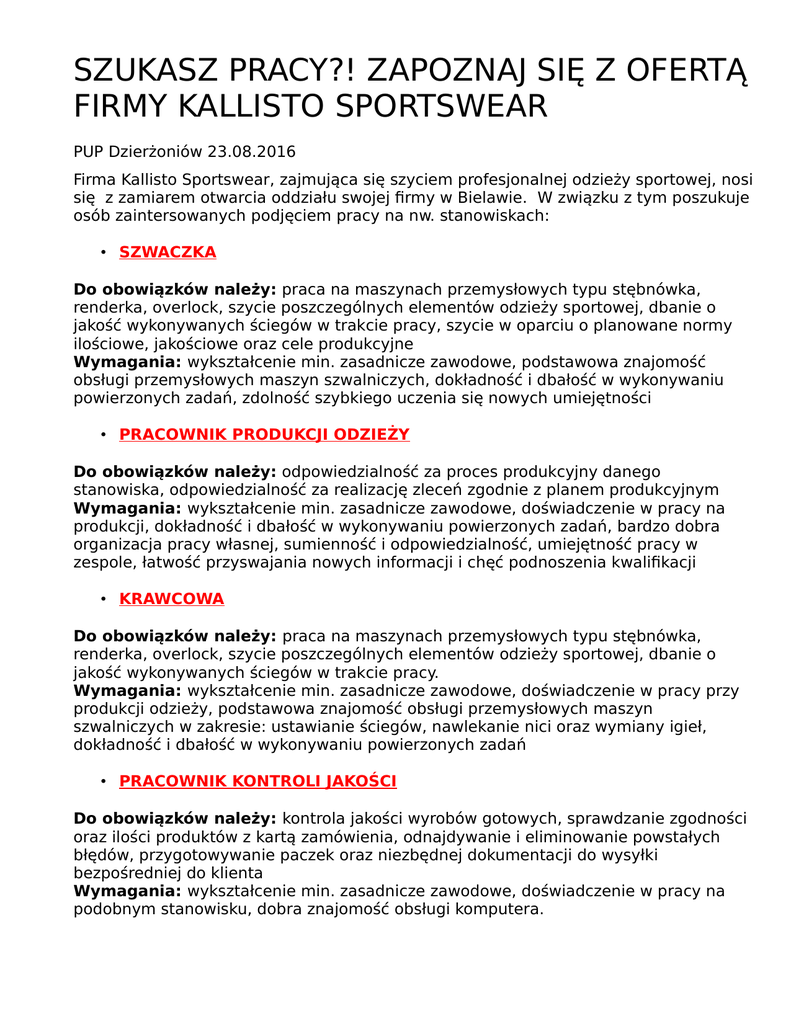 szukasz pracy?! zapoznaj się z ofertą firmy kallisto sportswear