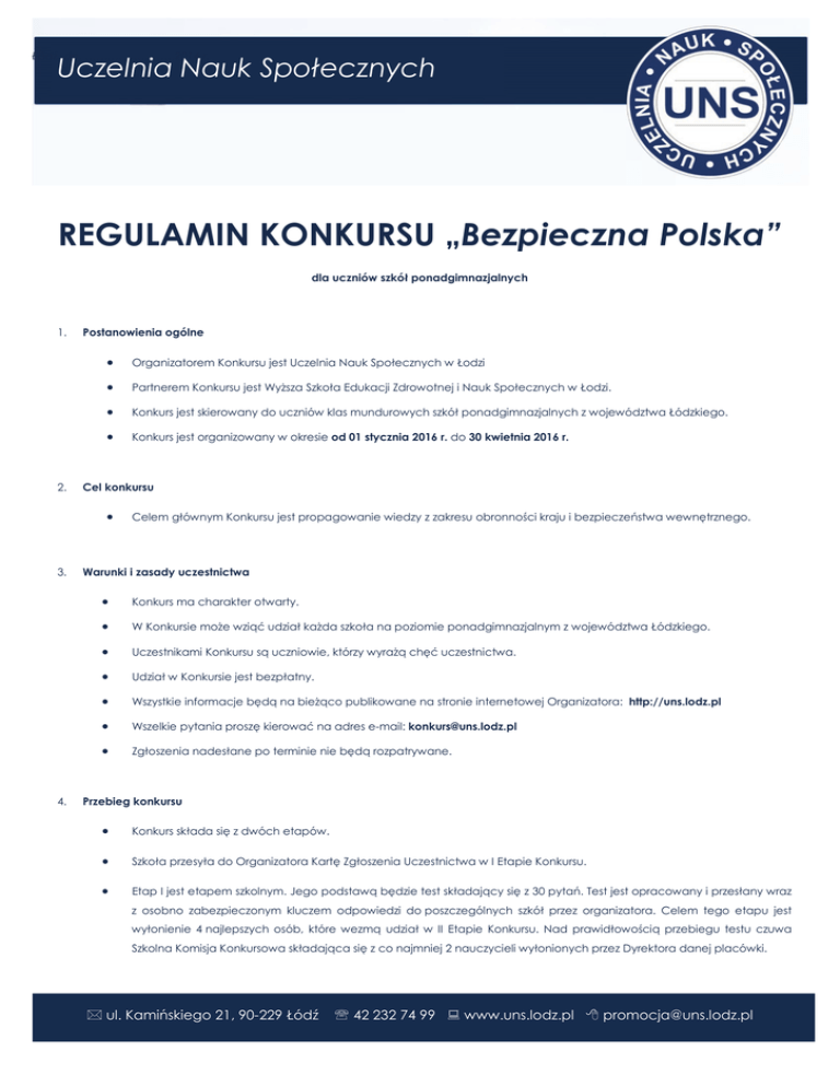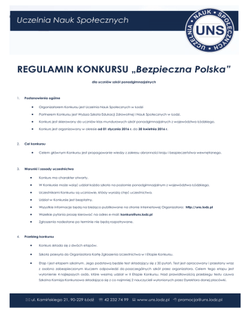 Łódź, dn. ……………………2014 r. Uczelnia Nauk Społecznych REGULAMIN KONKURSU „Bezpieczna Polska” dla uczniów szkół ponadgimnazjalnych 1. 2. Postanowienia ogólne • Organizatorem Konkursu jest Uczelnia Nauk Społecznych w Łodzi • Partnerem Konkursu jest Wyższa Szkoła Edukacji Zdrowotnej i Nauk Społecznych w Łodzi. • Konkurs jest skierowany do uczniów klas mundurowych szkół ponadgimnazjalnych z województwa Łódzkiego. • Konkurs jest organizowany w okresie od 01 stycznia 2016 r. do 30 kwietnia 2016 r. Cel konkursu • 3. 4. Celem głównym Konkursu jest propagowanie wiedzy z zakresu obronności kraju i bezpieczeństwa wewnętrznego. Warunki i zasady uczestnictwa • Konkurs ma charakter otwarty. • W Konkursie może wziąć udział każda szkoła na poziomie ponadgimnazjalnym z województwa Łódzkiego. • Uczestnikami Konkursu są uczniowie, którzy wyrażą chęć uczestnictwa. • Udział w Konkursie jest bezpłatny. • Wszystkie informacje będą na bieżąco publikowane na stronie internetowej Organizatora: http://uns.lodz.pl • Wszelkie pytania proszę kierować na adres e-mail: [email protected] • Zgłoszenia nadesłane po terminie nie będą rozpatrywane. Przebieg konkursu • Konkurs składa się z dwóch etapów. • Szkoła przesyła do Organizatora Kartę Zgłoszenia Uczestnictwa w I Etapie Konkursu. • Etap I jest etapem szkolnym. Jego podstawą będzie test składający się z 30 pytań. Test jest opracowany i przesłany wraz z osobno zabezpieczonym kluczem odpowiedzi do poszczególnych szkół przez organizatora. Celem tego etapu jest wyłonienie 4 najlepszych osób, które wezmą udział w II Etapie Konkursu. Nad prawidłowością przebiegu testu czuwa Szkolna Komisja Konkursowa składająca się z co najmniej 2 nauczycieli wyłonionych przez Dyrektora danej placówki. ul. Kamińskiego 21, 90-229 Łódź 42 232 74 99 www.uns.lodz.pl [email protected] Uczelnia Nauk Społecznych • Szkoła przesyła do Organizatora listę uczniów którzy uzyskali najwyższą ilość punktów z testu zgodnie z Kartą Zgłoszenia Uczestników II Etapu. Do listy dołączone zostaną testy wszystkich uczestników Konkursu, którzy brali udział w Etapie I. • Etap II jest etapem pozaszkolnym i będzie prowadzony przez Organizatora w jego siedzibie. Będzie to test wiedzy składający się z 30 pytań. Celem tego etapu jest wyłonienie 3 osób (laureaci Konkursu) o najwyższym poziomie wiedzy z zakresu obronności i bezpieczeństwa wewnętrznego kraju. • Laureaci Konkursu otrzymają nagrody, adekwatnie do zajętego miejsca w Konkursie. • Wszyscy uczestnicy II Etapu Konkursu otrzymają dyplomy potwierdzające ich uczestnictwo. • Wszyscy uczestnicy II Etapu Konkursu otrzymają nagrodę rzeczową. • Laureat i Finaliści Konkursu po złożeniu wymaganych dokumentów zostają przyjęci na wybrany przez nich kierunek studiów pierwszego stopnia realizowanych w Uczelni Nauk Społecznych bez udziału w postępowaniu rekrutacyjnym. 5. Harmonogram konkursu • Do 14.02.2016 r. - nadsyłanie Kart uczestnictwa w I Etapie Konkursu • 01 - 30.03.2016 r. - I Etap Konkursu (etap szkolny) • Do 31.03.2016 r. - szkoły przesyłają elektronicznie Kartę Zgłoszenia Uczestników II Etapu • Do 05.04.2016 r. - szkoły przesyłają papierową Kartę Zgłoszenia Uczestników II Etapu wraz z testami wszystkich uczestników I Etapu • 6. 19.04.2016 r. - II Etap Konkursu oraz Uroczyste wręczenie nagród i dyplomów Postanowienia końcowe • Przystąpienie do Konkursu jest równoznaczne z akceptacją jego warunków. • W wyjątkowych sytuacjach Organizator zastrzega sobie prawo do zmian w Regulaminie Konkursu, które nie będą jednak naruszały jego ogólnych zasad. • Organizator Konkursu nie ponosi odpowiedzialności za odwołanie Konkursu bądź zmiany w jego harmonogramie, które wyniknęły z przyczyn od niego niezależnych. • Kwestie nieuregulowane w niniejszym regulaminie będą rozstrzygane przez Organizatora. • Wszystkie prace konkursowe zostają u Organizatora. • Bliższych informacji udziela Organizator Konkursu: Uczelnia Nauk Społecznych 90-229 Łódź, ul. Kamińskiego 21 42 232 74 99 [email protected] ul. Kamińskiego 21, 90-229 Łódź 42 232 74 99 www.uns.lodz.pl [email protected]