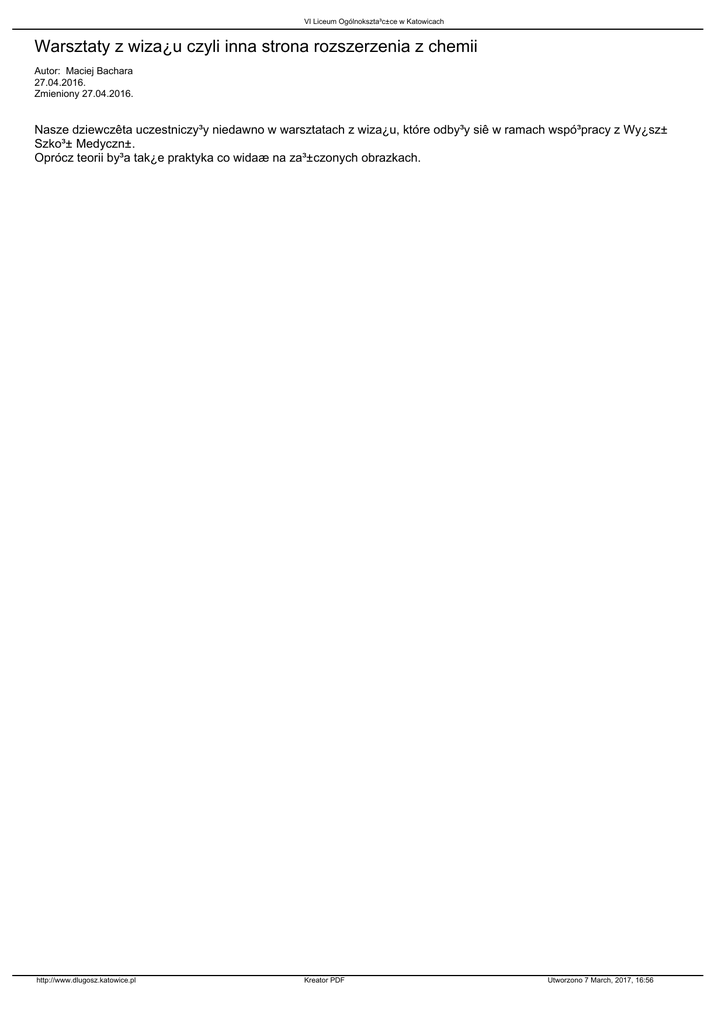 VI Liceum Ogólnokszta³c±ce w Katowicach Warsztaty z wiza¿u czyli inna strona rozszerzenia z chemii Autor: Maciej Bachara 27.04.2016. Zmieniony 27.04.2016. Nasze dziewczêta uczestniczy³y niedawno w warsztatach z wiza¿u, które odby³y siê w ramach wspó³pracy z Wy¿sz± Szko³± Medyczn±. Oprócz teorii by³a tak¿e praktyka co widaæ na za³±czonych obrazkach. http://www.dlugosz.katowice.pl Kreator PDF Utworzono 7 March, 2017, 16:56