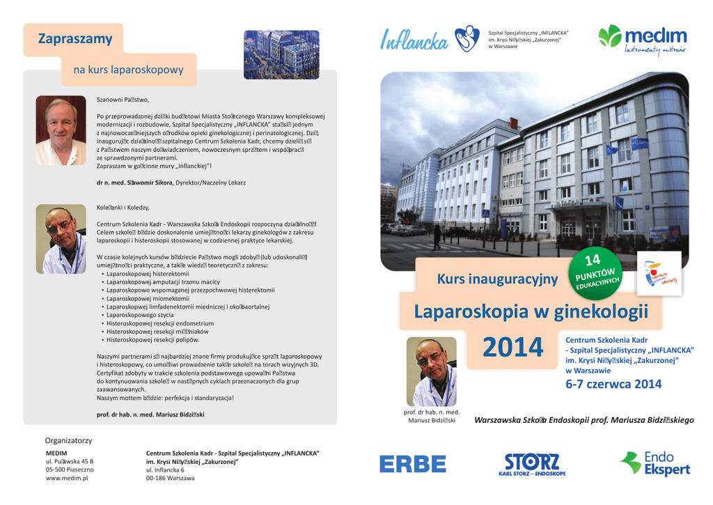 Szpital Specjalistyczny „INFLANCKA” im. Krysi Niżyńskiej „Zakurzonej” w Warszawie Zapraszamy na kurs laparoskopowy Szanowni Państwo, Po przeprowadzonej dzięki budżetowi Miasta Stołecznego Warszawy kompleksowej modernizacji i rozbudowie, Szpital Specjalistyczny „INFLANCKA” stał się jednym z najnowocześniejszych ośrodków opieki ginekologicznej i perinatologicznej. Dziś, inaugurując działalność szpitalnego Centrum Szkolenia Kadr, chcemy dzielić się z Państwem naszym doświadczeniem, nowoczesnym sprzętem i współpracą ze sprawdzonymi partnerami. Zapraszam w gościnne mury „Inflanckiej”! dr n. med. Sławomir Sikora, Dyrektor/Naczelny Lekarz Koleżanki i Koledzy, Centrum Szkolenia Kadr - Warszawska Szkoła Endoskopii rozpoczyna działalność! Celem szkoleń będzie doskonalenie umiejętności lekarzy ginekologów z zakresu laparoskopii i histeroskopii stosowanej w codziennej praktyce lekarskiej. W czasie kolejnych kursów będziecie Państwo mogli zdobyć (lub udoskonalić) umiejętności praktyczne, a także wiedzę teoretyczną z zakresu: ? Laparoskopowej histerektomii ? Laparoskopowej amputacji trzonu macicy ? Laparoskopowo wspomaganej przezpochwowej histerektomii ? Laparoskopowej miomektomii ? Laparoskopwej limfadenektomii miedniczej i okołoaortalnej ? Laparoskopowego szycia ? Histeroskopowej resekcji endometrium ? Histeroskopowej resekcji mięśniaków ? Histeroskopowej resekcji polipów. 14 Kurs inauguracyjny Organizatorzy MEDIM ul. Puławska 45 B 05-500 Piaseczno www.medim.pl Centrum Szkolenia Kadr - Szpital Specjalistyczny „INFLANCKA” im. Krysi Niżyńskiej „Zakurzonej” ul. Inflancka 6 00-186 Warszawa C EDUKA Laparoskopia w ginekologii 2014 Naszymi partnerami są najbardziej znane firmy produkujące sprzęt laparoskopowy i histeroskopowy, co umożliwi prowadzenie także szkoleń na torach wizyjnych 3D. Certyfikat zdobyty w trakcie szkolenia podstawowego upoważni Państwa do kontynuowania szkoleń w następnych cyklach przeznaczonych dla grup zaawansowanych. Naszym mottem będzie: perfekcja i standaryzacja! prof. dr hab. n. med. Mariusz Bidziński ÓW PUNKTYJNYCH Centrum Szkolenia Kadr - Szpital Specjalistyczny „INFLANCKA” im. Krysi Niżyńskiej „Zakurzonej” w Warszawie 6-7 czerwca 2014 prof. dr hab. n. med. Mariusz Bidziński Warszawska Szkoła Endoskopii prof. Mariusza Bidzińskiego Harmonogram Informacja kursu laparoskopowego dla uczestników PPROGRAM SESJI - kursu laparoskopowego 6-7 czerwca 2014 Zgłoszenia Piątek (6 czerwca) Sobota (7 czerwca) Zgłoszenia na wypełnionej „Karcie Zgłoszenia” przesyłać należy mailem: [email protected], faxem: +48 22 635 84 39 lub pocztą: ul. Inflancka 6, 00-186 Warszawa. 08.00 - 08.30 Rejestracja uczestników 09.00 - 10.00 Sesja wykładowa: Zgłoszenia przyjmowane są do dnia 25 maja 2014 roku. W szkoleniu może wziąć udział maksymalnie 25 osób. O przyjęciu decydować będzie kolejność zgłoszeń. 08.30 - 08.45 Przywitanie uczestników - Dyrektor/Naczelny Lekarz Szpitala Specjalistycznego Inflancka dr n. med. Sławomir Sikora, Prezes Medim Anna Janczewska-Radwan, prof. dr hab. n. med. Mariusz Bidziński 09.00 - 09.15 Elektrochirurgia zastosowanie i bezpieczeństwo - prof. Mariusz Bidziński 09.00 - 14.00 Operacje na bloku operacyjnym z transmisją do sali wykładowej: 1. Amputacja nadpochwowa trzonu macicy 2. Laparoskopowa histerektomia 3. Laparoskopowo wspomagana przezpochwowa histerektomia - prof. Mariusz Bidziński, dr n. med. Justyna Radkiewicz, dr n. med. Ewa Surynt, dr n. med. Jakub Rzepka 14.00 – 15.00 Przerwa obiadowa 15.00 – 19.00 Zajęcia praktyczne na pelvitrenerach i prezentacja filmów laparoskopowych - prof. Mariusz Bidziński, dr n. med. Justyna Radkiewicz, dr n. med. Ewa Surynt, dr n. med. Jakub Rzepka 09.15 - 09.30 Prezentacja sprzętu laparoskopowego firmy STORZ 09.30 - 10.00 Przeciwdziałanie komplikacjom laparoskopowym - dr n. med. Ewa Surynt i dr n. med. Jakub Rzepka 10.00 - 14.00 Operacje na bloku operacyjnym z transmisją do sali wykładowej: 1. Laparoskopowa histerektomia 2. Laparoskopowa resekcja mięśniaka macicy 3. Laparoskopowe wyłuszczenie torbieli jajnika - prof. Mariusz Bidziński, dr n. med. Justyna Radkiewicz, dr n. med. Ewa Surynt, dr n. med. Jakub Rzepka 14.00 Zakończenie kursu i rozdanie dyplomów. Opłata Koszt udziału w kursie wynosi: 600 zł/os. - dla lekarzy, którzy zgłoszą chęć uczestnictwa i opłacą udział do dnia 20 maja 2014 roku, 750 zł/os. - dla lekarzy, którzy zgłoszą chęć uczestnictwa i opłacą udział po dniu 20 maja 2014 roku. Opłatę wnieść należy na konto Szpitala wskazane w potwierdzeniu zakwalifikowania do udziału w kursie. Termin zapłaty upływa 29 maja 2014 roku. Zgłoszenia nie opłacone w ciągu 3 dni od daty potwierdzenia zakwalifikowania automatycznie wygasają. Opłata obejmuje: udział w zajęciach i wykładach odzież ochronną (blok operacyjny) obiad w piątek i sobotę przerwy kawowe materiały dydaktyczne wydanie certyfikatu uczestnictwa. Zakwaterowanie Organizatorzy nie zapewniają zakwaterowania. Dla Państwa wygody nawiązaliśmy współpracę z sąsiadującym ze Szpitalem Hotelem „IBIS” Stare Miasto. Przygotował on dla uczestników kursu specjalną ofertę: pokój 1-osobowy ze śniadaniem - 174 zł/dobę, pokój 2-osobowy ze śniadaniem - 208 zł/dobę. Oferta dostępna bezpośrednio przy rezerwacji w recepcji (do dnia 30 maja) na hasło: „Inflancka”. Punkty edukacyjne Organizatorzy zastrzegają sobie prawo dokonania zmiany kolejności operacji i/lub członków zespołów operacyjnych. Przy niach zgłosze do 20 V ! 50 zł rabat 1 Za udział w kursie przewidywane 14 punktów edukacyjnych. KARTA ZGŁOSZENIOWA CENTRUM SZKOLENIA KADR - SZPITAL SPECJALISTYCZNY „INFLANCKA” w WARSZAWIE WARSZAWSKA SZKOŁA ENDOSKOPII, KURS „LAPAROSKOPIA W GINEKOLOGII” 6-7 czerwca 2014 Kartę zgłoszeniową należy wysłać mailem: [email protected], faxem: +48 22 635 84 39 lub pocztą: ul.