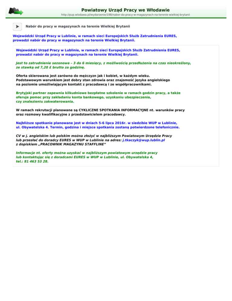 Powiatowy Urząd Pracy we Włodawie http://pup.wlodawa.pl/wydarzenie/198/nabor-do-pracy-w-magazynach-na-terenie-wielkiej-brytanii Nabór do pracy w magazynach na terenie Wielkiej Brytanii Wojewódzki Urząd Pracy w Lublinie, w ramach sieci Europejskich Służb Zatrudnienia EURES, prowadzi nabór do pracy w magazynach na terenie Wielkiej Brytanii. Wojewódzki Urząd Pracy w Lublinie, w ramach sieci Europejskich Służb Zatrudnienia EURES, prowadzi nabór do pracy w magazynach na terenie Wielkiej Brytanii. Jest to zatrudnienie sezonowe – 3 do 6 miesięcy, z możliwością przedłużenia na czas nieokreślony, ze stawką od 7,20 £ brutto za godzinę. Oferta skierowana jest zarówno do mężczyzn jak i kobiet, w każdym wieku. Podstawowym warunkiem jest dobry stan zdrowia oraz znajomość języka angielskiego na poziomie umożliwiającym kontakt z pracodawcą i ze współpracownikami. Brytyjski partner zapewnia kilkudniowe bezpłatne szkolenie w ramach godzin pracy, a także oferuje pomoc przy zakładaniu konta bankowego, uzyskaniu ubezpieczenia, czy znalezieniu zakwaterowania. W ramach rekrutacji planowane są CYKLICZNE SPOTKANIA INFORMACYJNE nt. warunków pracy oraz rozmowy kwalifikacyjne z przedstawicielem pracodawcy. Najbliższe spotkanie planowane jest w dniach 5-6 lipca 2016r. w siedzibie WUP w Lublinie, ul. Obywatelska 4. Termin, godzina i miejsce spotkania zostaną potwierdzone telefonicznie. CV w j. angielskim lub polskim można złożyć w najbliższym Powiatowym Urzędzie Pracy lub przesłać do doradcy EURES w WUP w Lublinie na adres: [email protected] z dopiskiem „PRACOWNIK MAGAZYNU STAFFLINE” Informacje nt. oferty można uzyskać w najbliższym powiatowym urzędzie pracy lub kontaktując się z doradcami EURES w WUP w Lublinie, ul. Obywatelska 4, tel.: 81 463 53 28.