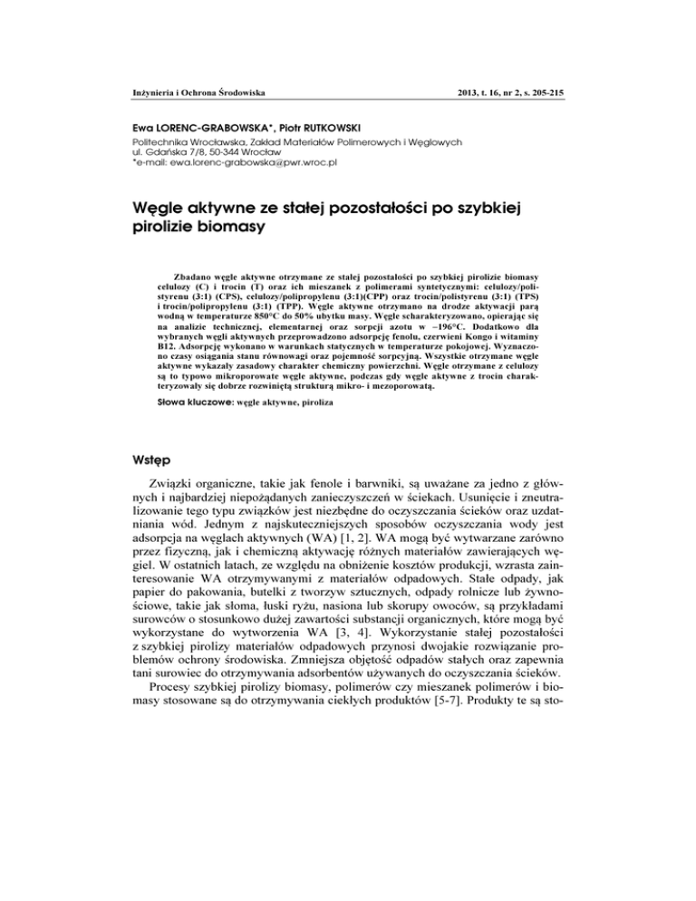 Inżynieria i Ochrona Środowiska 2013, t. 16, nr 2, s. 205-215 Ewa LORENC-GRABOWSKA*, Piotr RUTKOWSKI Politechnika Wrocławska, Zakład Materiałów Polimerowych i Węglowych ul. Gdańska 7/8, 50-344 Wrocław *e-mail: [email protected] Węgle aktywne ze stałej pozostałości po szybkiej pirolizie biomasy Zbadano węgle aktywne otrzymane ze stałej pozostałości po szybkiej pirolizie biomasy celulozy (C) i trocin (T) oraz ich mieszanek z polimerami syntetycznymi: celulozy/polistyrenu (3:1) (CPS), celulozy/polipropylenu (3:1)(CPP) oraz trocin/polistyrenu (3:1) (TPS) i trocin/polipropylenu (3:1) (TPP). Węgle aktywne otrzymano na drodze aktywacji parą wodną w temperaturze 850°C do 50% ubytku masy. Węgle scharakteryzowano, opierając się na analizie technicznej, elementarnej oraz sorpcji azotu w −196°C. Dodatkowo dla wybranych węgli aktywnych przeprowadzono adsorpcję fenolu, czerwieni Kongo i witaminy B12. Adsorpcję wykonano w warunkach statycznych w temperaturze pokojowej. Wyznaczono czasy osiągania stanu równowagi oraz pojemność sorpcyjną. Wszystkie otrzymane węgle aktywne wykazały zasadowy charakter chemiczny powierzchni. Węgle otrzymane z celulozy są to typowo mikroporowate węgle aktywne, podczas gdy węgle aktywne z trocin charakteryzowały się dobrze rozwiniętą strukturą mikro- i mezoporowatą. Słowa kluczowe: węgle aktywne, piroliza Wstęp Związki organiczne, takie jak fenole i barwniki, są uważane za jedno z głównych i najbardziej niepożądanych zanieczyszczeń w ściekach. Usunięcie i zneutralizowanie tego typu związków jest niezbędne do oczyszczania ścieków oraz uzdatniania wód. Jednym z najskuteczniejszych sposobów oczyszczania wody jest adsorpcja na węglach aktywnych (WA) [1, 2]. WA mogą być wytwarzane zarówno przez fizyczną, jak i chemiczną aktywację różnych materiałów zawierających węgiel. W ostatnich latach, ze względu na obniżenie kosztów produkcji, wzrasta zainteresowanie WA otrzymywanymi z materiałów odpadowych. Stałe odpady, jak papier do pakowania, butelki z tworzyw sztucznych, odpady rolnicze lub żywnościowe, takie jak słoma, łuski ryżu, nasiona lub skorupy owoców, są przykładami surowców o stosunkowo dużej zawartości substancji organicznych, które mogą być wykorzystane do wytworzenia WA [3, 4]. Wykorzystanie stałej pozostałości z szybkiej pirolizy materiałów odpadowych przynosi dwojakie rozwiązanie problemów ochrony środowiska. Zmniejsza objętość odpadów stałych oraz zapewnia tani surowiec do otrzymywania adsorbentów używanych do oczyszczania ścieków. Procesy szybkiej pirolizy biomasy, polimerów czy mieszanek polimerów i biomasy stosowane są do otrzymywania ciekłych produktów [5-7]. Produkty te są sto- 206 E. Lorenc-Grabowska, P. Rutkowski sunkowo dobrze zbadane, natomiast stała pozostałość po pirolizie, która otrzymywana jest z niewielką wydajnością, stanowi produkt uboczny. Półkoks może być wykorzystany jako stałe paliwo o średniej lub wysokiej wartości opałowej. Z drugiej strony może stanowić potencjalny surowiec do otrzymywania węgla aktywnego. Celem niniejszej pracy jest preparatyka oraz charakterystyka węgli aktywnych otrzymanych ze stałej pozostałości po szybkiej pirolizie mieszanek biomasy i polimerów odpadowych i ocena ich przydatności do usuwania zanieczyszczeń organicznych z wody. 1. Materiały i metody Węgle aktywne badane w pracy otrzymano ze stałej pozostałości po szybkiej pirolizie mieszanek: celulozy/polistyrenu (3:1) (CPS), celulozy/polipropylenu (3:1)(CPP), celulozy (C) oraz trocin/polistyrenu (3:1) (TPS), trocin/polipropylenu (3:1) (TPP) i trocin (T). Trociny, stanowiące materiał odpadowy, pochodziły z tartaku z okolic Lubania. Natomiast celulozę mikrokrystaliczną (Aldrich) zastosowano jako modelową biomasę. Proces szybkiej pirolizy prowadzono dwuetapowo. Pierwszym etapem była powolna piroliza z szybkością ogrzewania 3°C/minutę do temperatury 400°C, a następnie z szybkością ogrzewania 100oC/s do temperatury 900°C. Aktywację fizyczną parą wodną koksów uzyskanych w procesie pirolizy prowadzono w temperaturze 850°C do 50% ubytku masy. Parametry struktury kapilarnej węgli aktywnych oznaczono metodą adsorpcji i desorpcji azotu w temperaturze −196°C przy użyciu sorpcjometru NOVA 2000 firmy Quantachrome. Powierzchnię właściwą porów (SBET) wyznaczono z równania BET przy p/po < 0,15. Objętość mikroporów (VDR) i średnią szerokość porów (Lo) wyznaczono na podstawie równania Dubinina-Raduszkiewicza przy p/po < 0,05, a objętość całkowitą (VT) wyznaczono z prawa Gurvitcha przy p/po < 0,98. Dystrybucję szerokości porów wyznaczono metodą DFT z adsorpcji i metodą BJH z desorpcji, korzystając z oprogramowania firmy Qantachrome. Oznaczanie pHPZC (point of zero charge) węgli wykonano według procedury opisanej w pracy Moreno-Castilla i innych [8]. Dodatkowo na wybranych adsorbentach przeprowadzono procesy adsorpcji fenolu (F), czerwieni Kongo (CK) i witaminy B12 (B12). Procesy adsorpcji prowadzono w warunkach statycznych w temperaturze 22°C. Szczelnie zamknięte kolby z roztworem adsorbatu i próbką wytrząsano na wstrząsarce mechanicznej. Każda seria zawierała dwie kolby dodatkowe z roztworem bez adsorbentu, stanowiące ślepe próby. Na ich podstawie eliminowano wpływ światła i adsorpcji związków na ściankach kolb. Stosowano 0,10 dm3 roztworu o stężeniu 150 mg/dm3 i 0,05 g naważki adsorbentu w przypadku adsorpcji fenolu oraz 0,025 g naważki w przypadku adsorpcji czerwieni Kongo i witaminy B12. Ilość zaadsorbowanej substancji określono z różnicy stężeń roztworu adsorbatu przed i po adsorpcji. Stężenia roztworów określono przy użyciu 207 Węgle aktywne ze stałej pozostałości po szybkiej pirolizie biomasy spektrofotometru UV-Vis HITACHI U-2800A przy długości fali odpowiednio: λ = = 270 nm dla F; λ = 497 nm dla CK i λ = 361 nm dla B12. 2. Wyniki i dyskus
