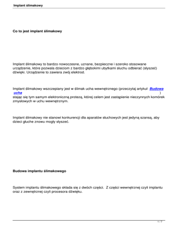 Implant ślimakowy Co to jest implant ślimakowy Implant ślimakowy to bardzo nowoczesne, uznane, bezpieczne i szeroko stosowane urządzenie, które pozwala dzieciom z bardzo głębokimi ubytkami słuchu odbierać (słyszeć) dźwięki. Urządzenie to zawiera zwój elektrod. Implant ślimakowy wszczepiany jest w ślimak ucha wewnętrznego (przeczytaj artykuł Budowa ucha ) stając się tym samym elektroniczną protezą, której celem jest zastąpienie nieczynnych komórek zmysłowych w uchu wewnętrznym. Implant ślimakowy nie stanowi konkurencji dla aparatów słuchowych jest jedyną szansą, aby dzieci głuche znowu mogły słyszeć. Budowa implantu ślimakowego System implantu ślimakowego składa się z dwóch części. Z części wewnętrznej czyli implantu oraz z zewnętrznej czyli procesora dźwięku. 1/7 Implant ślimakowy Część wewnętrzna Implant ślimakowy wykonany jest z biozgodnych materiałów np. z silikonu lub tytanu, podczas godzinnej operacji wszczepiany jest w ślimak ucha wewnętrznego. Najważniejsza część implantu czyli odbiornik/stymulator jest trwale i bezpiecznie mocowany pod skórą tuż za uchem. Z odbiornika stymulatora wychodzą przewody czyli nośniki elektrod wewnątrz ślimakowych. Ważna informacja: System implantu ślimakowego to rozwiązanie na całe życie dlatego ryzyko zepsucia odbiornika/stymulatora powinno być minimalne. Część zewnętrzna 2/7 Implant ślimakowy Część zewnętrzna czyli procesor mowy to element systemu odpowiedzialny za funkcjonowanie całego systemu na co dzień. Urządzenie to najczęściej noszone jest podobnie jak aparat słuchowy za uchem. Procesor mowy składa się z jednostki sterującej pracą całego systemu oraz z części odpowiedzialnej za kontrolę pracy i komunikację z użytkownikiem jak i ze specjalistami kliniczno-technicznymi. Procesor mowy (dźwięku) wyposażony jest również w cewkę nadawczą, która zapewnia komunikację z częścią wewnętrzną systemu oraz jej zasilanie. Procesor powianiem mieć możliwość zapisu kilku MAP – czyli programów pracy ustalonych indywidualnie przez specjalistów podczas sesji dopasowującej procesor mowy. Ważna informacja: Ponieważ procesor mowy jest noszony na co dzień bez względu na porę roku i pogodę powinien być odporny na uszkodzenia mechaniczne oraz na czynniki zewnętrzne. Zasilany powinien być łatwo dostępnymi bateriami lub najlepiej akumulatorami, które pozwolą zmniejszyć koszty użytkowania. Jak działa implant ślimakowy System implantu ślimakowego jako proteza narządu zmysłu – słuchu zastępuje wszystkie trzy elementy naszego ucha (ucho zewnętrzne, wewnętrzne i środkowe) przekazuje informacje 3/7 Implant ślimakowy akustyczne płynące z otoczenia bezpośrednio do nerwu słuchowego. W słyszeniu za pomocą implantu ślimakowego za odbiór dźwięków odpowiedzialny jest mikrofon (znajduje się on w górnej części procesora mowy tuż za uchem). Układ elektrod przetwarza ten dźwięk na sygnał cyfrowy. Sygnał ten podlega przekształceniom – usuwany jest niepotrzebny szum oraz następuje wzmocnienie w zakresie dźwięków mowy. Zastępuje w ten sposób nasze naturalne filtry jakimi są małżowina, kanał słuchowy oraz ucho środkowe. Tak przetworzony sygnał zostaje zamieniony przez procesor mowy na specjalny kod. Kod ten to parametry programu akustycznego, które określone zostały podczas indywidualnej sesji dopasowania procesora dźwięku przez specjalistę kliniczno-technicznego. Kod ten przesyłany jest za pomocą cewki nadawczej do części wewnętrznej systemu implantu ślimakowego. Cewka odbiorcza przekazuje kod do odbiornika/stymulatora, który na podstawie odebranych informacji odpowiednio steruje stymulację elektryczną na poszczególnych elektrodach wewnątrz ślimakowych. Każdej elektrodzie wewnątrz ślimaka przypisany jest odpowiedni zakres częstotliwości dźwięk i jeśli taka właśnie częstotliwość odbierana jest przez mikrofon to odpowiednia elektroda odpowiedzialna za przekazanie tej informacji stymuluje efektywnie nerw słuchowy. Stymulacja przekazywana jest przez nerw do wyższych elementów drogi słuchowej i w ten sposób powstaje wrażenie dźwięku. Dla kogo przeznaczony jest implant ślimakowy 4/7 Implant ślimakowy Implant ślimakowy przeznaczony jest dla dzieci dla których implant ślimakowy jest jedyną szansą na powrót do świata dźwięków. Dzieci te podzielić możemy na dwie grupy: 1. Noworodki, które urodziły się głuche (problem ten pomaga wykryć przesiewowe badanie słuchu) 2. Dzieci, które utraciły słuch w trakcie swojego życia ( z różnych przyczyn) Jak otrzymać implant ślimakowy Jeżeli uważasz, że najlepszym, dobrym rozwiązaniem dla twojego dziecka jest wszczepienie implantu ślimakowego – to jak najszybciej zgłoś się do ośrodka realizującego „Program leczenia głuchoty i głębokich niedosłuchów z wykorzystaniem implantu ślimakowego” (szczegółowe informacje o programie znajdziesz tutaj ) Program ten składa się z trzech etapów: - Kwalifikacja - Operacja - Opieka pooperacyjna 5/7 Implant ślimakowy Finansowanie implantów ślimakowych W Polsce leczenie głuchoty i głębokich niedosłuchów z użyciem implantów ślimakowych jest w pełni refundowane przez Narodowy Fundusz Zdrowia (NFZ). Użytkownik nie płaci za implant, nie ponosi również kosztów związanych z przygotowaniem do operacji, samą operację ani również za późniejszą rehabilitację. Jedyne koszty jakie związane są wyłącznie sz codziennym użytkowaniem implantu i obejmują np. zakup baterii. Poniższe zdjęcie przedstawia proces słyszenia z implantem ślimakowym 1. Mikrofon odbiera dźwięki 2. Odebrane przez mikrofon dźwięki – przetworzone zostają na kod elektryczny. 3. Kod elektryczny przesłany zostaje do cewki nadawczej. 4. Cewka nadawcza przesyła przez skórę sygnał do odbiornika/ stymulatora, który dekoduje sygnał i następnie zamienia go na impul