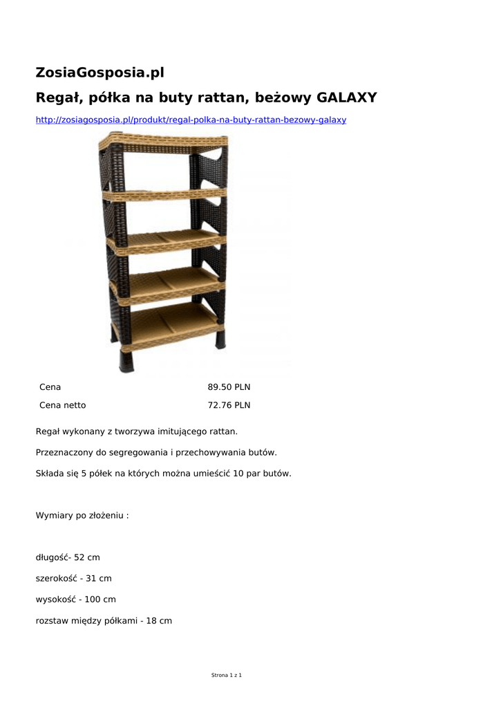 ZosiaGosposia.pl Regał, półka na buty rattan, beżowy GALAXY http://zosiagosposia.pl/produkt/regal-polka-na-buty-rattan-bezowy-galaxy Cena 89.50 PLN Cena netto 72.76 PLN Regał wykonany z tworzywa imitującego rattan. Przeznaczony do segregowania i przechowywania butów. Składa się 5 półek na których można umieścić 10 par butów. Wymiary po złożeniu : długość- 52 cm szerokość - 31 cm wysokość - 100 cm rozstaw między półkami - 18 cm Strona 1 z 1