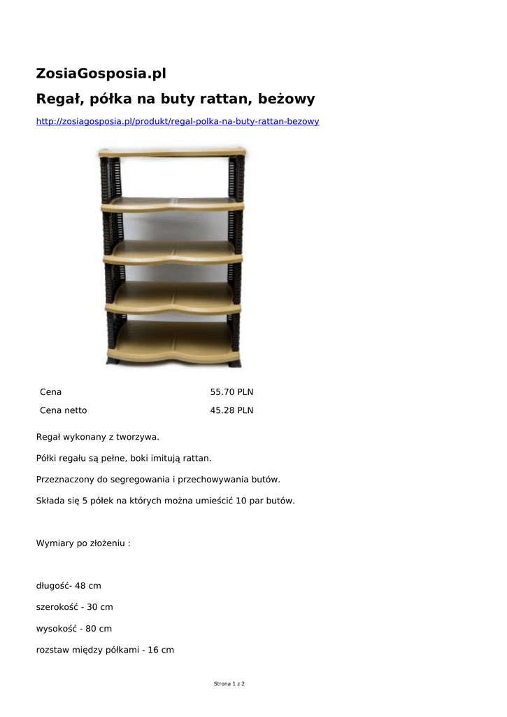 ZosiaGosposia.pl Regał, półka na buty rattan, beżowy http://zosiagosposia.pl/produkt/regal-polka-na-buty-rattan-bezowy Cena 55.70 PLN Cena netto 45.28 PLN Regał wykonany z tworzywa. Półki regału są pełne, boki imitują rattan. Przeznaczony do segregowania i przechowywania butów. Składa się 5 półek na których można umieścić 10 par butów. Wymiary po złożeniu : długość- 48 cm szerokość - 30 cm wysokość - 80 cm rozstaw między półkami - 16 cm Strona 1 z 2 Strona 2 z 2
