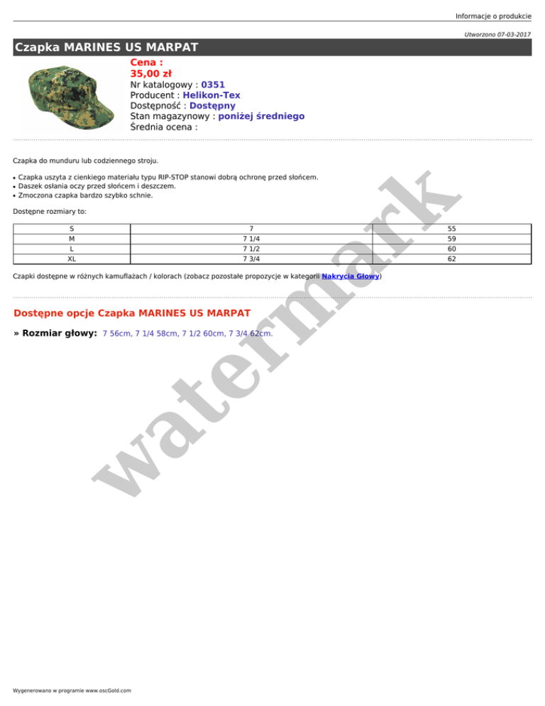 Informacje o produkcie Utworzono 07-03-2017 Czapka MARINES US MARPAT Cena : 35,00 zł Nr katalogowy : 0351 Producent : Helikon-Tex Dostępność : Dostępny Stan magazynowy : poniżej średniego Średnia ocena : Czapka do munduru lub codziennego stroju. ● ● Czapka uszyta z cienkiego materiału typu RIP-STOP stanowi dobrą ochronę przed słońcem. Daszek osłania oczy przed słońcem i deszczem. Zmoczona czapka bardzo szybko schnie. er m ar k ● Dostępne rozmiary to: S M L XL 7 7 1/4 7 1/2 7 3/4 Czapki dostępne w różnych kamuflażach / kolorach (zobacz pozostałe propozycje w kategorii Nakrycia Głowy) Dostępne opcje Czapka MARINES US MARPAT w at » Rozmiar głowy: 7 56cm, 7 1/4 58cm, 7 1/2 60cm, 7 3/4 62cm. Wygenerowano w programie www.oscGold.com 55 59 60 62