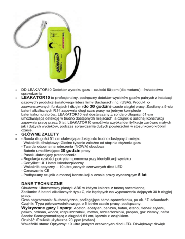 DD-LEAKATOR10 Detektor wycieku gazu - czu 50ppm (dla metanu) - wiadectwo sprawdzenia LEAKATOR10 to profesjonalny, podr czny detektor wycieków gazów palnych z instalacji gazowych produkcji wiatowego lidera firmy Bacharach Inc. (USA). Produkt o zaawansowanych funkcjach i d ugim (do 30 godzin) czasie ci ej pracy. Zasilany z 5-ciu baterii alkalicznych R14 zapewnia d ugi czas pracy na jednym komplecie baterii/akumulatorów. LEAKATOR10 jest dostarczany z sond o d ugo ci 51 cm umo liwiaj detekcj w trudno dost pnych miejscach, a czujnik o solidnej konstrukcji zapewnia prac przez 5 lat. LEAKATOR10 umo liwia szybk identyfikacj zarówno ma ych jak i du ych wycieków, podczas sprawdzania du ych powierzchni w stosunkowo krótkim czasie. ÓWNE ZALETY - Sonda d ugo ci 51 cm u atwiaj ca dost p do trudno dost pnych miejsc - Wska nik d wi kowy: G ne tykanie zale ne od stopnia st enia gazu - Twarda odporna na uderzenia (NOWA) obudowa - Baterie umo liwiaj ce 30 godzin pracy - Pasek u atwiaj cy przenoszenie - Regulacja czu ci pokr em pomocna przy identyfikacji wycieku - Certyfikat UL Listed Iskrobezpieczny - Wska nik optyczny – 10 ultra jasnych czerwonych diod LED - Oznaczenie CE - Pod czany czujnik o mocnej konstrukcji o czasie pracy wynosz cym 5 lat DANE TECHNICZNE Obudowa: Uformowany plastyk ABS w tym kolorze z ta naramienn . Zasilanie: 5 baterii alkalicznych typu C, nie b cych na wyposa eniu daj cych 30 h ci ej pracy. Czas nagrzewania: Automatyczne, podlegaj ce samo sprawdzeniu, po ok. 10 sekundach. Czujnik: Typu pó przewodnikowego, o 5 letnim czasie pracy, pod czany. Wykrywane gazy i opary: Aceton, acetylen, benzen, butan, etanol, tlenek etylenu, paliwo, heksan, wodór, rozpuszczalniki, metan, rozcie czalniki, propan, gaz ziemny, nafta Sonda: Samogromadz o d ugo ci 51 cm, cznie z czujnikiem. Czu : Czu u yteczna 20 ppm (metan). Wska niki stanu: Optyczny: 10 ultra jasnych czerwonych diod LED. D wi kowy: d wi k tykaj cy o zmiennej pr dko ci. W warunkach du ego ha asu mo liwo zastosowania uchawek. Zasilanie= zielona dioda LED, Awaria i niski stan na adowania baterii= te diody LED Warunki zewn trzne: -5 do 54 °C, wilgotno wzgl dna 10%-90%, bez kondensacji. Wymiary/ waga: Leakator: 21.6 cm x 5.7 cm x 4.4 cm / 05 kg . Obudowa:26.7 cm x 17.8 cm x 7.6 cm/0,5 kg Aprobaty: UL listed, iskrobezpieczny, Class l, Division 1, Grupa A, B, C, i D obszarów sklasyfikowanych Gwarancja: Ograniczona gwarancja 1 rok. Szczegó y w karcie gwarancyjnej DD-LEAKATORJR Detektor wycieku gazu - czu : dwa tryby 20ppm i 50ppm (dla metanu) Wykrywacz nieszczelno ci instalacji gazowych oraz wycieku paliw, rozpuszczalników oraz wykrywania oparów w glowodorów Wykrywane gazy i zwi zki z one: gaz naturalny i biogaz (metan), propan i butan, aceton, acetylen, benzen, etanol, tlenek etylenu, benzyna, heksan, wodór, rozpuszczalniki przemys owe, izobutan, metanol, terpentyna, nafta. Sonda elastyczna 30 cm Czujnik pó przewodnikowy Dwa tryby czu ci 20ppm i 50ppm (dla metanu) Automatyczna kalibracja Wizualna i d wi kowa sygnalizacja st enia gazu Sygnalizacja s abego zasilania Sygnalizacja b du/uszkodzenia czujnika Wykonanie iskro-bezpieczne, klasa 1; dzia 1; grupy A, B, C, D; atest UL 913 Zasilanie: 4 baterie 1,5V R6/AA Wymiary: 152x51x38mm Masa: <170g z="" bateriami="" li=""> W komplecie: baterie, mi kki futera , instrukcja obs ugi DD-LEAKATOR-R Detektor wycieku gazu i czynników ch odniczych Wykrywacz wycieku czynników ch odniczych oraz gazów i oparów palnych W komplecie (19-8038): niebieska i czerwona nasadka na czujnik, komplet baterii, instrukcja obs ugi, plastikowa walizka Wykrywane czynniki ch odnicze: wszystkie CFC, HCFC I HFC oraz R-12, R-22, R123, R-134a i mieszanki R-404A, R-408A, R-409A, R-410A (tj. ka dy czynnik ch odniczy zawieraj cy chlor, fluor lub brom) Czu dla czynników ch odniczych: 14g/rok dla R-134a (to najtrudniej wykrywany gaz ch odniczy) wykrywany przy ruchu czubka sondy w odleg sekund , w odleg ci 5cm przez 1 ci 3mm od ród a wycieku. W przypadku sta ego trzymania sondy nad ród em wycieku przez co najmniej 5 sekund mo liwe jest wykrycie wycieku wynosz cego 7g/rok. Wykrywane gazy palne: wszystkie gazy i opary palne Czu dla gazów palnych: 50ppm metanu Czas gotowo ci do pracy: 10 sekund Automatyczna regulacja czu ci wi kowa i wietlna sygnalizacja poziomu st Mo liwo enia gazu wyciszenia sygnalizacji d wi kowej Sygnalizacja s abego zasilania Sygnalizacja uszkodzenia czujnika Sonda o d ugo ci 508 mm, wbudowany czujnik, filtr oraz wska nik LED Czujnik czynników ch odniczych: dioda grzewcza, typowy czas ci ej pracy oko o 150 godzin tj. 1 rok typowej eksploatacji, atwo wymienialny Czujnik gazów palnych: pó przewodnikowy, typowy czas eksploatacji 5 lat, atwo wymienialny Czas gotowo ci do pracy: 10 sekund Pobór próbki gazu: 40...50cm3/min w zale no ci od czujnika Wymiary obudowy: 445x244x57mm Waga: 390g Warunki pracy: 0...+50°C, 15...90%RH (bez kondensacji) Zasilanie: 4 baterie 1,5V AA Dopuszczenia dla czynników ch odniczych: UL wyszczególnione zgodnie z SAE J1626 Dopuszczenia dla gazów palnych: certyfikowane laboratorium MET do UL913, bezpieczne do u ycia w klasie I, Division 1, Grupa D obszary niebezpieczne Posiada znak CE (niezale ne badania)