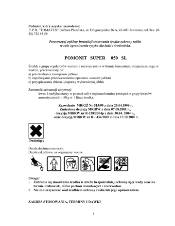 Podmiot, który uzyskał zezwolenie: P.P.H. "TOMATEX" Barbara Plesińska, ul. Długoszyńska 26 A, 43-603 Jaworzno; tel./fax: (032) 752 83 59 Przestrzegaj etykiety-instrukcji stosowania środka ochrony roślin w celu ograniczenia ryzyka dla ludzi i środowiska. POMONIT SUPER 050 SL Środek z grupy regulatorów wzrostu i rozwoju roślin w formie koncentratu rozpuszczalnego w wodzie, przeznaczony do: a) przerzedzania zawiązków jabłoni b) zapobiegania przedwczesnemu opadaniu owoców jabłoni c) przyspieszania zbioru i poprawy wybarwienia jabłek Zawartość substancji aktywnej: kwas 1-naftylooctowy w postaci soli z trójetanoloaminą (związek z grupy kwasów aromatycznych) - 50 g w 1 litrze środka. Zezwolenie MRiGŻ Nr 515/99 z dnia 20.04.1999 r. Zmienione decyzją MRiRW z dnia 07.08.2001 r., decyzją MRiRW nr R-218/2004p z dnia 30.04. 2004 r., oraz decyzją MRiRW nr R - 434/2007 z dnia 17.10.2007 r. Drażniący Działa drażniąco na oczy. Działa szkodliwie na organizmy wodne. Uwaga! 1. Zabrania się stosowania środka w strefie bezpośredniej ochrony ujęć wody oraz na terenie uzdrowisk, otulin parków narodowych i rezerwatów. 2. Nie zanieczyszczać wód środkiem ochrony roślin lub jego opakowaniem. ZAKRES STOSOWANIA, TERMINY I DAWKI 1 Jabłoń - przerzedzanie zawiązków Zalecane stężenie: 0,04% (40 ml środka w 100 l wody) lub 0,025% (25 ml w 100 l wody) + 52 ml środka Agrostym 480 SL. Zalecana ilość wody: 1000 l/ha w przypadku drzew o koronach wysokości 2 m 1500 l/ha w przypadku drzew o koronach wysokości 3 m średnio - 500 l/ha sadu na każdy metr wysokości korony drzewa. Stosowanie środka umożliwia uzyskanie większych i dorodniejszych owoców oraz regularne (coroczne) owocowanie. Opryskiwać po przekwitnięciu drzew dokładnie całą koronę drzewa: a) wczesne odmiany jabłoni - pod koniec opadania płatków, b) późne odmiany jabłoni - w 2-3 dni po opadnięciu minimum 80% płatków. Pod koniec czerwca dokonać ręcznej korekty i usunąć: nadmiar zawiązków, zawiązki odbiegające wielkością i kształtem, zawiązki z wnętrza korony o ograniczonym dostępie światła oraz zawiązki powstałe z kwiatów bocznych na długopędach. - zapobieganie przedwczesnemu opadaniu owoców Zalecane stężenie: 0,04% (40 ml środka w 100 l wody). Zalecana ilość wody: 1500 l/ha. Opryskiwać na 10 dni przed zbiorem owoców, najlepiej wcześnie rano, w czasie ciepłej pogody. W przypadku opóźnienia zbioru zabieg powtórzyć. - przyspieszanie zbioru i poprawa wybarwienia jabłek Zalecane stężenie: Pomonit Super 050 SL 0,04% (40 ml środka w 100 l cieczy użytkowej) + Agrostym 480 SL 0,12% (120 ml środka w 100 l cieczy użytkowej). Zalecana ilość wody: 500-700 l/ha. Opryskiwać na 7-10 dni przed zbiorem jabłek. UWAGA: 2 Środek stosować do 5 godzin przed spodziewanym deszczem. OKRES KARENCJI (okres od dnia ostatniego zabiegu do dnia zbioru roślin przeznaczonych do konsumpcji) - 7 dni OKRES PREWENCJI DLA LUDZI, PSZCZÓŁ I ZWIERZĄT (okres zapobiegający zatruciu) - nie dotyczy SPORZĄDZANIE CIECZY UŻYTKOWEJ Przed przystąpieniem do sporządzania cieczy użytkowej dokładnie ustalić potrzebną jej ilość. Odmierzoną ilość środka wlać do zbiornika opryskiwacza napełnionego wodą i dokładnie wymieszać. Stosując łącznie z środkiem Agrostym 480 SL odmierzoną jego ilość wlać do zbiornika opryskiwacza z przygotowaną cieczą użytkową środka Pomonit Super 050 SL i dokładnie wymieszać. Opróżnione opakowanie i miarkę przepłukać trzykrotnie wodą, a popłuczyny wlać do zbiornika opryskiwacza z cieczą użytkową. Po pracy aparaturę dokładnie wymyć. PRZECHOWYWANIE Chronić przed dziećmi. Nie przechowywać razem z żywnością, napojami i paszami dla zwierząt. Przechowywać wyłącznie w oryginalnym opakowaniu w temperaturze nie niższej niż 0oC i nie wyższej niż 30oC. Zamrożenie środka nie zmienia jego właściwości po rozmrożeniu. WARUNKI BEZIECZNEGO STOSOWANIA ŚRODKA OCHRONY ROŚLIN Nie jeść i nie pić oraz nie palić tytoniu podczas stosowania produktu. Zanieczyszczone oczy przemyć natychmiast dużą ilością wody i zasięgnąć porady lekarza. Natychmiast zdjąć całą zanieczyszczoną odzież. Zanieczyszczoną skórę natychmiast przemyć dokładnie bieżącą wodą, a następnie wodą zakwaszoną np. kilkoma kroplami soku cytrynowego na szklankę wody. 3 Nosić odpowiednią odzież ochronną i okulary lub ochronę twarzy. Resztki cieczy użytkowej rozcieńczyć wodą i wypryskać na powierzchni poprzednio opryskiwanej. Wodę użytą do mycia aparatury wypryskać na powierzchni uprzednio opryskiwanej, stosując te same środki ochrony osobistej. Opróżnione opakowania traktować jako odpady komunalne. Zabrania się spalania opakowań po środku ochrony roślin we własnym zakresie. UWAGA! ZABRANIA SIĘ WYKORZYSTYWANIA OPRÓŻNIONYCH OPAKOWAŃ PO ŚRODKACH OCHRONY ROŚLIN DO INNYCH CELÓW, W TYM TAKŻE TRAKTOWANIA ICH JAKO SUROWCE WTÓRNE. W przypadku awarii lub jeżeli źle się poczujesz, niezwłocznie zasięgnij porady lekarza – jeżeli to możliwe, pokaż etykietę. ANTIDOTUM: brak, stosować leczenie objawowe. Pomoc medyczna W zaistniałych sytuacjach, kiedy wymagana jest lub konieczna inna pomoc medyczna niż ujęta w wyżej wymienionych ostrzeżeniach skontaktować się z najbliższym ośrodkiem toksykologicznym: Gdańsk – (0-58)349-28-31 Kraków - (0-12)683-11-34 Lublin – (0-81)740-89-83 Łódź – (0-42)657-99-00 Poznań – (0-61)847-69-46 Rzeszów – (0-17)866-44-09 Sosnowiec – (0-32)266-11-45 Tarnów – (0-14)629-95-88 Warszawa – (0-22)619-66-54 Wrocław – (0-71)343-30-08 Okres ważności - 2 lata Data produkcji - ........ Zawartość netto - ........ Nr partii - ........ 4