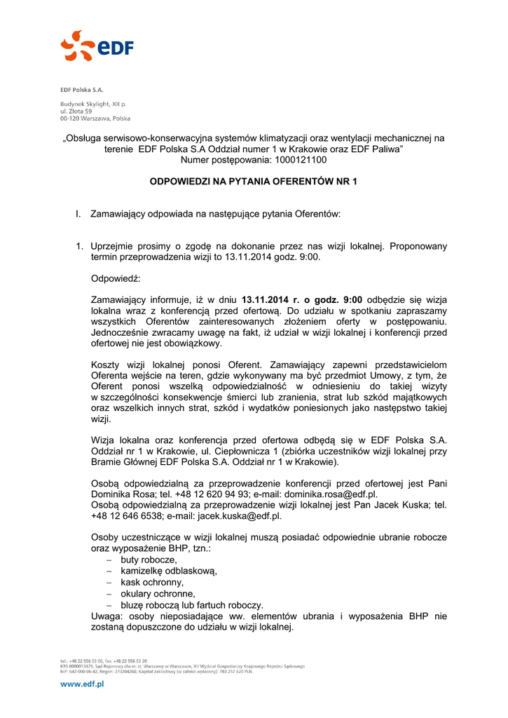 „Obsługa serwisowo-konserwacyjna systemów klimatyzacji oraz wentylacji mechanicznej na terenie EDF Polska S.A Oddział numer 1 w Krakowie oraz EDF Paliwa” Numer postępowania: 1000121100 ODPOWIEDZI NA PYTANIA OFERENTÓW NR 1 I. Zamawiający odpowiada na następujące pytania Oferentów: 1. Uprzejmie prosimy o zgodę na dokonanie przez nas wizji lokalnej. Proponowany termin przeprowadzenia wizji to 13.11.2014 godz. 9:00. Odpowiedź: Zamawiający informuje, iż w dniu 13.11.2014 r. o godz. 9:00 odbędzie się wizja lokalna wraz z konferencją przed ofertową. Do udziału w spotkaniu zapraszamy wszystkich Oferentów zainteresowanych złożeniem oferty w postępowaniu. Jednocześnie zwracamy uwagę na fakt, iż udział w wizji lokalnej i konferencji przed ofertowej nie jest obowiązkowy. Koszty wizji lokalnej ponosi Oferent. Zamawiający zapewni przedstawicielom Oferenta wejście na teren, gdzie wykonywany ma być przedmiot Umowy, z tym, że Oferent ponosi wszelką odpowiedzialność w odniesieniu do takiej wizyty w szczególności konsekwencje śmierci lub zranienia, strat lub szkód majątkowych oraz wszelkich innych strat, szkód i wydatków poniesionych jako następstwo takiej wizji. Wizja lokalna oraz konferencja przed ofertowa odbędą się w EDF Polska S.A. Oddział nr 1 w Krakowie, ul. Ciepłownicza 1 (zbiórka uczestników wizji lokalnej przy Bramie Głównej EDF Polska S.A. Oddział nr 1 w Krakowie). Osobą odpowiedzialną za przeprowadzenie konferencji przed ofertowej jest Pani Dominika Rosa; tel. +48 12 620 94 93; e-mail: [email protected]. Osobą odpowiedzialną za przeprowadzenie wizji lokalnej jest Pan Jacek Kuska; tel. +48 12 646 6538; e-mail: [email protected]. Osoby uczestniczące w wizji lokalnej muszą posiadać odpowiednie ubranie robocze oraz wyposażenie BHP, tzn.: buty robocze, kamizelkę odblaskową, kask ochronny, okulary ochronne, bluzę roboczą lub fartuch roboczy. Uwaga: osoby nieposiadające ww. elementów ubrania i wyposażenia BHP nie zostaną dopuszczone do udziału w wizji lokalnej. W miarę możliwości prosimy o uprzednie zadeklarowanie chęci wzięcia udziału w spotkaniu wraz z podaniem informacji o przewidywanej liczbie osób , które będą w nim uczestniczyć z Państwa strony.”. II. Zamawiający dokonuje zmiany Specyfikacji Istotnych Warunków Zamówienia w następującym zakresie: Punkt 12 rozdziału I SIWZ (Instrukcji dla Oferentów) otrzymuje nowe brzmienie, tj.: „12.1. Kryterium oceny Ofert: a) Cena – znaczenie 100% 12.2. Sposób oceny Ofert: a) w kryterium cena wg wzoru: Pc = [Cmin/Co] x 100 x W% gdzie: Pc – liczba punktów przyznanych ocenianej ofercie w kryterium cena Cmin – najniższa szacunkowa cena netto zaoferowana w postepowaniu (wartość wskazana w wierszu „Kwota łączna (ofertowa)” Załącznika cenowego – cena oferty) Co – szacunkowa cena netto rozpatrywanej oferty (wartość wskazana w wierszu „Kwota łączna (ofertowa)” Załącznika cenowego – cena oferty) W – waga kryterium Łączną ilość przyznanych punktów stanowi liczba punktów w kryterium „Cena”. Oferta, która otrzyma największą ilość punktów w kryterium „Cena”, będzie Ofertą najkorzystniejszą.”.