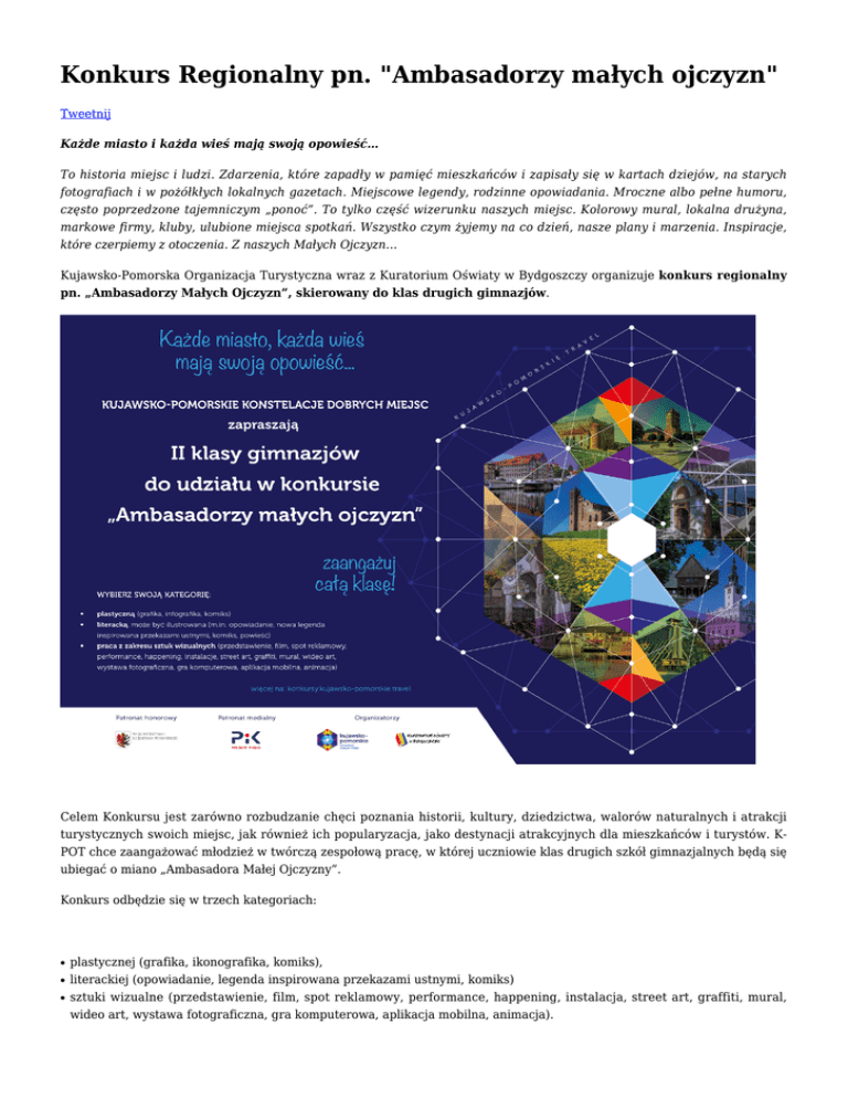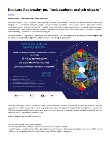 Konkurs Regionalny pn. "Ambasadorzy małych ojczyzn" Tweetnij Każde miasto i każda wieś mają swoją opowieść… To historia miejsc i ludzi. Zdarzenia, które zapadły w pamięć mieszkańców i zapisały się w kartach dziejów, na starych fotografiach i w pożółkłych lokalnych gazetach. Miejscowe legendy, rodzinne opowiadania. Mroczne albo pełne humoru, często poprzedzone tajemniczym „ponoć”. To tylko część wizerunku naszych miejsc. Kolorowy mural, lokalna drużyna, markowe firmy, kluby, ulubione miejsca spotkań. Wszystko czym żyjemy na co dzień, nasze plany i marzenia. Inspiracje, które czerpiemy z otoczenia. Z naszych Małych Ojczyzn… Kujawsko-Pomorska Organizacja Turystyczna wraz z Kuratorium Oświaty w Bydgoszczy organizuje konkurs regionalny pn. „Ambasadorzy Małych Ojczyzn”, skierowany do klas drugich gimnazjów. Celem Konkursu jest zarówno rozbudzanie chęci poznania historii, kultury, dziedzictwa, walorów naturalnych i atrakcji turystycznych swoich miejsc, jak również ich popularyzacja, jako destynacji atrakcyjnych dla mieszkańców i turystów. KPOT chce zaangażować młodzież w twórczą zespołową pracę, w której uczniowie klas drugich szkół gimnazjalnych będą się ubiegać o miano „Ambasadora Małej Ojczyzny”. Konkurs odbędzie się w trzech kategoriach: ● ● ● plastycznej (grafika, ikonografika, komiks), literackiej (opowiadanie, legenda inspirowana przekazami ustnymi, komiks) sztuki wizualne (przedstawienie, film, spot reklamowy, performance, happening, instalacja, street art, graffiti, mural, wideo art, wystawa fotograficzna, gra komputerowa, aplikacja mobilna, animacja). Zwycięskie klasy nagrodzimy wycieczką do atrakcyjnych turystycznie miejsc regionu. Uroczyste wręczenie voucherów nastąpi podczas jednego z wydarzeń inaugurujących Sezon Turystyczny 2017. Więcej na: http://konkursy.kujawsko-pomorskie.travel Data 15/02/2017