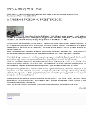 SZKOŁA POLICJI W SŁUPSKU Źródło: http://www.slupsk.szkolapolicji.gov.pl/sps/aktualnosci/70201,W-tandemie-przeciwko-przestepczosci.html Wygenerowano: Wtorek, 7 marca 2017, 17:48 W TANDEMIE PRZECIWKO PRZESTĘPCZOŚCI Przedstawiciele słupskiej Szkoły Policji dzielą się swoją wiedzą w ramach unijnego projektu „W tandemie przeciwko przestępczości przygranicznej”. Szkolenie niemieckich i polskich policjantów prowadzone jest w brandenburskiej Dyrekcji Policji Wschód we Frankfurcie nad Odrą. Celem kształcenia jest między innymi zaznajomienie się z właściwymi dla danego kraju przepisami prawnymi i bazującymi na nich działaniami policyjno-taktycznymi. Uczestniczący w szkoleniu policjanci podnoszą swoje kwalifikacje językowe w zakresie słownictwa policyjnego poprzez naukę języka i ćwiczenia praktyczne. Policjanci uczestniczą również w symulacjach interwencji policyjnych. Jednym z punktów szkolenia jest również, omówienie polsko-niemieckiej Umowy o współpracy Policji z dnia 15 maja 2014 roku oraz wspólnych zawartych między polskimi i niemieckimi garnizonami Policji umów i porozumień o współpracy. W każdej edycji tego rodzaju szkoleń udział biorą wykładowcy słupskiej Szkoły Policji. Ostatnie wykłady dla niemieckich funkcjonariuszy służb mundurowych przeprowadziła asp. Anna Synak z Zakładu Prewencji i Ruchu Drogowego. Policjantka przedstawiła zagadnienia polskiego prawa policyjnego dotyczącego prewencji, w tym między innymi legitymowania, kontroli osobistej, zatrzymania osoby, przeprowadzania interwencji wobec osób znajdujących się pod wpływem alkoholu lub środka działającego podobnie do alkoholu, a także sposobu organizacji służby patrolowej. W kolejnym cyklu wykładów nasza przedstawicielka omówiła zagadnienia dotyczące prawa ruchu drogowego, w tym kompetencje podmiotów policyjnych, uprawnienia i obowiązki policjanta ruchu drogowego, a także zakazy dotyczące policjanta pełniącego służbę na drodze, przypadki zatrzymywania dokumentów uprawniających do kierowania pojazdem (prawo jazdy) oraz dowodu rejestracyjnego. Polscy i niemieccy policjanci mają możliwość praktyki w jednostkach Policji kraju partnera w celu zapoznania sposobu pełnienia służby po obu stronach granicy oraz utrwalenia wiedzy językowej. Dodatkowo w zajęciach uczestniczą także funkcjonariusze Straży Granicznej oby krajów. Kolejna edycja unijnych kursów z tego zakresu, z udziałem słupskich wykładowców, planowana jest na wrzesień. (17.3.2016) Ocena: 0/5 (0) Tweetnij