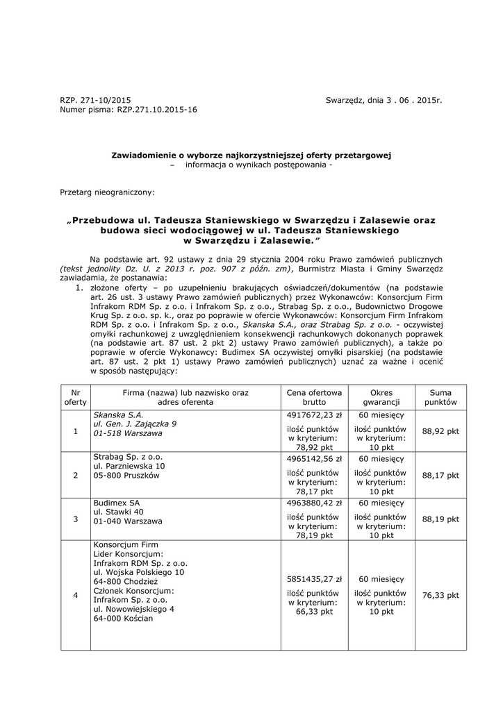 RZP. 271-10/2015 Numer pisma: RZP.271.10.2015-16 Swarzędz, dnia 3 . 06 . 2015r. Zawiadomienie o wyborze najkorzystniejszej oferty przetargowej – informacja o wynikach postępowania Przetarg nieograniczony: „ Przebudowa ul. Tadeusza Staniewskiego w Swarzędzu i Zalasewie oraz budowa sieci wodociągowej w ul. Tadeusza Staniewskiego w Swarzędzu i Zalasewie. ” Na podstawie art. 92 ustawy z dnia 29 stycznia 2004 roku Prawo zamówień publicznych (tekst jednolity Dz. U. z 2013 r. poz. 907 z późn. zm), Burmistrz Miasta i Gminy Swarzędz zawiadamia, że postanawia: 1. złożone oferty – po uzupełnieniu brakujących oświadczeń/dokumentów (na podstawie art. 26 ust. 3 ustawy Prawo zamówień publicznych) przez Wykonawców: Konsorcjum Firm Infrakom RDM Sp. z o.o. i Infrakom Sp. z o.o., Strabag Sp. z o.o., Budownictwo Drogowe Krug Sp. z o.o. sp. k., oraz po poprawie w ofercie Wykonawców: Konsorcjum Firm Infrakom RDM Sp. z o.o. i Infrakom Sp. z o.o., Skanska S.A., oraz Strabag Sp. z o.o. - oczywistej omyłki rachunkowej z uwzględnieniem konsekwencji rachunkowych dokonanych poprawek (na podstawie art. 87 ust. 2 pkt 2) ustawy Prawo zamówień publicznych), a także po poprawie w ofercie Wykonawcy: Budimex SA oczywistej omyłki pisarskiej (na podstawie art. 87 ust. 2 pkt 1) ustawy Prawo zamówień publicznych) uznać za ważne i ocenić w sposób następujący: Nr oferty Firma (nazwa) lub nazwisko oraz adres oferenta 1 Skanska S.A. ul. Gen. J. Zajączka 9 01-518 Warszawa 2 Strabag Sp. z o.o. ul. Parzniewska 10 05-800 Pruszków 3 Budimex SA ul. Stawki 40 01-040 Warszawa 4 Konsorcjum Firm Lider Konsorcjum: Infrakom RDM Sp. z o.o. ul. Wojska Polskiego 10 64-800 Chodzież Członek Konsorcjum: Infrakom Sp. z o.o. ul. Nowowiejskiego 4 64-000 Kościan Cena ofertowa brutto Okres gwarancji Suma punktów 4917672,23 zł 60 miesięcy ilość punktów w kryterium: 78,92 pkt 4965142,56 zł ilość punktów w kryterium: 10 pkt 60 miesięcy 88,92 pkt ilość punktów w kryterium: 78,17 pkt 4963880,42 zł ilość punktów w kryterium: 10 pkt 60 miesięcy 88,17 pkt ilość punktów w kryterium: 78,19 pkt ilość punktów w kryterium: 10 pkt 88,19 pkt 5851435,27 zł 60 miesięcy ilość punktów w kryterium: 66,33 pkt ilość punktów w kryterium: 10 pkt 76,33 pkt 5 Budownictwo Drogowe Krug Sp. z o.o. sp. k. ul. Świerkowa 48 62-020 Rabowice 4312394,32 zł 60 miesięcy ilość punktów w kryterium: 90 pkt ilość punktów w kryterium: 10 pkt 100 pkt 2. Oferta nr 5 - Wykonawcy: Budownictwo Drogowe Krug Sp. z o.o. sp. k., ul. Świerkowa 48, 62-020 Rabowice jest najkorzystniejszą i ważną – niepodlegającą odrzuceniu - ofertą przetargową złożoną w przedmiotowym postępowaniu. Oferta przetargowa Wykonawcy uzyskała maksymalną i najwyższą ilość punktów w kryteriach oceny ofert określonych w treści SIWZ: najniższa cena – 90,00 punktów, okres gwarancji – 10 punktów. W sumie w obu kryteriach oferta Wykonawcy uzyskała 100 punktów. Wartość oferty mieści się w kwocie jaką zamawiający zamierza i może przeznaczyć na sfinansowanie zamówienia. 3. Zamawiający zamierza zawrzeć umowę w sprawie wykonania przedmiotowego zamówienia w dniu 15 . 06 . 2015 roku.