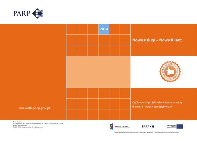 2014 Nowe usługi – Nowy Klient Ogólnopolski projekt szkoleniowo-doradczy www.dk.parp.gov.pl Biuro Projektu ul. Marynarska 15 (3 piętro), 02-674 Warszawa, tel.: 22 492 71 01, fax: 22 492 71 13 e-mail: [email protected] Projekt „MMP dostawcą usług dla osób starszych” dla mikro i małych przedsiębiorstw Założenia projektu Na przestrzeni zbliżających się lat będzie potrzeba stworzenia większej ilości usług dla osób starszych, zwłaszcza dla osób po 60 roku życia, niż na przykład dla dzieci czy młodzieży. Spowodowane jest to drastycznie starzejącym się społeczeństwem nie tylko w Polsce lecz w skali globalnej. Według badań przeprowadzonych przez międzynarodowych ekspertów, w przeciągu najbliższych 10-20 lat zwiększy się liczba osób w wieku 60+ o 1-1,5 mld na całym świecie, z czego w Polsce o około 6,2 – 7,3 mln. Projekt szkoleniowo-doradczy „MMP dostawcą usług dla osób starszych” ma za zadanie: zwiększyć świadomość konieczności stworzenia profesjonalnych usług dedykowanych osobom starszym, określić rodzaje usług potrzebnych dla seniorów, stworzyć profil dojrzałego klienta, wspomóc przedsiębiorców w stworzeniu usług dla osób starszych poprzez zaplanowanie dla nich indywidualnej ścieżki rozwoju, która doprowadzi do możliwości świadczenia danej usługi. Dla kogo jest przeznaczony projekt? Projekt stworzony jest dla firm z sektora mikro i małych przedsiębiorstw, posiadających potencjał do świadczenia usług dla osób starszych, zainteresowanych rozszerzeniem swojej oferty poprzez uruchomienie takich usług. Gotowych do przejścia przez ścieżkę zaplanowaną dla nich w indywidualnym planie rozwoju. Działaniami szkoleniowo – doradczymi zostanie objętych ponad 300 firm ze wszystkich województw w Polsce. Dlaczego warto zgłosić firmę do projektu? Korzyści dla firmy: zdobędziesz nowych klientów, dzięki poszerzeniu pakietu usług, otrzymasz profesjonalny plan rozwoju firmy, mający na celu uruchomienie nowych usług lub dopracowanie istniejących, skorzystasz z indywidualnie dobranych szkoleń i usług doradczych, zostaniesz objęty wsparciem doradczym podczas procesu uruchamiania usług, wzmocnisz wizerunek swojego przedsiębiorstwa oferując dodatkowe usługi osobom dojrzałym, dowiesz się jaki jest profil dojrzałego klienta i jakie masz możliwości stworzenia oferty pod tym kątem w swojej branży. Jakie firmy mogą wziąć udział w projekcie? Przystąpić do projektu mogą mikro i małe firmy spełniające następujące warunki: posiadające siedzibę na terenie Polski, zatrudniające pracowników (wykluczone są osoby samozatrudnione), posiadające potencjał do realizacji usług skierowanych do osób starszych określonych w„kwestionariuszu potencjału”, mogące oddelegować do usługi 4 osoby, z czego co najmniej 2 będą z kadry zarządzającej mającej wpływ na decyzje w firmie. Jak skorzystać z projektu? Przedsiębiorcy, którzy wezmą udział w projekcie, zyskają wsparcie ze strony profesjonalnego zespołu doradców, z pomocą których zostanie opracowany dla nich plan rozwoju, dzięki któremu będą mogli podjąć działania zmierzające do uruchomienia nowych, wysokiej jakości usług skierowanych dla seniorów lub udoskonalić istniejące. Firmę można zgłosić do projektu poprzez wypełnienie elektronicznego formularza aplikacyjnego na stronie www.dk.parp.gov.pl Po stwierdzeniu wstępnej kwalifikowalności na podstawie formularza aplikacyjnego, przedsiębiorca zostanie poddany następnie ocenie formalnej i merytorycznej. Po pozytywnym przejściu weryfikacji będzie podpisana umowa wsparcia z zakwalifikowanymi przedsiębiorcami. W ramach projektu firmy zostaną objęte między innymi szkoleniami i doradztwem określonymi dla nich indywidualnie w opracowanym planie rozwoju, a także wsparciem doradczym podczas uruchamiania usług skierowanych do dojrzałych klientów. Zasady finansowania Wszystkie działania oferowane przedsiębiorcom w ramach projektu „MMP dostawcą usług dla osób starszych” są bezpłatne. (stanowią pomoc publiczną de minimis dla przedsiębiorstw) Aplikuj do projektu www.dk.parp.gov.pl
