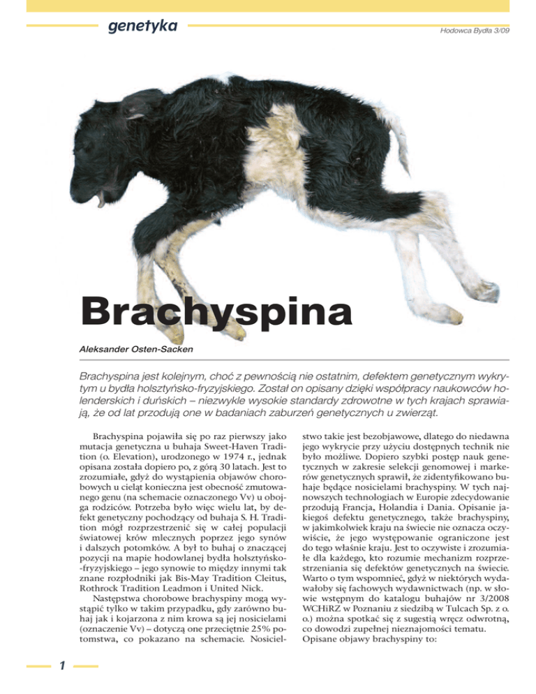 genetyka Hodowca Bydła 3/09 Brachyspina Aleksander Osten-Sacken Brachyspina jest kolejnym, choć z pewnością nie ostatnim, defektem genetycznym wykrytym u bydła holsztyńsko-fryzyjskiego. Został on opisany dzięki współpracy naukowców holenderskich i duńskich – niezwykle wysokie standardy zdrowotne w tych krajach sprawiają, że od lat przodują one w badaniach zaburzeń genetycznych u zwierząt. Brachyspina pojawiła się po raz pierwszy jako mutacja genetyczna u buhaja Sweet-Haven Tradition (o. Elevation), urodzonego w 1974 r., jednak opisana została dopiero po, z górą 30 latach. Jest to zrozumiałe, gdyż do wystąpienia objawów chorobowych u cieląt konieczna jest obecność zmutowanego genu (na schemacie oznaczonego Vv) u obojga rodziców. Potrzeba było więc wielu lat, by defekt genetyczny pochodzący od buhaja S. H. Tradition mógł rozprzestrzenić się w całej populacji światowej krów mlecznych poprzez jego synów i dalszych potomków. A był to buhaj o znaczącej pozycji na mapie hodowlanej bydła holsztyńsko-fryzyjskiego – jego synowie to między innymi tak znane rozpłodniki jak Bis-May Tradition Cleitus, Rothrock Tradition Leadmon i United Nick. Następstwa chorobowe brachyspiny mogą wystąpić tylko w takim przypadku, gdy zarówno buhaj jak i kojarzona z nim krowa są jej nosicielami (oznaczenie Vv) – dotyczą one przeciętnie 25% potomstwa, co pokazano na schemacie. Nosiciel- 1 stwo takie jest bezobjawowe, dlatego do niedawna jego wykrycie przy użyciu dostępnych technik nie było możliwe. Dopiero szybki postęp nauk genetycznych w zakresie selekcji genomowej i markerów genetycznych sprawił, że zidentyfikowano buhaje będące nosicielami brachyspiny. W tych najnowszych technologiach w Europie zdecydowanie przodują Francja, Holandia i Dania. Opisanie jakiegoś defektu genetycznego, także brachyspiny, w jakimkolwiek kraju na świecie nie oznacza oczywiście, że jego występowanie ograniczone jest do tego właśnie kraju. Jest to oczywiste i zrozumiałe dla każdego, kto rozumie mechanizm rozprzestrzeniania się defektów genetycznych na świecie. Warto o tym wspomnieć, gdyż w niektórych wydawałoby się fachowych wydawnictwach (np. w słowie wstępnym do katalogu buhajów nr 3/2008 WCHiRZ w Poznaniu z siedzibą w Tulcach Sp. z o. o.) można spotkać się z sugestią wręcz odwrotną, co dowodzi zupełnej nieznajomości tematu. Opisane objawy brachyspiny to: Hodowca Bydła 3/09 Schemat przedstawia sposób dziedziczenia defektów genetycznych – do wystąpienia objawów chorobowych konieczna jest obecność zmutowanego genu u obojga rodziców. Cielę oznaczone VV jest zdrowe, cielęta Vv to bezobjawowi nosiciele defektu, który rozprzestrzenia się właśnie za ich pośrednictwem; cielę oznaczone vv jest chore – zmutowany gen występuje u niego w formie homozygoty genetyka – poronienia występujące u 0,16% krów w populacji; – martwe urodzenia cieląt, kończące normalnie przebiegającą ciążę; – skrócony kręgosłup, wydłużone kończyny; – niedorozwój narządów wewnętrznych (nerki, serce); – bardzo niska waga urodzeniowa cieląt. Światowa Federacja Bydła Holsztyńsko-Fryzyjskiego (WHFF) dla oznaczenia nosicieli tego defektu genetycznego przyjęła skrót BY, tym samym wprowadzając go do oficjalnej i obowiązującej nomenklatury oznaczeń. Można się więc spodziewać, że oznaczenie to niedługo zacznie pojawiać się w katalogach buhajów. Coraz częstsze pojawianie się niekorzystnych objawów defektów genetycznych w stadach krów holsztyńsko-fryzyjskich jest m.in. skutkiem wzrastającego inbredu (spokrewnienia) wewnątrz całej światowej populacji bydła tej rasy. Szacuje się, że wzrost ten postępuje z szybkością co najmniej 0,1% rocznie, a w niektórych krajach (np. USA, Kanada) przekroczył już alarmową granicę 5%. Daje to poważne podstawy do zastanowienia się, w jakim kierunku powinny zmierzać w niedalekiej już przyszłości chów i hodowla bydła mlecznego. Może bowiem okazać się, że kurczowe trzymanie się jedynej słusznej rasy Hf nie wszystkim przyniesie oczekiwane i dobre efekty. Dotyczy to zwłaszcza stad, które z różnych względów nie są przygotowane do utrzymywania krów wydajnych, ale bardzo wrażliwych na niekorzystne działanie środowiska. 2