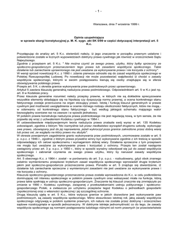 -1- Warszawa, dnia 7 września 1999 r. Opinia uzupełniająca w sprawie skargi konstytucyjnej p. M. K. sygn. akt SK 5/99 w części dotyczącej interpretacji art. 5 K.c. Przystępując do analizy art. 5 K.c. stwierdzić należy, iż jego znaczenie w porządku prawnym ustalone i potwierdzone zostało w licznych wypowiedziach doktryny prawa cywilnego jak również w orzecznictwie Sądu Najwyższego. Zgodnie z przepisem art. 5 K.c. " Nie można czynić ze swego prawa, użytku, który byłby sprzeczny ze społeczno-gospodarczym przeznaczeniem tego prawa lub zasadami współżycia społecznego. Takie działanie lub zaniechanie uprawnionego nie jest uważane za wykonywanie prawa i nie korzysta z ochrony". W wersji sprzed nowelizacji K.c. z 1990 r. zdanie pierwsze odnosiło się do zasad współżycia społecznego w Polskiej Rzeczpospolitej Ludowej. Po nowelizacji nie może pozostawiać wątpliwości iż chodzi o zasady współżycia społecznego, którymi w swoim postępowaniu kierują się osoby znajdujące się w sferze obowiązywania polskiego prawa. Przepis art. 5 K. c określa granice wykonywania praw podmiotowych przez uprawnionego. Artykuł 5 zawiera klauzulę generalną nadużycia prawa podmiotowego. Odpowiednikiem art. 5 w K.c jest np. art. 8 w Kodeksie pracy. Przez klauzule generalne rozumieć należy przepisy prawne, w których nie są dokładnie sprecyzowane wszystkie elementy składające się na hipotezę czy dyspozycję normy prawnej, a ocena konkretnego stanu faktycznego zostaje przerzucona na organ stosujący prawo. Istotą i funkcją klauzul generalnych w prawie cywilnym jest możliwość uwzględnienia w ocenie różnego rodzaju okoliczności faktycznych, które nie mogą w oderwaniu od konkretnego stanu faktycznego - być według jakiegoś schematu mającego walor bezwzględny oceniane raz na zawsze i w sposób jednakowy. W polskim prawie konstrukcja nadużycia prawa podmiotowego nie jest regulacją nową, w tym sensie, że nie pojawiła się wraz z uchwaleniem Kodeksu cywilnego w 1964 r. W ustawodawstwie międzywojennym teoria nadużycia prawa znalazła swój wyraz w art. 135 Kodeksu zobowiązań, zgodnie z którym "kto rozmyślnie lub przez niedbalstwo wyrządził drugiemu szkodę, wykonując swe prawo, obowiązany jest do jej naprawienia, jeżeli wykroczył poza granice zakreślone przez dobrą wiarę lub przez cel, ze względu na który prawo mu służyło". W okresie powojennym zagadnienie granic wykonywania praw podmiotowych, unormowane zostało w art. 5 p. o.p.c. z 1946 r., zgodnie z którym prawa prywatne winny być wykonywane zgodnie z ich treścią w sposób odpowiadający ich celowi społecznemu i wymaganiom dobrej wiary. Działania sprzeczne z tym przepisem nie mogły być uważane za wykonywanie prawa i korzystać z ochrony. Przepis ten został następnie zastąpiony przez art. 3 p. o.p.c. z 1950 r., który w sposób wyraźny odwoływał się już do zasad współżycia społecznego i zabraniał czynienia ze swego prawa użytku, który by naruszał zasady współżycia społecznego. Art. 5 obecnego K.c. z 1964 r. został - w porównaniu do art. 3 p. o.p.c. - rozbudowany, gdyż obok znanego ostatnio wymienionemu przepisowi kryterium zasad współżycia społecznego wprowadził drugie kryterium jakim jest społeczno-gospodarcze przeznaczenie prawa. Ponadto w art. 5 znajduje się stwierdzenie, iż działanie lub zaniechanie sprzeczne z wymienionymi zasadami nie jest uważane za wykonywanie prawa i nie korzysta z ochrony. Klauzula społeczno-gospodarczego przeznaczenia prawa została wprowadzona do K.c. w celu podkreślenia dominującej roli interesu społecznego w polskim prawie cywilnym oraz wskazywać miała na funkcje, którą prawa takie spełniają w ustroju społeczno-gospodarczym. Znaczenie tej klauzuli znacznie się zmniejszyło po zmianie w 1990 r. Kodeksu cywilnego, związanej z przekształceniami ustroju politycznego i społecznogospodarczego Polski, a zwłaszcza po uchyleniu przepisów tegoż Kodeksu o jednostkach gospodarki uspołecznionej oraz o własności społecznej i jej szczególnej ochronie. Drugą klauzulą ujętą w art. 5 K.c., która wytycza granice w jakich dozwolone jest wykonywanie paw podmiotowych, są zasady współżycia społecznego. Mimo stosunkowo istotnej roli, jaką zasady współżycia społecznego odgrywają w polskim systemie prawnym, ich natura nie została przez doktrynę i orzecznictwo sądowe rozstrzygnięta w sposób jednoznaczny. W doktrynie istnieje jednomyślność co do tego, że zasady współżycia społecznego są normami postępowania ludzkiego różnymi od norm prawnych (w przeciwieństwie do norm prawnych nie są zaopatrzone w przymus państwowy). Brak jest natomiast w doktrynie jednomyślności jeśli chodzi o stosunek zasad współżycia społecznego do norm pozaprawnych. Odnosi się to zwłaszcza do norm moralnych. Przeważa pogląd, iż zasady współżycia społecznego powiązane są z normami moralnymi (spory dotyczą sposobu powiązania tych zasad z normami moralnymi). Rozważając treść i znaczenie art. 5 K.c. należy mieć na uwadze, iż skatalogowanie zasad współżycia społecznego nie jest możliwe. Wynika to z dynamicznego rozwoju społeczeństwa, a tym samym ewolucji zasad moralnych, obyczajowych itp. Pamiętać jednocześnie należy, iż w art. 5 K.c. chodzi o takie zasady współżycia społecznego, które nie zostały ujęte w konkretny przepis prawny. Gdyby bowiem uprawniony podmiot korzystający z przysługującego mu prawa naruszył konkretna zasadę współżycia społecznego, która byłaby zarazem przepisem prawnym, to postępowanie takie byłoby sprzeczne z tym przepisem i już z tego powodu nie mogłoby korzystać z ochrony prawnej. Istota klauzuli zasad współżycia społecznego, zamieszczonej w art. 5 polega przede wszystkim na tym, że przepis ten zabrania czynienia użytku ze swego prawa wówczas, gdy to narusza zasady współżycia społecznego nie będące normami prawnymi, alb